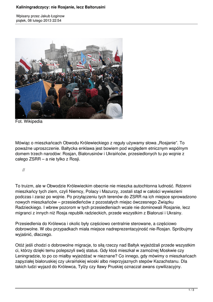 Kaliningradczycy: nie Rosjanie, lecz Baltorusini Wpisany przez Jakub Łoginow piątek, 08 lutego 2013 22:54 Fot. Wikipedia Mówiąc o mieszkańcach Obwodu Królewieckiego z reguły używamy słowa „Rosjanie”. To poważne uproszczenie. Bałtycka enklawa jest bowiem pod względem etnicznym wspólnym domem trzech narodów: Rosjan, Białorusinów i Ukraińców, przesiedlonych tu po wojnie z całego ZSRR – a nie tylko z Rosji. // To truizm, ale w Obwodzie Królewieckim obecnie nie mieszka autochtonna ludność. Rdzenni mieszkańcy tych ziem, czyli Niemcy, Polacy i Mazurzy, zostali stąd w całości wywiezieni podczas i zaraz po wojnie. Po przyłączeniu tych terenów do ZSRR na ich miejsce sprowadzono nowych mieszkańców – przesiedleńców z pozostałych miejsc ówczesnego Związku Radzieckiego. I wbrew pozorom w tych przesiedleniach wcale nie dominowali Rosjanie, lecz migranci z innych niż Rosja republik radzieckich, przede wszystkim z Białorusi i Ukrainy. Przesiedlenia do Królewca i okolic były częściowo centralnie sterowane, a częściowo dobrowolne. W obu przypadkach miała miejsce nadreprezentacyjność nie-Rosjan. Spróbujmy wyjaśnić, dlaczego. Otóż jeśli chodzi o dobrowolne migracje, to siłą rzeczy nad Bałtyk wyjeżdżali przede wszystkim ci, którzy dzięki temu polepszyli swój status. Gdy ktoś mieszkał w zamożnej Moskwie czy Leningradzie, to po co miałby wyjeżdżać w nieznane? Co innego, gdy mówimy o mieszkańcach zapyziałej białoruskiej czy ukraińskiej wioski albo nieprzyjaznych stepów Kazachstanu. Dla takich ludzi wyjazd do Królewca, Tylży czy Iławy Pruskiej oznaczał awans cywilizacyjny. 1/3 Kaliningradczycy: nie Rosjanie, lecz Baltorusini Wpisany przez Jakub Łoginow piątek, 08 lutego 2013 22:54 Skojarzmy sobie ten fakt z tym, że władze Związku Radzieckiego celowo faworyzowały Rosję i dyskryminowały tereny zamieszkane przez Białorusinów czy Ukraińców. Dyskryminowały to mało powiedziane: stosowano w tym celu takie sposoby wynaradawiania, jak Wielki Głód na Ukrainie czy właśnie przesiedlenia. Najgorzej żyło się na świadomej narodowo ukraińskiej czy białoruskiej wiosce, którą Stalin chciał zniszczyć głodem i szykanami. Dlatego gdy pojawiła się możliwość wyjechania do Prus Wschodnich, wielu Ukraińców czy Białorusinów z tego skorzystało. Dodajmy, że mówiąc o migracji z ukraińskiej czy białoruskiej wsi nad Bałtyk, wcale nie należy mieć na myśli obecnych granic Ukrainy i Białorusi. W 1945 roku etnicznie białoruska była również cała Smoleńszczyzna, a także obwody Brański i Pskowski. Jeszcze w 1990 roku, gdy walił się ZSRR, ówczesny białoruski lider Zianon Paźniak prowadził negocjacje z Borysem Jelcynem na rzecz zwrotu Obwodu Smoleńskiego Białorusi. Jeszcze do niedawna etnicznie białoruskie były wszystkie te tereny Rosji, które w przeszłości należały do Wielkiego Księstwa Litewskiego. Z kolei ukraińskojęzyczne wsie były również na Kubaniu i w rejonie Bielgorodu. Tak więc ludzie, którzy z tych ziem wyjechali do Królewca, formalnie byli mieszkańcami Rosyjskiej Federalnej Socjalistycznej Republiki Radzieckiej, ale w istocie byli (oczywiście nie wszyscy) nie Rosjanami, ale właśnie Białorusinami i Ukraińcami. Tym bardziej nie-Rosjanami byli ci przesiedleńcy, którzy wyjechali nad Bałtyk z właściwej Ukrainy i Białorusi – z rejonu Żytomierza, Kamieńca Podolskiego, Połtawy czy Witebska. Jeśli chodzi o drugi czynnik, czyli zamiary Moskwy odnośnie procesu przesiedleńczego, to również sprzyjał on powstaniu nadreprezentacji nie-Rosjan na terenie Obwodu Kaliningradzkiego. Władze robiły wszystko, by zmniejszyć liczbę etnicznych Białorusinów i Ukraińców na ich ziemiach, tj. by wysiedlić tych ludzi na tereny rosyjskojęzyczne, a na ich miejsce przesiedlić Rosjan. Chodziło o to, by zrusyfikować Ukrainę, Białoruś i białoruskojęzyczną wówczas Smoleńszczyznę, wymieszać ludność różnych narodowości i stworzyć w ten sposób „naród radziecki”, który zapomni o swojej ukraińskiej czy białoruskiej tożsamości. Oczywiście Stalin nie zrobił tego w taki sposób, by przesiedlić do Obwodu samych Ukraińców i Białorusinów – to by się mijało z celem, w ten sposób powstałaby nowa Białorusio-Ukraina nad Bałtykiem. Zadbano o to, by Rosjan było w Obwodzie Królewieckim nieco ponad połowę, a resztę stanowiły pozostałe narodowości, w tym również Kazachowie, Polacy, Tatarzy, Buriaci, Czeczeńcy, Gruzini, Dagestańczycy i inni. Równocześnie królewieckim Ukraińcom czy Białorusinom nie zapewniono żadnych praw do posługiwania się własnym językiem, które to prawa mieli oni mimo wszystko w radzieckiej Ukrainie czy Białorusi. Dzięki temu wystarczyło, by Rosjanie stanowili tylko połowę ludności (a może nawet mniej), a reszta i tak musiała się do nich dostosować, mówić po rosyjsku i stopniowo się asymilować. Kalkulacja okazała się skuteczna. Dziś Obwód Królewiecki jest niemal całkowicie zrusyfikowany, a mniejszości narodowe są zastraszane i pozbawione wszelkich praw. Owszem, władze autorytarnej enklawy tolerują działalność ukraińskich, białoruskich czy polskich stowarzyszeń, ale odbywa się to na zasadzie takiej ciekawostki folklorystycznej. O tym, by otwierać na szeroką skalę ukraińskie szkoły czy stworzyć ukraińskojęzyczny program w państwowej telewizji czy radiu, nawet nie ma mowy. Ale nawet mimo tej brutalnej rusyfikacji i sowietyzacji i mimo fałszowania statystyk, oficjalne 2/3 Kaliningradczycy: nie Rosjanie, lecz Baltorusini Wpisany przez Jakub Łoginow piątek, 08 lutego 2013 22:54 dane mówią o tym, że co szósty mieszkaniec Obwodu to nie-Rosjanin. Głównie Ukrainiec lub Białorusin. W rzeczywistości jest ich o wiele więcej – przynajmniej jedna trzecia mieszkańców enklawy jest nierosyjskiej narodowości, jednak głośne przyznawanie się do tego jest przyczyną szykan i repr