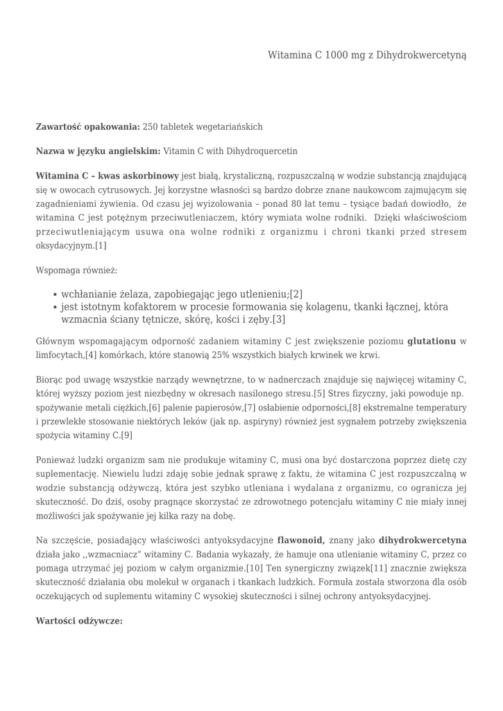 Witamina C 1000 mg z Dihydrokwercetyną Zawartość opakowania: 250 tabletek wegetariańskich Nazwa w języku angielskim: Vitamin C with Dihydroquercetin Witamina C – kwas askorbinowy jest białą, krystaliczną, rozpuszczalną w wodzie substancją znajdującą się w owocach cytrusowych. Jej korzystne własności są bardzo dobrze znane naukowcom zajmującym się zagadnieniami żywienia. Od czasu jej wyizolowania – ponad 80 lat temu – tysiące badań dowiodło, że witamina C jest potężnym przeciwutleniaczem, który wymiata wolne rodniki. Dzięki właściwościom przeciwutleniającym usuwa ona wolne rodniki z organizmu i chroni tkanki przed stresem oksydacyjnym.[1] Wspomaga również: wchłanianie żelaza, zapobiegając jego utlenieniu;[2] jest istotnym kofaktorem w procesie formowania się kolagenu, tkanki łącznej, która wzmacnia ściany tętnicze, skórę, kości i zęby.[3] Głównym wspomagającym odporność zadaniem witaminy C jest zwiększenie poziomu glutationu w limfocytach,[4] komórkach, które stanowią 25% wszystkich białych krwinek we krwi. Biorąc pod uwagę wszystkie narządy wewnętrzne, to w nadnerczach znajduje się najwięcej witaminy C, której wyższy poziom jest niezbędny w okresach nasilonego stresu.[5] Stres fizyczny, jaki powoduje np. spożywanie metali ciężkich,[6] palenie papierosów,[7] osłabienie odporności,[8] ekstremalne temperatury i przewlekłe stosowanie niektórych leków (jak np. aspiryny) również jest sygnałem potrzeby zwiększenia spożycia witaminy C.[9] Ponieważ ludzki organizm sam nie produkuje witaminy C, musi ona być dostarczona poprzez dietę czy suplementację. Niewielu ludzi zdaję sobie jednak sprawę z faktu, że witamina C jest rozpuszczalną w wodzie substancją odżywczą, która jest szybko utleniana i wydalana z organizmu, co ogranicza jej skuteczność. Do dziś, osoby pragnące skorzystać ze zdrowotnego potencjału witaminy C nie miały innej możliwości jak spożywanie jej kilka razy na dobę. Na szczęście, posiadający właściwości antyoksydacyjne flawonoid, znany jako dihydrokwercetyna działa jako ,,wzmacniacz” witaminy C. Badania wykazały, że hamuje ona utlenianie witaminy C, przez co pomaga utrzymać jej poziom w całym organizmie.[10] Ten synergiczny związek[11] znacznie zwiększa skuteczność działania obu molekuł w organach i tkankach ludzkich. Formuła została stworzona dla osób oczekujących od suplementu witaminy C wysokiej skuteczności i silnej ochrony antyoksydacyjnej. Wartości odżywcze: Witamina C 1000 mg z Dihydrokwercetyną Wielkość dawki – 1 tabletka wegetariańska Ilość dawek w opakowaniu – 250 Zawartość jednej tabletki: Witamina C (jako kwas L-askorbinowy) 3 ramnozyd dihydrokwercetyny (z ekstraktu z liści winogron) 1000 mg 10 mg Pozostałe składniki: celuloza mikrokrystaliczna, kwas stearynowy, kroskarmeloza sodu, hydroksypropylometyloceluloza, stearyniany roślinne, powłoka (hydroksypropylometyloceluloza, gliceryna), krzemionka. Sposób użycia: Jeśli lekarz nie zaleci inaczej, 1 kapsułka dziennie, z posiłkiem. Uwaga! Przechowywać w miejscu niedostępnym dla dzieci. Nie przekraczać zalecanego dziennego spożycia Nie stosować, jeśli opakowanie zewnętrzne jest otwarte bądź uszkodzone. Podczas stosowania jakichkolwiek leków, w ciąży lub laktacji, przed zastosowaniem suplementu diety proszę skonsultować się z lekarzem. Suplementy diety nie mogą być stosowane, jako substytut (zamiennik) zróżnicowanej diety. Należy pamiętać o zrównoważonym sposobie żywienia i zdrowym trybie życia. Otwórz listę źródeł naukowych [1] Biochim Biophys Acta. 2012 Dec;1826(2):443-57. Redox Rep. 2010;15(1):11-9. Adv Nutr. 2011 Mar;2(2):78-88. Altern Med Rev. 2003 Nov;8(4):359-77. J Invest Dermatol. 2002 Apr;118(4):565-72. Radiat Environ Biophys. 2007 Mar;46(1):61-8. Free Radic Biol Med. 2007 Sep 1;43(5):853-9. PLoS Negl Trop Dis. 2012;6(7):e1729. [2] Br J Nutr. 2003 Dec;90(6):1081-5. Am J Clin Nutr. 2006 Oct;84(4):830-4. Witamina C 1000 mg z Dihydrokwercetyną [3] Altern Med Rev. 2003 Nov;8(4):359-77. J Invest Dermatol. 2002 Apr;118(4):565-72. Radiat Environ Biophys. 2007 Mar;46(1):61-8. [4] Am J Clin Nutr. 2003 Jan;77(1):189-95. [5] In Vivo. 1994 Nov-Dec;8(6):1079-85. Ann Nutr Metab. 1990;34(2):85-92. Psychopharmacology (Berl). 2002 Jan;159(3):319-24 Am J Clin Nutr. 2007 Jul;86(1):145-9. [6] Genet Test Mol Biomarkers. 2012 Sep;16(9):1001-6. Environ Toxicol Pharmacol. 2011 Jan;31(1):137-42. Acta Biochim Biophys Sin (Shanghai). 2012 Apr;44(4):330-8. Nig Q J Hosp Med. 2012 Apr-Jun;22(2):85-90. Toxicology. 2005 Jul 1;211(1-2):26-35. Chem Biol Interact. 2001 Jul 31;137(1):75-88. [7] Environ Health Perspect. 2000 Feb;108(2):105-8. Am J Ther. 2007 Mar-Apr;14(2):189-93. Am J Clin Nutr. 2000 Feb;71(2):530-6. Toxicology. 2002 Nov 15;180(2):121-37. [8] J Am Coll Cardiol. 2003 Nov 5;42(9):1656-62. J Pediatr Gastroenterol Nutr. 2003 Jul;37(1):53-62. Cancer Sci. 2003 Apr;94(4):378-82. Adv Ther. 2002 May-Jun;19(3):151-9. Br J Dermatol. 1980 Jan;102(1):49-56. Respir Med. 2007 Aug;101(8):1770-8. Acta Obstet Gynecol Scand. 2007;86(7):783-7. [9] Med Sci Monit. 2001 Jul-Aug;7(4):592-9. [10]Free Radic Biol Med. 1995 Jul;19(1):45-52. Int. J Food Sci. Tech. 1969;4:255-67. [11] Free Radic Biol Med. 1997;22(4):669-78.