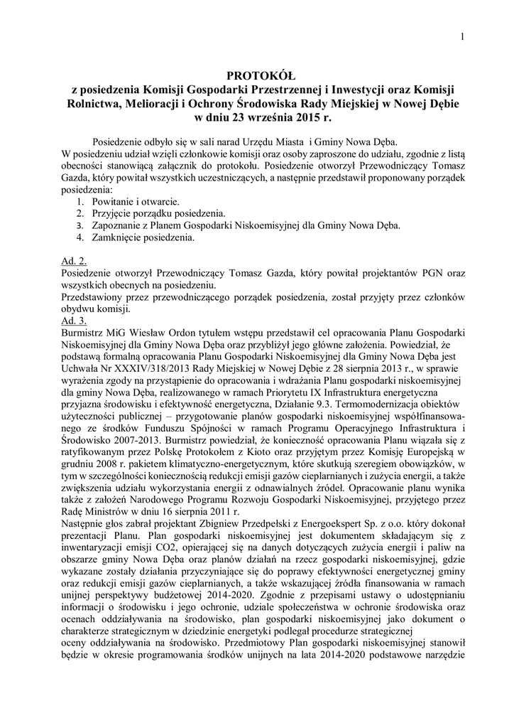 1 PROTOKÓŁ z posiedzenia Komisji Gospodarki Przestrzennej i Inwestycji oraz Komisji Rolnictwa, Melioracji i Ochrony Środowiska Rady Miejskiej w Nowej Dębie w dniu 23 września 2015 r. Posiedzenie odbyło się w sali narad Urzędu Miasta i Gminy Nowa Dęba. W posiedzeniu udział wzięli członkowie komisji oraz osoby zaproszone do udziału, zgodnie z listą obecności stanowiącą załącznik do protokołu. Posiedzenie otworzył Przewodniczący Tomasz Gazda, który powitał wszystkich uczestniczących, a następnie przedstawił proponowany porządek posiedzenia: 1. Powitanie i otwarcie. 2. Przyjęcie porządku posiedzenia. 3. Zapoznanie z Planem Gospodarki Niskoemisyjnej dla Gminy Nowa Dęba. 4. Zamknięcie posiedzenia. Ad. 2. Posiedzenie otworzył Przewodniczący Tomasz Gazda, który powitał projektantów PGN oraz wszystkich obecnych na posiedzeniu. Przedstawiony przez przewodniczącego porządek posiedzenia, został przyjęty przez członków obydwu komisji. Ad. 3. Burmistrz MiG Wiesław Ordon tytułem wstępu przedstawił cel opracowania Planu Gospodarki Niskoemisyjnej dla Gminy Nowa Dęba oraz przybliżył jego główne założenia. Powiedział, że podstawą formalną opracowania Planu Gospodarki Niskoemisyjnej dla Gminy Nowa Dęba jest Uchwała Nr XXXIV/318/2013 Rady Miejskiej w Nowej Dębie z 28 sierpnia 2013 r., w sprawie wyrażenia zgody na przystąpienie do opracowania i wdrażania Planu gospodarki niskoemisyjnej dla gminy Nowa Dęba, realizowanego w ramach Priorytetu IX Infrastruktura energetyczna przyjazna środowisku i efektywność energetyczna, Działanie 9.3. Termomodernizacja obiektów użyteczności publicznej – przygotowanie planów gospodarki niskoemisyjnej współfinansowanego ze środków Funduszu Spójności w ramach Programu Operacyjnego Infrastruktura i Środowisko 2007-2013. Burmistrz powiedział, że konieczność opracowania Planu wiązała się z ratyfikowanym przez Polskę Protokołem z Kioto oraz przyjętym przez Komisję Europejską w grudniu 2008 r. pakietem klimatyczno-energetycznym, które skutkują szeregiem obowiązków, w tym w szczególności koniecznością redukcji emisji gazów cieplarnianych i zużycia energii, a także zwiększenia udziału wykorzystania energii z odnawialnych źródeł. Opracowanie planu wynika także z założeń Narodowego Programu Rozwoju Gospodarki Niskoemisyjnej, przyjętego przez Radę Ministrów w dniu 16 sierpnia 2011 r. Następnie głos zabrał projektant Zbigniew Przedpełski z Energoekspert Sp. z o.o. który dokonał prezentacji Planu. Plan gospodarki niskoemisyjnej jest dokumentem składającym się z inwentaryzacji emisji CO2, opierającej się na danych dotyczących zużycia energii i paliw na obszarze gminy Nowa Dęba oraz planów działań na rzecz gospodarki niskoemisyjnej, gdzie wykazane zostały działania przyczyniające się do poprawy efektywności energetycznej gminy oraz redukcji emisji gazów cieplarnianych, a także wskazującej źródła finansowania w ramach unijnej perspektywy budżetowej 2014-2020. Zgodnie z przepisami ustawy o udostępnianiu informacji o środowisku i jego ochronie, udziale społeczeństwa w ochronie środowiska oraz ocenach oddziaływania na środowisko, plan gospodarki niskoemisyjnej jako dokument o charakterze strategicznym w dziedzinie energetyki podlegał procedurze strategicznej oceny oddziaływania na środowisko. Przedmiotowy Plan gospodarki niskoemisyjnej stanowił będzie w okresie programowania środków unijnych na lata 2014-2020 podstawowe narzędzie 2 pozyskiwania preferencyjnego finansowania dla działań związanych z termomodernizacją, racjonalizacją użytkowania energii oraz wykorzystaniem odnawialnych źródeł energii w obiektach. Dalej członkowie komisji zapoznali się z treścią Planu. Pytań i uwag nie było. Przewodniczący komisji podziękował przedstawicielom Spółki Energoekspert za przybycie i prezentację Planu. Ad. 4. Po wyczerpaniu porządku posiedzenia Przewodniczący komisji ogłosił jego zamknięcie. PRZEWODNICZĄCY KOMISJI Tomasz Gazda Protokół sporządziła: Elżbieta Goclan