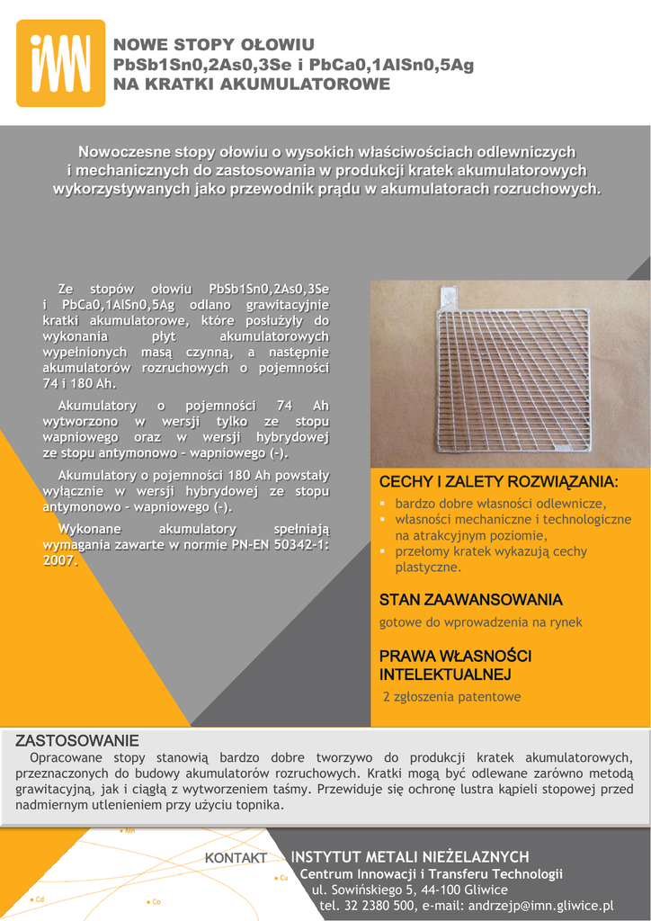 NOWE STOPY OŁOWIU PbSb1Sn0,2As0,3Se i PbCa0,1AlSn0,5Ag NA KRATKI AKUMULATOROWE Nowoczesne stopy ołowiu o wysokich właściwościach odlewniczych i mechanicznych do zastosowania w produkcji kratek akumulatorowych wykorzystywanych jako przewodnik prądu w akumulatorach rozruchowych. Ze stopów ołowiu PbSb1Sn0,2As0,3Se i PbCa0,1AlSn0,5Ag odlano grawitacyjnie kratki akumulatorowe, które posłużyły do wykonania płyt akumulatorowych wypełnionych masą czynną, a następnie akumulatorów rozruchowych o pojemności 74 i 180 Ah. Akumulatory o pojemności 74 Ah wytworzono w wersji tylko ze stopu wapniowego oraz w wersji hybrydowej ze stopu antymonowo – wapniowego (-). Akumulatory o pojemności 180 Ah powstały wyłącznie w wersji hybrydowej ze stopu antymonowo – wapniowego (-). Wykonane akumulatory spełniają wymagania zawarte w normie PN-EN 50342-1: 2007. CECHY I ZALETY ROZWIĄZANIA: bardzo dobre własności odlewnicze, własności mechaniczne i technologiczne na atrakcyjnym poziomie, przełomy kratek wykazują cechy plastyczne. STAN ZAAWANSOWANIA gotowe do wprowadzenia na rynek PRAWA WŁASNOŚCI INTELEKTUALNEJ 2 zgłoszenia patentowe ZASTOSOWANIE Opracowane stopy stanowią bardzo dobre tworzywo do produkcji kratek akumulatorowych, przeznaczonych do budowy akumulatorów rozruchowych. Kratki mogą być odlewane zarówno metodą grawitacyjną, jak i ciągłą z wytworzeniem taśmy. Przewiduje się ochronę lustra kąpieli stopowej przed nadmiernym utlenieniem przy użyciu topnika. KONTAKT INSTYTUT METALI NIEŻELAZNYCH Centrum Innowacji i Transferu Technologii ul. Sowińskiego 5, 44-100 Gliwice tel. 32 2380 500, e-mail: [email protected]