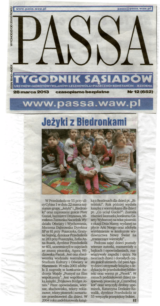 PASSA www. pana. waw.pl [email protected] TYGODNIK SĄSIADÓW Jj URSYNÓW* MOKOTÓW* WILANÓW- |_ESZNQWOLA»PIASECZNO-KONSTANCIN - JEZIORNA 28 marca 2O13 czasopismo bezpłatne www* Nr 12 f652) waw„pł Jeżyki z Biedronkami W Przedszkolu nr 55 przy ulicy Cybisa l w dniu 22 marca najstarsze grupy,,Jeżyki" i „Biedronki" oraz zaproszeni goście Piotr Guział, burmistrz Ursynowa, Mirosfeważurawska Naczelnik Wydziału Oświaty i Wychowania, Marzena Dąbrowska Dyrektor SP nr 81 przy Puszczyka, Grażyna Sajnóg, dyrektor Przedszkola nr 283 przy Puszczyka, Zofia Anna Rusek, dyrektor Przedszkola nr 401, uczestniczyli w zajęciach ze znaną pisarską, Agatą Widzowską-Pasiak. Jest ona absolwentką wydziału teatralnego Studium Kultury i Oświaty w Warszawie. W roku 2001 zdobyła II nagrodę w konkursie Andrzeja Wajdy „Pomysł na film współczesny". Jest współautorką książki „Trójkowa Bridget Jones." Pisze opowiadania, wiersze, słuchowiska, teksty reklamowe, teksty piosenek i scenariusze przedstawień dla dzieci. W 2004 roku zadebiutowała książ- ką o Beatlesach dla dzieci pt. „Bitelsiaki". Rok później wydała książkę z wierszykami dla dzieci pt. „Co uciął Gucio?". Została również laureatką konkursu Gazety Wyborczej na tekst piosenki z okazji Dnia Mamy, wydanej na płycie Arki Noego oraz zdobyła wyróżnienie w konkursie wydawnictwa Nowy Świat na „trzeszczące wierszyki". Podczas zajęć dzieci poznały wiersze autorki, rozmawiały o „ bajkach i opowiadaniach, rozwiązywały zagadki i quizy. Na twarzach dzieci i dorosłych często gościł uśmiech. Od pani Agaty dzieci otrzymały książkę z dedykacją do przedszkolnej biblioteki oraz wiersz pt „Piesek". W ramach podziękowań dzieci zaśpiewały piosenkę pt „Czarodziej kot" oraz wręczyły drobny upominek, Katarzyna Dreksler-Kowalik, dyrektor Przedszkola nr 55 wręczyła przepiękny bukiet. EC