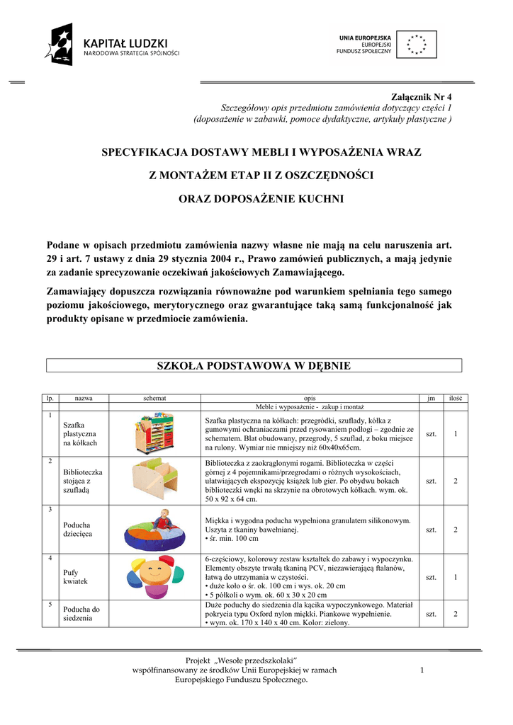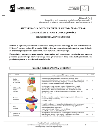 Załącznik Nr 4 Szczegółowy opis przedmiotu zamówienia dotyczący części 1 (doposażenie w zabawki, pomoce dydaktyczne, artykuły plastyczne ) SPECYFIKACJA DOSTAWY MEBLI I WYPOSAŻENIA WRAZ Z MONTAŻEM ETAP II Z OSZCZĘDNOŚCI ORAZ DOPOSAŻENIE KUCHNI Podane w opisach przedmiotu zamówienia nazwy własne nie mają na celu naruszenia art. 29 i art. 7 ustawy z dnia 29 stycznia 2004 r., Prawo zamówień publicznych, a mają jedynie za zadanie sprecyzowanie oczekiwań jakościowych Zamawiającego. Zamawiający dopuszcza rozwiązania równoważne pod warunkiem spełniania tego samego poziomu jakościowego, merytorycznego oraz gwarantujące taką samą funkcjonalność jak produkty opisane w przedmiocie zamówienia. SZKOŁA PODSTAWOWA W DĘBNIE lp. nazwa 1 schemat opis Meble i wyposażenie - zakup i montaż jm ilość Szafka plastyczna na kółkach Szafka plastyczna na kółkach: przegródki, szuflady, kółka z gumowymi ochraniaczami przed rysowaniem podłogi – zgodnie ze schematem. Blat obudowany, przegrody, 5 szuflad, z boku miejsce na rulony. Wymiar nie mniejszy niż 60x40x65cm. szt. 1 Biblioteczka stojąca z szufladą Biblioteczka z zaokrąglonymi rogami. Biblioteczka w części górnej z 4 pojemnikami/przegrodami o różnych wysokościach, ułatwiających ekspozycję książek lub gier. Po obydwu bokach biblioteczki wnęki na skrzynie na obrotowych kółkach. wym. ok. 50 x 92 x 64 cm. szt. 2 Poducha dziecięca Miękka i wygodna poducha wypełniona granulatem silikonowym. Uszyta z tkaniny bawełnianej. • śr. min. 100 cm szt. 2 szt. 1 szt. 2 2 3 4 Pufy kwiatek 5 Poducha do siedzenia 6-częściowy, kolorowy zestaw kształtek do zabawy i wypoczynku. Elementy obszyte trwałą tkaniną PCV, niezawierającą ftalanów, łatwą do utrzymania w czystości. • duże koło o śr. ok. 100 cm i wys. ok. 20 cm • 5 półkoli o wym. ok. 60 x 30 x 20 cm Duże poduchy do siedzenia dla kącika wypoczynkowego. Materiał pokrycia typu Oxford nylon miękki. Piankowe wypełnienie. • wym. ok. 170 x 140 x 40 cm. Kolor: zielony. Projekt „Wesołe przedszkolaki” współfinansowany ze środków Unii Europejskiej w ramach Europejskiego Funduszu Społecznego. 1 6 Cyfrowe kwadraty Pomoc wspomagająca naukę liczenia w zakresie do 10. Miękkie kwadraty z cyframi od 0 do 9 są obszyte tkaniną PCV. • wym. ok. 33 x 33 x 5 cm Komplet – 10 szt. kpl. 2 Biblioteczka wisząca Biblioteczka wisząca. Stelaż wykonany z płyty wiórowej laminowanej, tylna ściana z płyty HDF. Wymiary ok.: szer. 94 cm gł. 20 cm wys. 130 cm. szt. 2 Drzwi do szatni Drzwi do szatni. Czerwone. Komplet 5 szt. drzwi o wym. wys. 92, szer. 22 cm. Adaptacja do posiadanych szatni. kpl. 4 szt. 1 kpl. 1 jm ilość szt. 1 7 8 9 Regał przeznaczony do przechowywania tornistów i plecaków. Wykonany z płyty laminowanej kolor buk lub sosna lub podobny wykończonej obrzeżem PCV o gr. 2 mm. W zestawie plastikowe pojemniki (6 szt.) montowane w małych schowkach z przeznaczeniem np. na drugie śniadania lub rzeczy osobiste dzieci. Dostawa regału wraz z pojemnikami. Wym. ok. 105 x 46 x 154 cm Zestaw wykonany z płyty wiórowej laminowanej o grubości 18mm w kolorze buk lub podobny. Fronty szafek z płyty MDF. Kolorystyka niebieska. Listwa cokołowa szafki wykonana z płyty MDF w kolorze niebieskim. Motywy dekoracyjne gwiazda, rakieta, księżyc, słońce, kometa wykonane z płyty MDF. Tylne ścianki szafek z płyty MDF w kolorze białym. W zestawie szafki: – Szafka typu gwiazda. Motyw dekoracyjny gwiazda nad regałem wykonany z płyty MDF w kolorze niebieskim. Wymiary ok: Wysokość: 450 mm, Szerokość: 820 mm, Głębokość: 400 mm - Szafka typu rakieta. Motyw dekoracyjny rakieta nad regałem wykonany z płyty MDF w kolorze czerwonym. Szafka z trzema wewnętrznymi półkami. Wymiary ok. Wysokość: 1260 mm, Szerokość: 410 mm, Głębokość: 400 mm - Szafka typu księżyc. Motyw dekoracyjny księżyc nad regałem wykonany z płyty MDF w kolorze żółtym. Tylna ściana szafki wykonana z płyty MDF w kolorze białym. Szafka z dwoma wewnętrznymi półkami. Wymiary ok: Wysokość: 890 mm, Szerokość: 820 mm, Głębokość: 400 mm - Szafka typu słońce. Motyw dekoracyjny księżyc nad regałem wykonany z płyty MDF w kolorze żółtym. Szafka z dwoma wewnętrznymi półkami. Wymiary ok: Wysokość: 890 mm, Szerokość: 820 mm, Głębokość: 400 mm - Szafka typu kometa. Motyw dekoracyjny kometa nad regałem wykonany z płyty MDF w kolorze żółtym. Wymiary ok: Wysokość: 450 mm, Szerokość: 820mm, Głębokość: 400 mm Regał na plecaki i tornistry wraz z pojemnikami 10 Zestaw mebli typu kosmos SZKOŁA PODSTAWOWA W DURSZTYNIE lp. nazwa 11 Szafka plastyczna na kółkach schemat opis Meble i wyposażenie - zakup i montaż Szafka plastyczna na kółkach: przegródki, szuflady, kółka z gumowymi ochraniaczami przed rysowaniem podłogi – zgodnie ze schematem. Blat obudowany, przegrody, 5 szuflad, z boku miejsce na rulony. Wymiar nie mniejszy niż 60x40x65cm. Projekt „Wesołe przedszkolaki” współfinansowany ze środków Unii Europejskiej w ramach Europejskiego Funduszu Społecznego. 2 12 Biblioteczka stojąca z szufladą Biblioteczka z zaokrąglonymi rogami. Biblioteczka w części górnej z 4 pojemnikami/przegrodami o różnych wysokościach, ułatwiających ekspozycję książek lub gier. Po obydwu bokach biblioteczki wnęki na skrzynie na obrotowych kółkach. wym. ok. 50 x 92 x 64 cm. szt. 2 Poducha dziecięca Miękka i wygodna poducha wypełniona granulatem silikonowym. Uszyta z tkaniny bawełnianej. • śr. min. 100 cm szt. 2 szt. 1 szt. 2 13 14 Pufy kwiatek 15 Poducha do siedzenia 16 6-częściowy, kolorowy zestaw kształtek do zabawy i wypoczynku. Elementy obszyte trwałą tkaniną PCV, niezawierającą ftalanów, łatwą do utrzymania w czystości. • duże koło o śr. ok. 100 cm i wys. ok. 20 cm • 5 półkoli o wym. ok. 60 x 30 x 20 cm Duże poduchy do siedzenia dla kącika wypoczynkowego. Materiał pokrycia typu O