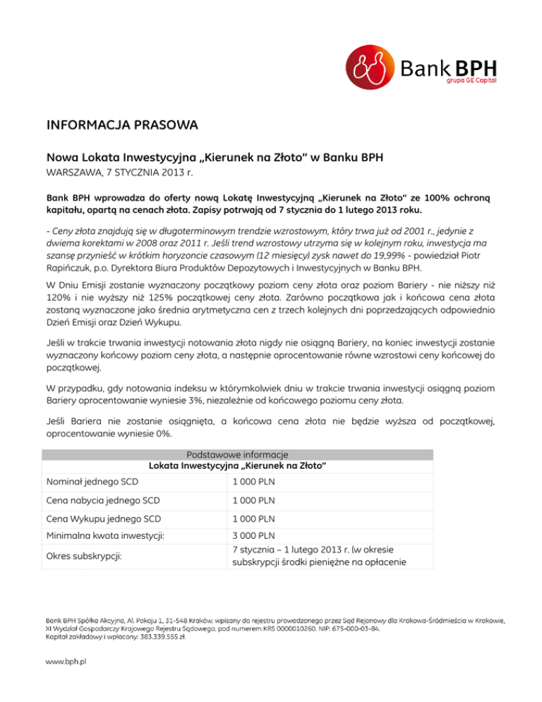 INFORMACJA PRASOWA Nowa Lokata Inwestycyjna „Kierunek na Złoto” w Banku BPH WARSZAWA, 7 STYCZNIA 2013 r. Bank BPH wprowadza do oferty nową Lokatę Inwestycyjną „Kierunek na Złoto” ze 100% ochroną kapitału, opartą na cenach złota. Zapisy potrwają od 7 stycznia do 1 lutego 2013 roku. - Ceny złota znajdują się w długoterminowym trendzie wzrostowym, który trwa już od 2001 r., jedynie z dwiema korektami w 2008 oraz 2011 r. Jeśli trend wzrostowy utrzyma się w kolejnym roku, inwestycja ma szansę przynieść w krótkim horyzoncie czasowym (12 miesięcy) zysk nawet do 19,99% - powiedział Piotr Rapińczuk, p.o. Dyrektora Biura Produktów Depozytowych i Inwestycyjnych w Banku BPH. W Dniu Emisji zostanie wyznaczony początkowy poziom ceny złota oraz poziom Bariery - nie niższy niż 120% i nie wyższy niż 125% początkowej ceny złota. Zarówno początkowa jak i końcowa cena złota zostaną wyznaczone jako średnia arytmetyczna cen z trzech kolejnych dni poprzedzających odpowiednio Dzień Emisji oraz Dzień Wykupu. Jeśli w trakcie trwania inwestycji notowania złota nigdy nie osiągną Bariery, na koniec inwestycji zostanie wyznaczony końcowy poziom ceny złota, a następnie oprocentowanie równe wzrostowi ceny końcowej do początkowej. W przypadku, gdy notowania indeksu w którymkolwiek dniu w trakcie trwania inwestycji osiągną poziom Bariery oprocentowanie wyniesie 3%, niezależnie od końcowego poziomu ceny złota. Jeśli Bariera nie zostanie osiągnięta, a końcowa cena złota nie będzie wyższa od początkowej, oprocentowanie wyniesie 0%. Nominał jednego SCD Podstawowe informacje Lokata Inwestycyjna „Kierunek na Złoto” Pakiet Premium Profit Banku BPH 1 000 PLN Cena nabycia jednego SCD 1 000 PLN Cena Wykupu jednego SCD 1 000 PLN Minimalna kwota inwestycji: 3 000 PLN Okres subskrypcji: 7 stycznia – 1 lutego 2013 r. (w okresie subskrypcji środki pieniężne na opłacenie ofert nabycia nie są oprocentowane) Opłata subskrypcyjna: do 0,5% Dzień emisji: 8 lutego 2013 r. Dzień wykupu: 11 lutego 2014 r. Gwarancja zwrotu zainwestowanego kapitału: Gwarancja kapitału w trakcie trwania inwestycji: 100% w dniu wykupu 92,5% (wykup na rynku wtórnym) Odsetki z Lokaty Inwestycyjnej podlegają opodatkowaniu na zasadach wynikających z powszechnie obowiązujących przepisów prawa. Zainwestowane środki podlegają ochronie Bankowego Funduszu Gwarancyjnego do kwoty 100 tys. EUR. Od zdeponowanych środków w okresie subskrypcji nie są naliczane odsetki. Inwestowanie w strukturyzowane certyfikaty depozytowe niesie ze sobą ryzyko inwestycyjne. Z uwagi na charakter inwestycji zysk jest powiązany ze zmiennymi rynków finansowych i dlatego nie jest z góry znany, a także może być niższy od oczekiwanego lub nie wystąpić wcale. Więcej informacji na temat produktu oraz związanych z nim ryzyk można znaleźć w Ogólnych Warunkach Emisji na stronie: www.inwestycje.bph.pl. Zapisy będą przyjmowane we wszystkich oddziałach Banku BPH na terenie całego kraju. Warunkiem subskrypcji jest posiadanie lub otwarcie bezpłatnego konta oszczędnościowego bądź konta osobistego w Banku BPH. Dodatkowych informacji na temat subskrypcji udzielają Doradcy Klienta. Więcej informacji na stronie www.inwestycje.bph.pl oraz infolinii 0 801 406 406 lub 0 58 300 70 69. *** Bank BPH oferuje swoje produkty i usługi Klientom indywidualnym, małym i średnim przedsiębiorstwom oraz Klientom korporacyjnym. Bogata oferta Banku zawiera m.in.: kredyty, w tym gotówkowe i hipoteczne, konta osobiste, rachunki oszczędnościowe i lokaty oraz karty kredytowe. Bank BPH prowadzi również działalność w zakresie zintegrowanych usług maklerskich, bankowości skarbowej oraz zarządzania aktywami poprzez spółkę zależną BPH TFI. Klienci Banku mogą korzystać z sieci blisko 300 oddziałów własnych, a także placówek partnerskich i agencji uniwersalnych, jak również z nowoczesnej bankowości internetowej oraz telefonicznej. Bank BPH jest obecny na polskim rynku od ponad 20 lat. Jest spółką publiczną notowaną na Giełdzie Papierów Wartościowych w Warszawie i wchodzi w skład indeksu Respect. Siedzibą prawną Banku BPH jest Kraków, biuro centrali znajduje się w Warszawie, a główne centra operacyjne w Gdańsku i Krakowie. Bank BPH wchodzi w skład grupy kapitałowej GE, jednej z największych korporacji na świecie.