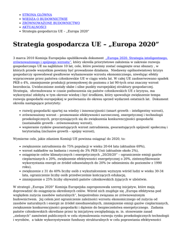 STRONA GŁÓWNA WIEDZA O BUDOWNICTWIE ZRÓWNOWAŻONE BUDOWNICTWO AKTUALNOŚCI Strategia gospodarcza UE – „Europa 2020” Strategia gospodarcza UE – „Europa 2020” 3 marca 2010 Komisja Europejska opublikowała dokument „Europa 2020. Strategia inteligentnego, zrównoważonego i spójnego wzrostu”, który określa priorytetowe założenia w zakresie rozwoju gospodarczego UE na najbliższe 10 lat, cele, które powinny zostać osiągnięte oraz obszary , w których przede wszystkim powinny być prowadzone działania. Niedawny ogólnoświatowy kryzys gospodarczy spowodował gwałtowne wyhamowanie wzrostu ekonomicznego, niwelując efekty wypracowane przez państwa członkowskie UE w ciągu wielu lat. W całej UE zaobserwowano spadek PKB o 4%, zmniejszenie produkcji przemysłowej do poziomu z lat 90-tych oraz znaczny wzrost bezrobocia. Uwidocznione zostały słabe i silne punkty europejskiej struktury gospodarczej. Strategia, sformułowana w czasie podnoszenia się państw członkowskich UE z kryzysu, ma wykorzystać zdobytą w tym okresie wiedzę i być środkiem, który spowoduje zwiększenie tempa rozwoju gospodarki europejskiej w porównaniu do okresu sprzed wydarzeń ostatnich lat. Dokument określa następujące priorytety: rozwój gospodarki opartej na wiedzy i innowacyjności (smart growth – inteligentny wzrost), zrównoważony wzrost – promowanie efektywności surowcowej, energetycznej i technologii proekologicznych, przyczyniających się do zwiększenia konkurencyjności gospodarki (sustainable growth – zrównoważony wzrost), wspieranie rynków gwarantujących wzrost zatrudnienia, gwarantujących spójność społeczną i terytorialną (inclusive growth – spójny wzrost), Wymierne cele, jakie zdaniem Komisji UE powinna osiągnąć do 2020, to: zwiększenie zatrudnienia do 75% populacji w wieku 20-64 lata (aktualnie 69%), wzrost nakładów na badania i rozwój do 3% PKB Unii (aktualnie około 2%), osiągnięcie celów klimatycznych i energetycznych „20/20/20” – ograniczenie emisji gazów cieplarnianych o 20%, zwiększenie efektywności energetycznej o 20%, zintensyfikowanie wykorzystania energii ze źródeł odnawialnych do 20% (w odniesieniu do poziomów z 1990 roku), zwiększenie z 31 do 40% liczby osób z wykształceniem wyższym wśród ludzi w wieku 30-34 lata, ograniczenie liczby osób przedwcześnie kończących edukację, zmniejszenie o 25% liczby obywateli państw członkowskich żyjących w ubóstwie. W strategii „Europa 2020” Komisja Europejska zaproponowała szereg inicjatyw, które mają doprowadzić do osiągnięcia określonych celów. Wśród nich znajduje się „Europa efektywna pod względem zużycia zasobów naturalnych”, bezpośrednio związana ze zrównoważonym budownictwem. Jej celem jest ograniczenie zależności wzrostu ekonomicznego od zużycia od zasobów naturalnych i energii ze źródeł nieodnawialnych, zmniejszenie emisji gazów cieplarnianych, zwiększenie konkurencyjności gospodarki i dążenie do bezpieczeństwa energetycznego. Zadania państw członkowskich określane przez tę inicjatywę uwzględniają m. in. stosowanie zasad „zielonych” zamówień publicznych w celu stymulowania rozwoju rynku proekologicznych technologii i wyrobów, a także wykorzystywanie funduszy strukturalnych w celu poprawiania efektywności energetycznej budynków publicznych.