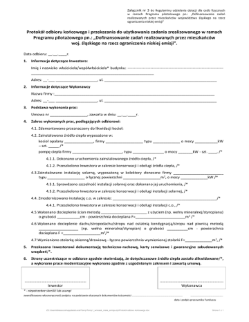 Załącznik nr 3 do Regulaminu udzielania dotacji dla osób fizycznych w ramach Programu pilotażowego pn.: „Dofinansowanie zadań realizowanych przez mieszkańców województwa śląskiego na rzecz ograniczenia niskiej emisji” Protokół odbioru końcowego i przekazania do użytkowania zadania zrealizowanego w ramach Programu pilotażowego pn.: „Dofinansowanie zadań realizowanych przez mieszkańców woj. śląskiego na rzecz ograniczenia niskiej emisji”. Data odbioru: __.__.____r. 1. Informacje dotyczące Inwestora: Imię i nazwisko właściciela/współwłaściciela* budynku: --------------------------------------------------------------------------___________________________________________________________ Adres: __-___ ____________________, ul. ______________________________________________________ 2. Informacje dotyczące Wykonawcy Nazwa firmy :_____________________________________________________________________________ Adres: __-___ ____________________, ul. ______________________________________________________ 3. Podstawa wykonania prac: Umowa nr __________________, zawarta w dniu: __.__.____r. 4. Zakres wykonanych prac, podlegających odbiorowi: 4.1. Zdemontowano przeznaczony do likwidacji kocioł: 4.2. Zainstalowano źródło ciepła wyposażone w: kocioł opalany ______________, firmy __________________ typu _____________ o mocy ___________kW – szt. _____ /* pompę ciepła firmy ________________________, typu _______________ o mocy _______kW - szt. ____, /* 4.2.1. Dokonano uruchomienia zainstalowanego źródło ciepła, /* 4.2.2. Przeszkolono Inwestora w zakresie konserwacji i obsługi źródła ciepła, /* 4.3.Zainstalowano instalację solarną, wyposażoną w kolektory słoneczne firmy ________________________ typu __________________ o łącznej powierzchni __________________m2, o mocy _____________kW /* 4.3.1. Sprawdzono szczelność instalacji solarnej oraz dokonano jej uruchomienia, /* 4.3.2. Przeszkolono Inwestora w zakresie konserwacji i obsługi instalacji solarnej, /* 4.4. Zmodernizowano instalację c.o. w zakresie: __________________________________________________/* 4.4.1. Przeszkolono Inwestora w zakresie konserwacji i obsługi instalacji c.o., /* 4.5.Wykonano docieplenie ścian metodą ______________________ z użyciem (np. wełny mineralnej/styropianu) o grubości ___________cm - powierzchnia docieplana F=________________________m2 /* 4.6.Wykonano docieplenie dachu/stropodachu/stropu nad ostatnią kondygnacją/stropu nad piwnicą metodą ___________________ (np. wełna mineralna/styropian) o grubości __________cm - powierzchnia docieplana F =__________________m2/* 4.7.Wymieniono stolarkę okienną/drzwiową - łączna powierzchnia wymienionej stolarki F=_____________m2, /* 5. Przekazano Inwestorowi dokumentację techniczno-ruchową, karty serwisowe i gwarancyjne zabudowanych urządzeń/*. 6. Strony uczestniczące w odbiorze zgodnie stwierdzają, że dotychczasowe źródło ciepła zostało zlikwidowane/*, a wykonane prace modernizacyjne wykonano zgodnie z uzgodnionym zakresem i zawartą umową. …………………………………………….………… Inwestor ………………………………………………………… Wykonawca * - niepotrzebne skreślić lub usunąć zweryfikowano własnoręczność podpisu na podstawie okazanych dokumentów tożsamości ………………………………………………………………… …………………………………….….. data i podpis pracownika Funduszu ZC:\Users\kblaszczok\appdata\Local\Temp\Temp1_wniosek_niska_emisja.zip\Protokół odbioru końcowego.doc Strona 1 z 1
