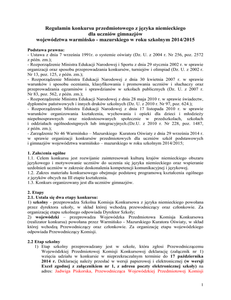 Regulamin konkursu przedmiotowego z języka niemieckiego dla uczniów gimnazjów województwa warmińsko - mazurskiego w roku szkolnym 2014/2015 Podstawa prawna: - Ustawa z dnia 7 września 1991r. o systemie oświaty (Dz. U. z 2004 r. Nr 256, poz. 2572 z późn. zm.); - Rozporządzenie Ministra Edukacji Narodowej i Sportu z dnia 29 stycznia 2002 r. w sprawie organizacji oraz sposobu przeprowadzania konkursów, turniejów i olimpiad (Dz. U. z 2002 r. Nr 13, poz. 125, z późn. zm.); - Rozporządzenie Ministra Edukacji Narodowej z dnia 30 kwietnia 2007 r. w sprawie warunków i sposobu oceniania, klasyfikowania i promowania uczniów i słuchaczy oraz przeprowadzania egzaminów i sprawdzianów w szkołach publicznych (Dz. U. z 2007 r. Nr 83, poz. 562, z późn. zm.); - Rozporządzenie Ministra Edukacji Narodowej z dnia 28 maja 2010 r. w sprawie świadectw, dyplomów państwowych i innych druków szkolnych (Dz. U. z 2010 r. Nr 97, poz. 624.); - Rozporządzenie Ministra Edukacji Narodowej z dnia 17 listopada 2010 r. w sprawie warunków organizowania kształcenia, wychowania i opieki dla dzieci i młodzieży niepełnosprawnych oraz niedostosowanych społecznie w przedszkolach, szkołach i oddziałach ogólnodostępnych lub integracyjnych.(Dz.U. z 2010 r. Nr 228, poz. 1487, z późn. zm.); - Zarządzenie Nr 46 Warmińsko – Mazurskiego Kuratora Oświaty z dnia 29 września 2014 r. w sprawie organizacji konkursów przedmiotowych dla uczniów szkół podstawowych i gimnazjów województwa warmińsko – mazurskiego w roku szkolnym 2014/2015; 1. Założenia ogólne 1.1. Celem konkursu jest rozwijanie zainteresowań kulturą krajów niemieckiego obszaru językowego i motywowanie uczniów do uczenia się języka niemieckiego oraz wspieranie uzdolnień uczniów w zakresie doskonalenia kompetencji komunikacyjnej i językowej. 1.2. Zakres materiału konkursowego obejmuje podstawę programową kształcenia ogólnego z języków obcych na III etapie kształcenia. 1.3. Konkurs organizowany jest dla uczniów gimnazjów. 2. Etapy 2.1. Ustala się dwa etapy konkursu: 1) szkolny - przeprowadza Szkolna Komisja Konkursowa z języka niemieckiego powołana przez dyrektora szkoły, w skład której wchodzą przewodniczący oraz członkowie. Za organizację etapu szkolnego odpowiada Dyrektor Szkoły; 2) wojewódzki – przeprowadza Wojewódzka Przedmiotowa Komisja Konkursowa (realizator konkursu) powołana przez Warmińsko - Mazurskiego Kuratora Oświaty, w skład której wchodzą Przewodniczący oraz członkowie. Za organizację etapu wojewódzkiego odpowiada Przewodniczący Komisji. 2.2 Etap szkolny 1) Etap szkolny przeprowadzany jest w szkole, która zgłosi Przewodniczącemu Wojewódzkiej Przedmiotowej Komisji Konkursowej deklarację (załącznik nr 1) wzięcia udziału w konkursie w nieprzekraczalnym terminie do 17 października 2014 r. Deklarację należy przesłać w wersji papierowej i elektronicznej (w wersji Excel zgodnej z załącznikiem nr 1, z adresu poczty elektronicznej szkoły) na adres: Jadwiga Piskorska, Przewodnicząca Wojewódzkiej Przedmiotowej Komisji 1 2) 3) 4) 5) 6) 7) 8) 9) 10) Konkursowej, Polskie Stowarzyszenie Nauczycieli Języka Niemieckiego, Oddział w Olsztynie, ul. Małłków 3, 10-113 Olsztyn, e-mail: [email protected] . Konkurs ma charakter otwarty i mogą w nim uczestniczyć uczniowie, którzy zadeklarują chęć udziału. Eliminacje szkolne szkoła ma prawo zorganizować dwuetapowo. Do pierwszego etapu szkolnego arkusze konkursowe przygotowuje szkolna komisja konkursowa. Drugi etap szkolny realizowany jest zgodnie z harmonogramem i terminem określonym w terminarzu wojewódzkich konkursów przedmiotowych (załącznik nr 7). Etap ten rozpoczyna się 21 listopada 2014 r. o godz. 12:00 i trwa 60 minut. Do drugiego etapu szkolnego arkusz konkursowy przygotowuje Wojewódzka Przedmiotowa Komisja Konkursowa. Przewodniczący Wojewódzkiej Przedmiotowej Komisji Konkursowej prześle do 7 listopada 2014 r. do każdej szkoły, na adres poczty elektronicznej podany w nadesłanej przez nią deklaracji udziału, e-mail potwierdzający zgłoszenie uczniów do konkursu. Jeśli szkoła nie otrzyma tej informacji, Przewodniczący Szkolnej Komisji Konkursowej lub dyrektor szkoły powiadamia o tym Przewodniczącego Wojewódzkiej Przedmiotowej Komisji Konkursowej, nie później niż do 13 listopada 2014 r. W dniu konkursu, tj. 21 listopada 2014 r. do godziny 10.30, na adres poczty elektronicznej szkoły zostaną przesłane przewodniczącemu Szkolnej Komisji Konkursowej lub dyrektorowi szkoły materiały konkursowe. Klucz odpowiedzi do zadań konkursowych realizator konkursu przesyła na adres e-mail szkoły przewodniczącemu Szkolnej Komisji Konkursowej lub dyrektorowi szkoły 60 minut po zakończeniu konkursu. Przewodniczący Szkolnej Komisji Konkursowej odpowiedzialny jest za powielenie testu w liczbie egzemplarzy zgodnej z liczbą uczniów przystępujących do konkursu na etapie szkolnym. Dyrektor szkoły lub Przewodniczący Szkolnej Komisji Konkursowej przechowują materiały konkursowe do chwili rozpoczęcia konkursu z zachowaniem tajemnicy służbowej. Prace uczniów na etapie szkolnym są kodowane. O sposobie kodowania decyduje Przewodniczący Szkolnej Komisji Konkursowej. Dyrektor szkoły przesyła protokół z etapu szkolnego (załącznik nr 2) Przewodniczącemu Wojewódzkiej Przedmiotowej Komisji Konkursowej (w wersji elektronicznej i papierowej) wraz z rozkodowanymi pracami uczniów, którzy uzyskali co najmniej 75% punktów, w terminie 7 dni od daty konkursu (decyduje data stempla pocztowego). Załącznik należy wypełniać zgodnie z treścią rubryk, bez używania skrótów w żadnym z wierszy. Należy podać pełne dane uczniów oraz nazwę szkoły (z imieniem, jeżeli szkoła posiada). Szkoły, wysyłające prace uczniów, którzy uzyskali wymagany próg punktów z etapu szkolnego, załączają dane uczniów: nazwisko, imię/imiona, datę i miejsce urodzenia ucznia, klasę oraz imię i