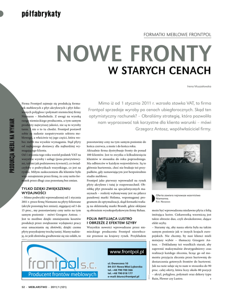 półfabrykaty formatki meblowe Frontpol Nowe fronty w starych cenach Firma Frontpol zajmuje się produkcją formatek meblowych z płyt akrylowych i płyt foliowanych polygloss i polymatt niemieckiej firmy Niemann – Moebelteile. Z uwagi na wysoką rangę niemieckiego producenta, a tym samym produkty najwyższej jakości, nie są to wyroby tanie. I nie o to tu chodzi. Frontpol postawił sobie za zadanie zaopatrywanie sektora meblowego, a właściwie tej jego części, która wobec mebli ma wysokie wymagania. Stąd płyty od najlepszego dostawcy dla najbardziej wymagającego klienta. Od 1 stycznia tego roku wzrósł podatek VAT na wszystkie wyroby i usługi (poza priorytetowymi, takimi jak podstawowa żywność), co świadczyłoby o podwyżkach wszystkiego, co jest na rynku. Miłym zaskoczeniem dla klientów było więc oznajmienie przez firmę, że ceny netto formatek przez długi czas pozostaną bez zmian. Tylko dzięki zwiększeniu wydajności – Mimo podwyżki wprowadzonej od 1 stycznia 2011 r. przez firmę Niemann na płyty foliowane (akryle pozostają bez zmian), sięgającej od 5 do 15 proc., my pozostawiamy ceny netto na tym samym poziomie – mówi Grzegorz Antosz. – Jest to możliwe dzięki zmniejszeniu kosztów produkcji przez zwiększenie wydajności pracy oraz umacnianiu się złotówki, dzięki czemu płyty pozyskujemy trochę taniej. Mamy nadzieję, że jeśli złotówka gwałtownie się nie osłabi, to Mimo iż od 1 stycznia 2011 r. wzrosła stawka VAT, to firma Frontpol sprzedaje wyroby po cenach ubiegłorocznych. Skąd ten optymistyczny rachunek? – Obraliśmy strategię, która pozwoliła nam wypracować tak korzystne dla klienta warunki – mówi Grzegorz Antosz, współwłaściciel firmy. pozostawimy ceny na tym samym poziomie do końca czerwca, a może i do końca roku. Aktualnie firma dystrybuuje fronty do ponad 100 klientów. Jest to zwyżka o kilkudziesięciu klientów w stosunku do roku poprzedniego. Ma odbiorców w każdym województwie. Są to głównie hurtownie, choć nie brakuje też przypadków, gdy zamawiającym jest bezpośrednio studio meblowe. Frontpol jako pierwszy wprowadził na rynek płyty akrylowe i tutaj je rozpowszechnił. Obróbkę płyt prowadzi na specjalistycznych maszynach – rozkrój wykonywany jest na pilarce panelowej marki Holzma, wspomaganej programem do optymalizacji, skąd formatki trafiają na okleiniarkę marki Brandt, gdzie oklejane są obrzeżem wysokopołyskowym firmy Rehau. Oferta zawiera najnowsze wzornictwo Niemanna. Fot. Niemann Folia imitująca lustro i obrzeże z efektem szyby Wszystkie nowości wprowadzane przez niemieckiego producenta Frontpol niezwłocznie przenosi na krajowy rynek. Przykładem reklama reklama produkcja mebli na wymiar Irena Muszałowska 52 · Meblarstwo · 2011/1 (121) może być wprowadzona niedawno płyta z folią imitująca lustro. Ciekawostką wzorniczą jest także obrzeże duo, czyli dwukolorowe, dające efekt szyby. – Staramy się, aby nasza oferta była na takim samym poziomie jak w innych krajach europejskich. Nie chcemy, by nasi klienci mieli mniejszy wybór – tłumaczy Grzegorz Antosz. – Dokładamy też wszelkich starań, aby zapewnić maksymalnie dwutygodniowy czas realizacji każdego zlecenia, licząc go od momentu przyjęcia zlecenia przez hurtownię do dostarczenia gotowych frontów do hurtowni. Jak na razie udaje się to nam w stosunku do 90 proc. całej oferty, która liczy około 80 pozycji – akryl, polygloss, polymatt oraz dekory typu Rain, Flower czy Lustro. •