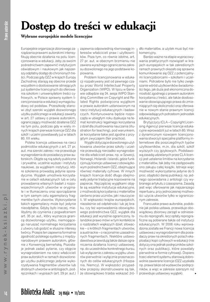 Prawo autorskie w w w. r y n e k- k s i a z k i.p l 14 Dostęp do treści w edukacji Wybrane europejskie modele licencyjne Europejskie organizacje zbiorowego zarządzania prawami autorskimi intensyfikują obecnie działania na polu licencjonowania w edukacji, żeby za swoim pośrednictwem zapewnić instytucjom oświatowym i naukowym jak najszerszy odpłatny dostęp do chronionych treści. Podczas gdy OZZ w krajach Europy Zachodniej starają się obecnie przede wszystkim o dostosowanie istniejących już systemów licencyjnych do oferowania szkołom i uniwersytetom treści cyfrowych, w Polsce sprawny system licencjonowania w edukacji wymaga budowy od podstaw. Przeszkodę stanowi zbyt szeroki wyjątek dozwolonego użytku publicznego w edukacji zawarty w art. 27 ustawy o prawie autorskim, ograniczający możliwość działania OZZ na tym polu, podczas gdy w wielu innych krajach pierwsze licencje OZZ dla szkół i uczelni powstawały już w latach 80. XX wieku. Polska licencja ustawowa na rzecz podmiotów edukacyjnych z art. 27 pr. aut. ma szeroki zakres i nie przewiduje wynagrodzenia do posiadaczy praw autorskich. Objęte są nią szkoły publiczne i prywatne, uczelnie wyższe i instytuty naukowe, za wyjątkiem instytucji, które szkolenia prowadzą jedynie sporadycznie. Wyjątek umożliwia korzystanie w celach edukacyjnych lub w celu prowadzenia własnych badań z rozpowszechnionych utworów w oryginale i w tłumaczeniu oraz sporządzanie w tym samym celu egzemplarzy fragmentów tych utworów. Wykorzystanie takich egzemplarzy może być jedynie nieodpłatne. Gdyby było inaczej, mielibyśmy do czynienia z pogwałceniem art. 35 pr. aut., który wyznacza granicę dozwolonego użytku, niemogącego naruszać normalnego korzystania z utworu lub godzić w słuszne interesy twórcy. Przepis ten zapewnia formalnie zgodność polskiego systemu z międzynarodowym prawem autorskim, głównie z Konwencją berneńską. Pozostaje jednak zadać pytanie, czy objęcie wynagrodzeniem na rzecz właścicieli praw autorskich w ramach dozwolonego użytku publicznego jedynie wykorzystywania fragmentów utworów lub drobnych utworów w antologiach, podręcznikach i wypisach (art. 29 pr. aut.) Biblioteka Analiz zapewnia odpowiednią równowagę interesów właścicieli praw i użytkowników. Poza tym, co równie istotne, art. 27 pr. aut. w obecnym brzmieniu nie zawiera wyraźnego ograniczenia zakresu dozwolonego na jego podstawie kopiowania. Problem licencjonowania w edukacji rozpatrywany jest od pewnego czasu przez World Intellectual Property Organization (WIPO). W lipcu w Genewie odbędzie się 24. sesja WIPO Standing Committee on Copyright and Related Rights poświęcona wyjątkom w prawie autorskim ustanowionym na rzecz instytucji edukacyjnych i badawczych. Kontynuowana będzie rozpoczęta w ubiegłym roku dyskusja na temat konstrukcji legalnego korzystania z dzieł dla zilustrowania nauczania (illustration for teaching), pod warunkiem, że korzystanie takie jest zgodne z przyjętym zwyczajem (fair practice). Wyjątki dotyczące dozwolonego użytkowania utworów przez szkoły i uczelnie przewidują nierzadko wynagrodzenie dla właścicieli praw, np. w Szwecji, Norwegii, Holandii i Islandii, gdzie funkcjonują licencje ustawowe z obowiązkowym pośrednictwem OZZ, obejmujące również materiały cyfrowe. W innych krajach licencje dość długo obejmowały jedynie tradycyjne kopiowanie na papierze. Najczęściej wyjątkami objęte są wszelkie instytucje edukacyjne, z możliwością korzystania z materiałów zarówno przez uczniów, jak i nauczycieli. W większości krajów europejskich, niezależnie od odpłatności lub jej braku, czy też wprowadzenia obowiązkowego pośrednictwa OZZ, wyjątek dla edukacji jest wyraźnie ograniczony. Islandzkie prawo mówi w tym kontekście o rozdziałach większych dzieł, słowackie – o krótkich fragmentach utworów, a austriackie – o racjonalnie uzasadnionych fragmentach. Niektóre ustawodawstwa przewidują także dalsze ograniczenia działania licencji ustawowej, np. do uczestników konkretnego kursu, lub wyłączenie z zakresu wyjątku utworów pierwotnie i wyłącznie przeznaczonych do celów edukacyjnych (Hiszpania, Niemcy). W większości przypadków przepisy skonstruowane są tak, że obowiązkowo trzeba wskazać źró- 29 maja • 11/2012 dło materiałów, a użytek musi być niekomercyjny. Bardzo ważne na etapie wypracowywania praktycznych rozwiązań w krajach europejskich w tak zakreślonych ramach prawnych okazało się sprawne komunikowanie się OZZ z potencjalnymi licencjobiorcami – szkołami i uczelniami. Potrzebne było nie tylko zwiększanie wśród użytkowników świadomości tego, jak duża jest ekonomiczna doniosłość zgodnego z prawem autorskim korzystania z treści, ale także dostosowanie obowiązującego prawa do zmieniających się okoliczności oraz oferowanie w nowym stanie prawnym licencji odpowiadających potrzebom jednostek edukacyjnych. Brytyjczycy (CLA – Copyright Licensing Agency) pierwsze licencje edukacyjne wprowadzili już w latach 80. Wraz z dynamicznym rozwojem licencjonowania stworzyli specjalne platformy internetowe dla poszczególnych typów użytkowników, m.in. dla szkół, szkół wyższych czy językowych. Podstawową zasadą udzielanych przez CLA licencji jest ustalenie limitów na korzystanie z materiałów, tak żeby nie zastępowało ono zakupu całej książki. Istnieje więc możliwość wykorzystania jedynie do 5 proc. objętości danej publikacji, np. jednego opowiadania z antologii czy wybranego artykułu z czasopisma. Zasadą jest więc oferowanie jak najszerszego repertuaru, przy jednoczesnej możliwości użycia utworów tylko w ograniczonym zakresie. Francuskie prawo autorskie, podobnie jak polska ustawa, przewiduje obowiązkowy zbiorowy zarząd w odniesieniu do reprografii, lecz opłaty reprograficzne są pobierane także od instytucji edukacyjnych. W 2006 roku wprowadzona została we Francji nowa lice