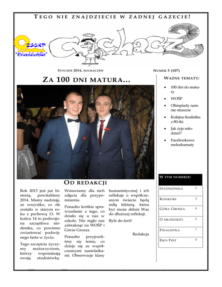 T EGO NIE ZNAJDZIECIE W ŻADNEJ GAZECIE! L ISTOPAD 2013, SOCHACZEW S TYCZEŃ 2014, N UMER 5 (107) SOCHACZEW Z A 100 DNI MATURA ... W AŻNE Tego szczęścia życzymy maturzystom, którzy wspominają swoją studniówkę. Wstawiamy dla nich zdjęcia dla przypomnienia. Ponadto krótkie sprawozdanie z tego, co działo się u nas w szkole. Nie mgło nas zabraknąć na WOŚP i Górze Grosza. Ponadto przyjrzeliśmy się temu, co dzieje się ze współczesnymi nastolatkami. Obserwacje klasy 100 dni do matury WOŚP Olimpiady nam nie straszne Kolejna finalistka z 80-tki Jak żyje młodzież? Facebookowe melodramaty W TYM NUMERZE : O D REDAKCJI Rok 2013 jest już historią, powitaliśmy 2014. Mamy nadzieję, ze wszystko, co złe zostało w starym roku z pechową 13. W końcu 14 to podwojona szczęśliwa siódemka, co powinno zwiastować podwójnego farta w życiu. TEMATY : humanistycznej i ich refleksje o współczesnym świecie będą miłą lekturą, która być może skłoni Was do dłuższej refleksji. Byle do ferii! Redakcja S TUDNIÓWKA 2 K ONKURS 3 G ÓRA G ROSZA 4 O MŁODZIEŻY 5 F INALISTKA 7 E KO -T EST 9 S S TR TR .. 2 2 L ISTOPAD 2013, SOCHACZEW NA STUDNIÓWCE 18 stycznia ponad 350 osób z Zespołu Szkół Centrum Kształcenia Praktycznego bawiło się na studniówce – uczniowie dwóch klas liceum ogólnokształcącego i czterech technikum. Od kilku lat ten najważniejszy dla maturzystów bal odbywa się poza szkołą – w tym roku wybór padł na Zajazd Dukat. Salę balową wypełnili przyszli maturzyści, nauczyciele, rodzice i zaproszeni goście, wśród których starostwo powiatowe reprezentował Bogusław Bęzel dyrektor Powiatowego Zespołu Edukacji. Organizatorami i gospodarzami studniówki byli rodzice, to oni przyjęli na siebie najważniejsze obowiązki – ich działaniami kierował Komitet Organizacyjny na czele z przewodniczącym Rady Rodziców Markiem Lachem. W pierwszej części studniówki, mającej charakter oficjalny, przedstawiciele poszczególnych klas w imieniu uczniów dziękowali właśnie rodzicom - organizatorom i sponsorom tego wyjątkowego balu - a także nauczycielom, zwłaszcza wychowawcom, wspierającym działania rodziców. Początek studniówki to polonez w wykonaniu kilkudziesięciu par - w pierwszej parze dyrektor szkoły Julia Jakubowska i uczeń klasy IV at Cezary Kacprzak. Tuż za ni- mi w korowodzie tanecznym uczniowie wraz z wychowawcami. Układ choreograficzny – przygotowany przez Iwonę Pakulską - i ilość par imponujące. Szkolną tradycją jest również walc profesorski – nauczyciele tańczą go z uczniami. Na szczęście walc profesorski planowany jest wcześniej i nauczyciele oraz uczniowie mają czas, by się przygotować. W końcu walc profesorski nie może być gorszy od poloneza uczniowskiego! Studniówka zwykle budzi ogromne emocje – dziewczyny chcą zabłysnąć, wyróżnić się, chcą być widoczne na balu i wielu to się udaje – kilka ekstrawaganckich kreacji można było dostrzec na parkiecie. Uczennice, jak zawsze, nie zawiodły – wszyscy zgodnie podziwiali piękne makijaże niczym z Glamour. Sukienki różne: szyte na miarę, kupione w butikach lub zwykłych sieciówkach, na ogół krótkie, przede wszystkim czarne, chociaż były też kolorowe. Dziewczyny zachwycały powiewnymi tiulowymi spódnicami i bujnymi lokami na głowach. Zdarzały się oczywiście kreacje odważne – niektóre lubią eksperymentować i szokować. Jednak w taką czarodziejską noc można pozwolić sobie na odrobinę luzu i ekstrawagancji. Chłopcy tradycyjnie postawili na klasyczną elegancję i zdecydowali się na garnitury, w ich przypadku obyło się bez ekstrawagancji. W tym roku na parkiecie swoją obecność wyraźnie zaznaczyły uczennice klasy IV d technikum – m.in. zaśpiewały swojemu wychowawcy znany szlagier: „Wymienię cię na nowszy model”. Wychowawca nie pozostał im dłużny i wyrecytował humorystyczny wiersz, w którym deklarował, że rozprawi się z każdym, kto wejdzie w drogę jego wychowankom. Tańce trwały do białego rana, zespół Sabat grał, uczniowie szaleli na parkiecie - a byli niezmordowani. Oczywiście tańce przerywano posiłkami i licznymi sesjami fotograficznymi: indywidualnymi a także zbiorowymi – co prawda królowej balu oficjalnie nie wybrano, ale faworytek i kandydatek było wiele. Może w przyszłym roku zorganizujemy konkurs na Miss Studniówki bądź najlepszą sweet focię ze studniówki? Kto wie? Grażyna BolimowskaGajda T YTUŁSOCHACZEW BIULETYNU L ISTOPAD 2013, S S TR TR .. 3 3 D EM M UTIGEN GEHÖRT DIE W ELT ! - DO ODWAŻNYCH ŚWIAT NALEŻY , CZYLI POTYCZKI Z NIEMIECKIMI PRZYSŁOWIAMI 27 stycznia uczniowie sprawdzili się w szkolnym etapie "„Konkursu przysłów języka niemieckiego”. W czasie nauki języka obcego w pewnej chwili przychodzi pora na zapoznanie się ze specyficznymi dla języka obcego zwrotami, frazeologizmami i przysłowiami wyjątkowymi dla każdego z języków. Jest to niezbędne w do naturalnego posługiwania się językiem i zrozumieniem . W konkursie uczestnicy zmierzyli się z przysłowiami w języku niemieckim – bardzo popularnym, ale nie cieszącym się dobrą sławą wśród uczniów. Frekwencja dopisała – 17 uczniom z naszej szkoły nie straszny jest język niemiecki. Pytania nie sprawiły im większej trudności – możemy to zauważyć na zdjęciach. Przez cały konkurs uśmiechy nie schodziły im z twarzy. MC S TYCZEŃ 2014, S TR . 4 SOCHACZEW Z AGRALIŚMY Z ORKIESTRĄ Tradycją jest, że w drugi weekend stycznia tłumy wolontariuszy w różnym wieku wychodzi na ulicę, a wraz z tym zalewa nas fala serduszek Wielkiej Orkiestry Świątecznej P o m o c y . W tym roku po raz kolejny postanowiliśmy przyłączyć się do zbiórki Orkiestry po raz dwudziesty drugi zorganizowanej pod dyrygenturą Jurka Owsiaka. Organizatorkami zbiórki były p. K. Ostrzyżak i p. A. Świn o g a . 17 stycznia odbyła się loteria fantowa, na której mogliśmy wylosować