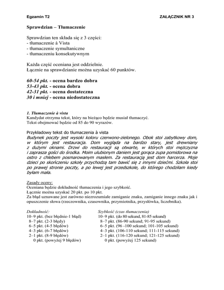 ZAŁĄCZNIK NR 3 Egzamin T2 Sprawdzian – Tłumaczenie Sprawdzian ten składa się z 3 części: - tłumaczenie à Vista - tłumaczenie symultaniczne - tłumaczeniu konsekutywnym Każda część oceniana jest oddzielnie. Łącznie na sprawdzianie można uzyskać 60 punktów. 60-54 pkt. - ocena bardzo dobra 53-43 pkt. - ocena dobra 42-31 pkt. - ocena dostateczna 30 i mniej - ocena niedostateczna 1. Tłumaczenie à vista Kandydat otrzyma tekst, który na bieżąco będzie musiał tłumaczyć. Tekst obejmować będzie od 85 do 90 wyrazów. Przykładowy tekst do tłumaczenia à vista Budynek poczty jest wysoki koloru czerwono-zielonego. Obok stoi zabytkowy dom, w którym jest restauracja. Dom wygląda na bardzo stary, jest drewniany z dużymi oknami. Drzwi do restauracji są otwarte, w których stoi mężczyzna i zaprasza gości do środka. Moim ulubionym daniem jest gorąca zupa pomidorowa na ostro z chlebem posmarowanym masłem. Za restauracją jest dom harcerza. Moje dzieci po skończeniu szkoły przychodzą tam bawić się z innymi dziećmi. Szkoła stoi po prawej stronie poczty, a po lewej jest przedszkole, do którego chodziłam kiedy byłam mała. Zasady oceny: Oceniana będzie dokładność tłumaczenia i jego szybkość. Łącznie można uzyskać 20 pkt. po 10 pkt. Za błąd uznawane jest zarówno niezrozumiałe zamiganie znaku, zamiganie innego znaku jak i opuszczenie słowa (rzeczownika, czasownika, przymiotnika, przysłówka, liczebnika). Dokładność: 10–9 pkt. (bez błędnie-1 błąd) 8–7 pkt. (2-3 błędy) 6–5 pkt. (4-5 błędów) 4–3 pkt. (6-7 błędów) 2–1 pkt. (8-9 błędów) 0 pkt. (powyżej 9 błędów) Szybkość (czas tłumaczenia) 10–9 pkt. (do 80 sekund, 81-85 sekund) 8–7 pkt. (86-90 sekund; 91-95 sekund) 6–5 pkt. (96 -100 sekund; 101-105 sekund) 4–3 pkt. (106-110 sekund; 111-115 sekund) 2–1 pkt. (116-120 sekund; 121-125 sekund) 0 pkt. (powyżej 125 sekund) 2. Tłumaczenie symultaniczne Tłumaczenie na bieżąco, materiału odtwarzanego, trwającego ok. 5 minut. Zasady oceny: Oceniana będzie dokładność tłumaczenia i jego szybkość. Łącznie można uzyskać 30 pkt. (10 pkt. - dokładność, 20 pkt. - szybkość) Za błąd uznawane jest zarówno niezrozumiałe zamiganie znaku, zamiganie innego znaku jak i opuszczenie słowa (rzeczownika, czasownika, przymiotnika, przysłówka, liczebnika). Dokładność: 10–9 pkt. (bez błędnie-1 błąd) 8–7 pkt. (2-3 błędy) 6–5 pkt. (4-5 błędów) 4–3 pkt. (6-7 błędów) 2–1 pkt. (8-9 błędów) 0 pkt. (powyżej 9 błędów) Szybkość (czas od zakończenia odtwarzania do zakończenia tłumaczenia) 20 pkt.(równocześnie z odtwarzanym tekstem) 19-18 pkt. (do 3 sekund; 4-5 sekund) 17–14 pkt. (6,7,8,9 sekund) 13–11 pkt. (10,11,12 sekund) 10–8 pkt. (13,14,15 sekund) 0 pkt. (powyżej 15 sekund) 3. Tłumaczeniu konsekutywnym – Należy przetłumaczyć (z języka migowego na język polski) obejrzany wcześniej, trzy minutowy materiału po zakończaniu jego prezentacji. Zasady oceny: Oceniana będzie dokładność tłumaczenia i jego szybkość. Łącznie można uzyskać 10 pkt (po 5 pkt). Dokładność: 5 pkt. (bez błędnie, 1 błąd) 4 pkt. (2 błędy) 3 pkt. (3 błędów) 2 pkt. (4 błędów) 1 pkt. (5 błędów) 0 pkt. (powyżej 5 błędów) Szybkość (całkowity czas tłumaczenia obejrzanego materiału) 5 pkt. (do 120 sekund) 4 pkt. (121-130 sekund) 3 pkt. (131-140 sekund) 2 pkt. (141-150 sekund) 1 pkt. (151-155 sekund) 0 pkt. (powyżej 155 sekund)