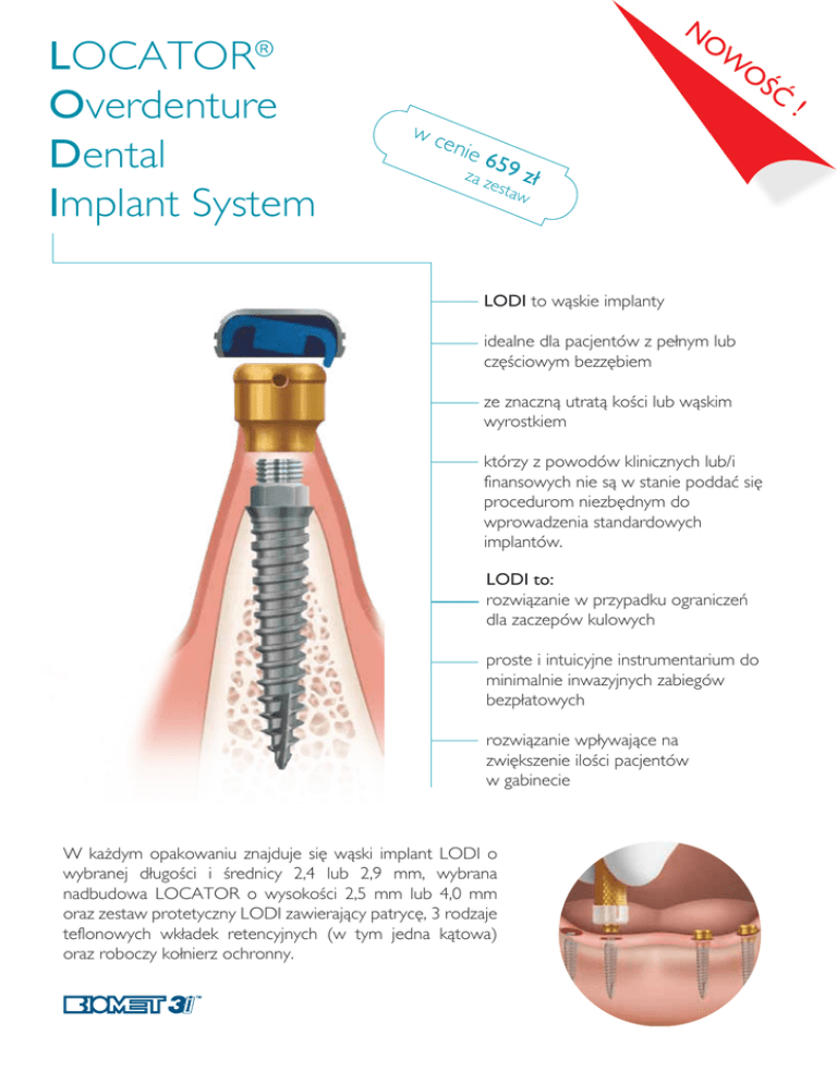 LOCATOR® Overdenture Dental Implant System NO W O ŚĆ wc enie 65 za z 9 zł esta w LODI to wąskie implanty idealne dla pacjentów z pełnym lub częściowym bezzębiem ze znaczną utratą kości lub wąskim wyrostkiem którzy z powodów klinicznych lub/i finansowych nie są w stanie poddać się procedurom niezbędnym do wprowadzenia standardowych implantów. LODI to: rozwiązanie w przypadku ograniczeń dla zaczepów kulowych proste i intuicyjne instrumentarium do minimalnie inwazyjnych zabiegów bezpłatowych rozwiązanie wpływające na zwiększenie ilości pacjentów w gabinecie W każdym opakowaniu znajduje się wąski implant LODI o wybranej długości i średnicy 2,4 lub 2,9 mm, wybrana nadbudowa LOCATOR o wysokości 2,5 mm lub 4,0 mm oraz zestaw protetyczny LODI zawierający patrycę, 3 rodzaje teflonowych wkładek retencyjnych (w tym jedna kątowa) oraz roboczy kołnierz ochronny. ! Nadbudowa LOCATOR wys.: 2,5 lub 4mm Komponenty protetyczne LODI ZESTAW ZAWIERA: 1x Implant 1x Nadbudowa LOCATOR 1x Komponenty protetyczne LODI Patryca Implant śr.: 2,4 lub 2,9mm Retencja 1350 g Skrócony informator zamówieniowy IMPLANT średnica [mm] 2,4 WYSOKOŚĆ LOCATOR [mm] długość [mm] 10 12 14 10 12 14 2,9 Kaseta PREMIUM NADBUDOWA LOCATOR 4,0 2,5 7450 7455 7451 7452 7456 7457 7460 7465 7461 7462 7466 7467 7351 7352 7450 7451 7452 7455 7456 7457 7460 7461 7462 7465 7466 7467 Kod produktu: 7422 7351 Wyłączny przedstawiciel BIOMET 3i w Europie Środkowej: Dental Depot Wasio Siedziba główna: al. Lipowa 32, 53-124 Wrocław tel.: +48 71 335 70 71, fax: +48 71 335 70 90 www.dental-depot.com, [email protected] Retencja kątowa 680 g KODY PRODUKTÓW LOCATOR® Overdenture Dental Implant System Retencja 680 g 7352 Oddział Warszawa: ul. Konstancińska 2/78, 02-942 Warszawa tel.: +48 22 646 24 73, fax: +48 22 646 30 13 www.dental-depot.com, [email protected]