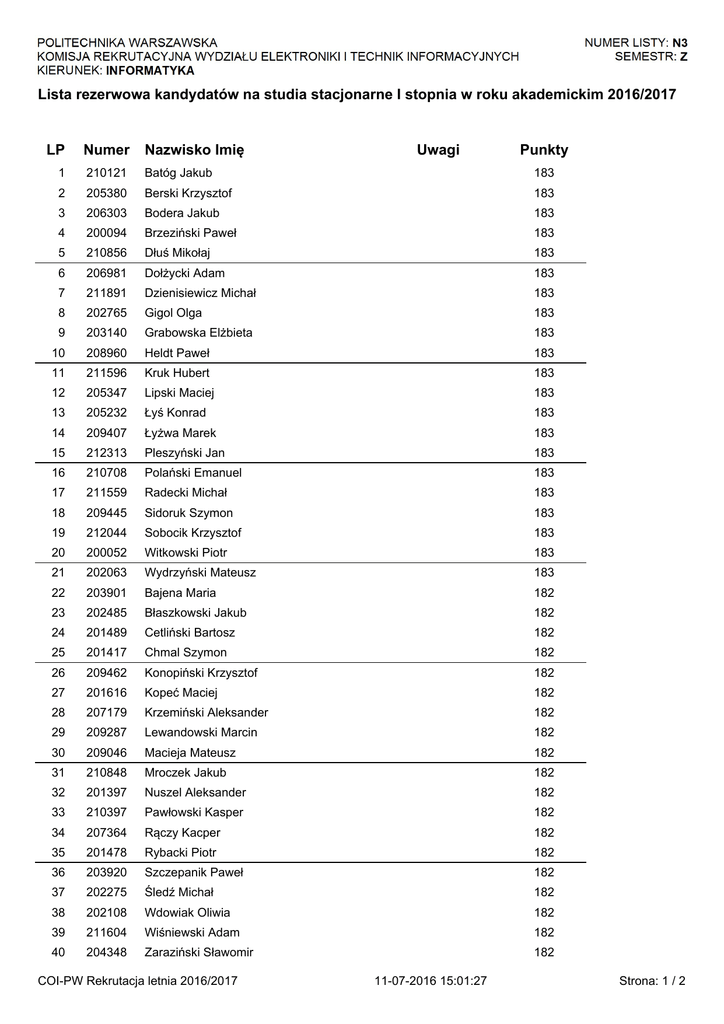 Lista rezerwowa kandydatów na studia stacjonarne I stopnia w roku akademickim 2016/2017 LP Numer Nazwisko Imię 1 210121 Batóg Jakub 183 2 205380 Berski Krzysztof 183 3 206303 Bodera Jakub 183 4 200094 Brzeziński Paweł 183 5 210856 Dłuś Mikołaj 183 6 206981 Dołżycki Adam 183 7 211891 Dzienisiewicz Michał 183 8 202765 Gigol Olga 183 9 203140 Grabowska Elżbieta 183 10 208960 Heldt Paweł 183 11 211596 Kruk Hubert 183 12 205347 Lipski Maciej 183 13 205232 Łyś Konrad 183 14 209407 Łyżwa Marek 183 15 212313 Pleszyński Jan 183 16 210708 Polański Emanuel 183 17 211559 Radecki Michał 183 18 209445 Sidoruk Szymon 183 19 212044 Sobocik Krzysztof 183 20 200052 Witkowski Piotr 183 21 202063 Wydrzyński Mateusz 183 22 203901 Bajena Maria 182 23 202485 Błaszkowski Jakub 182 24 201489 Cetliński Bartosz 182 25 201417 Chmal Szymon 182 26 209462 Konopiński Krzysztof 182 27 201616 Kopeć Maciej 182 28 207179 Krzemiński Aleksander 182 29 209287 Lewandowski Marcin 182 30 209046 Macieja Mateusz 182 31 210848 Mroczek Jakub 182 32 201397 Nuszel Aleksander 182 33 210397 Pawłowski Kasper 182 34 207364 Rączy Kacper 182 35 201478 Rybacki Piotr 182 36 203920 Szczepanik Paweł 182 37 202275 Śledź Michał 182 38 202108 Wdowiak Oliwia 182 39 211604 Wiśniewski Adam 182 40 204348 Zaraziński Sławomir 182 COI-PW Rekrutacja letnia 2016/2017 Uwagi 11-07-2016 15:01:27 Punkty Strona: 1 / 2 Lista rezerwowa kandydatów na studia stacjonarne I stopnia w roku akademickim 2016/2017 LP Numer Nazwisko Imię 41 200054 Bieniek Adam 181 42 201019 Bojanowicz Piotr 181 43 203628 Cholewa Patryk 181 44 210732 Ferliński Jakub 181 45 205822 Jabłońska Maja 181 46 205673 Jurek Wojciech 181 47 209359 KONIK PIOTR 181 48 208901 Łuczyński Piotr 181 49 210897 Mikucki Aleksander 181 50 203950 Pajączkowski Kamil 181 51 206122 Podurgiel Krzysztof 181 52 210919 Sipak Wojciech 181 53 200516 Tymiński Kamil 181 54 208886 Woźniak Michał 181 55 204168 Ziętecka Pola 181 56 202356 Blasiak Miłosz 180 57 211574 Cegliński Robert 180 58 202271 Hawliczek Grzegorz 180 59 205861 Karwowski Bartłomiej 180 60 207729 Karwowski Mateusz 180 61 209486 Koczan Mateusz 180 62 203953 Kogut Beata 180 63 202538 Kwaśniak Patryk 180 64 208091 Musiatowicz Wojciech 180 65 207099 Odachowski Wojciech 180 66 203372 Pogodziński Piotr 180 67 209354 Romaniuk Mateusz 180 68 211842 Stęczniewski Michał 180 69 200140 Zalewska Joanna 180 COI-PW Rekrutacja letnia 2016/2017 Uwagi 11-07-2016 15:01:27 Punkty Strona: 2 / 2