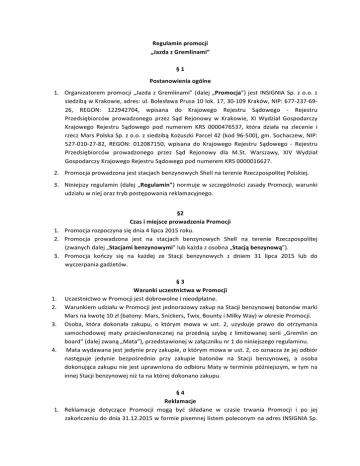 Regulamin promocji „Jazda z Gremlinami” § 1 Postanowienia ogólne 1. Organizatorem promocji „Jazda z Gremlinami” (dalej „Promocja”) jest INSIGNIA Sp. z o.o. z siedzibą w Krakowie, adres: ul. Bolesława Prusa 10 lok. 17, 30-‐109 Kraków, NIP: 677-‐237-‐69-‐ 26, REGON: 122942704, wpisana do Krajowego Rejestru Sądowego -‐ Rejestru Przedsiębiorców prowadzonego przez Sąd Rejonowy w Krakowie, XI Wydział Gospodarczy Krajowego Rejestru Sądowego pod numerem KRS 0000476537, która działa na zlecenie i rzecz Mars Polska Sp. z o.o. z siedzibą Kożuszki Parcel 42 (kod 96-‐500), gm. Sochaczew, NIP: 527-‐010-‐27-‐82, REGON: 012087150, wpisana do Krajowego Rejestru Sądowego -‐ Rejestru Przedsiębiorców prowadzonego przez Sąd Rejonowy dla M.St. Warszawy, XIV Wydział Gospodarczy Krajowego Rejestru Sądowego pod numerem KRS 0000016627. 2. Promocja prowadzona jest stacjach benzynowych Shell na terenie Rzeczpospolitej Polskiej. 3. Niniejszy regulamin (dalej „Regulamin") normuje w szczególności zasady Promocji, warunki udziału w niej oraz tryb postępowania reklamacyjnego. 1. 2. 3. 1. 2. 3. 4. 1. §2 Czas i miejsce prowadzenia Promocji Promocja rozpoczyna się dnia 4 lipca 2015 roku. Promocja prowadzona jest na stacjach benzynowych Shell na terenie Rzeczpospolitej (zwanych dalej „Stacjami benzynowymi” lub każda z osobna „Stacją benzynową”). Promocja kończy się na każdej ze Stacji benzynowych z dniem 31 lipca 2015 lub do wyczerpania gadżetów. § 3 Warunki uczestnictwa w Promocji Uczestnictwo w Promocji jest dobrowolne i nieodpłatne. Warunkiem udziału w Promocji jest jednorazowy zakup na Stacji benzynowej batonów marki Mars na kwotę 10 zł (batony: Mars, Snickers, Twix, Bounty i Milky Way) w okresie Promocji. Osoba, która dokonała zakupu, o którym mowa w ust. 2, uzyskuje prawo do otrzymania samochodowej maty przeciwsłonecznej na przednią szybę z limitowanej serii „Gremlin on board” (dalej zwaną „Mata”), przedstawionej w załączniku nr 1 do niniejszego regulaminu. Mata wydawana jest jedynie przy zakupie, o którym mowa w ust. 2, co oznacza że jej odbiór następuje jedynie bezpośrednio przy zakupie batonów na Stacji benzynowej, a osoba dokonująca zakupu nie jest uprawniona do odbioru Maty w terminie późniejszym, w tym na innej Stacji benzynowej niż ta na której dokonano zakupu. § 4 Reklamacje Reklamacje dotyczące Promocji mogą być składane w czasie trwania Promocji i po jej zakończeniu do dnia 31.12.2015 w formie pisemnej listem poleconym na adres INSIGNIA Sp. 2. 3. 4. 5. 6. 7. z o.o. z siedzibą w Krakowie, ul. Bolesława Prusa 10 lok. 17, 30-‐109 Kraków z dopiskiem „Jazda z Gremlinami” lub mailowo na adres e-‐mail: [email protected] . O zachowaniu terminu, o którym mowa w zdaniu poprzednim decyduje data wpływu reklamacji do Organizatora. Reklamacje wpływające po terminie określonym powyżej w ust. 1 nie będą rozpatrywane. Reklamacje winny zawierać imię, nazwisko i adres korespondencyjny zgłaszającego oraz zwięzłe wskazanie przyczyn reklamacji. Skutecznie złożone reklamacje będą rozpatrywane w terminie 21 dni od daty ich otrzymania, a zgłaszający reklamację zostanie powiadomiony o sposobie rozpatrzenia reklamacji na podany adres e-‐mail lub listem poleconym. Regulamin jest dostępny na Stacjach benzynowych oraz w siedzibie Organizatora. Organizator zastrzega sobie prawo dokonywania modyfikacji postanowień Regulaminu, o ile zmiany te nie wpływają niekorzystnie na prawa już nabyte w Promocji. Wszelkie informacje na temat Promocji można uzyskać kontaktując się z Organizatorem pod adresem e-‐mail : [email protected]. Załącznik nr. 1 – samochodowa mata przeciwsłoneczna na przednią szybę