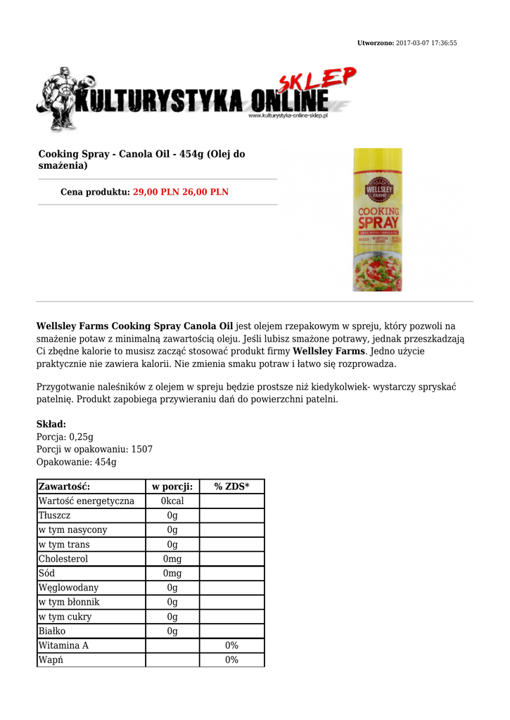 Utworzono: 2017-03-07 17:36:55 Cooking Spray - Canola Oil - 454g (Olej do smażenia) Cena produktu: 29,00 PLN 26,00 PLN Wellsley Farms Cooking Spray Canola Oil jest olejem rzepakowym w spreju, który pozwoli na smażenie potaw z minimalną zawartością oleju. Jeśli lubisz smażone potrawy, jednak przeszkadzają Ci zbędne kalorie to musisz zacząć stosować produkt firmy Wellsley Farms. Jedno użycie praktycznie nie zawiera kalorii. Nie zmienia smaku potraw i łatwo się rozprowadza. Przygotwanie naleśników z olejem w spreju będzie prostsze niż kiedykolwiek- wystarczy spryskać patelnię. Produkt zapobiega przywieraniu dań do powierzchni patelni. Skład: Porcja: 0,25g Porcji w opakowaniu: 1507 Opakowanie: 454g Zawartość: Wartość energetyczna w porcji: % ZDS* 0kcal Tłuszcz 0g w tym nasycony 0g w tym trans 0g Cholesterol 0mg Sód 0mg Węglowodany 0g w tym błonnik 0g w tym cukry 0g Białko 0g Witamina A 0% Wapń 0% Witamina C 0% Żelazo 0% Składniki: olej rzepakowy, lecytyna sojowa, krzemian dimetylu (zapobiegający pienieniu się). Sposób użycia: ● ● ● Wstrząsnąć przed użyciem, skierować aplikator zgodnie ze strzałką i nacisnąć. Przekręcić puszkę o 45 stopni od pionu i rozpylać z odległości 15 – 30 cm od powierzchni. Naciskając przez 1/3 sekundy zużywa się około 0.25 g Można spryskać produkt surowy i obtoczyć go w przyprawach. Adres: http://www.ko.sklep.pl/ Telefon: kom. 782 010 880 Email: [email protected]
