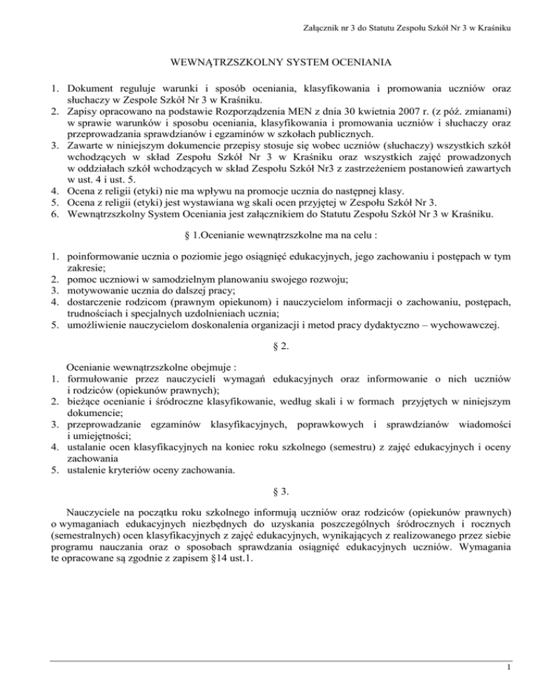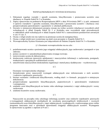 Załącznik nr 3 do Statutu Zespołu Szkół Nr 3 w Kraśniku WEWNĄTRZSZKOLNY SYSTEM OCENIANIA 1. Dokument reguluje warunki i sposób oceniania, klasyfikowania i promowania uczniów oraz słuchaczy w Zespole Szkół Nr 3 w Kraśniku. 2. Zapisy opracowano na podstawie Rozporządzenia MEN z dnia 30 kwietnia 2007 r. (z póź. zmianami) w sprawie warunków i sposobu oceniania, klasyfikowania i promowania uczniów i słuchaczy oraz przeprowadzania sprawdzianów i egzaminów w szkołach publicznych. 3. Zawarte w niniejszym dokumencie przepisy stosuje się wobec uczniów (słuchaczy) wszystkich szkół wchodzących w skład Zespołu Szkół Nr 3 w Kraśniku oraz wszystkich zajęć prowadzonych w oddziałach szkół wchodzących w skład Zespołu Szkół Nr3 z zastrzeżeniem postanowień zawartych w ust. 4 i ust. 5. 4. Ocena z religii (etyki) nie ma wpływu na promocje ucznia do następnej klasy. 5. Ocena z religii (etyki) jest wystawiana wg skali ocen przyjętej w Zespołu Szkół Nr 3. 6. Wewnątrzszkolny System Oceniania jest załącznikiem do Statutu Zespołu Szkół Nr 3 w Kraśniku. § 1.Ocenianie wewnątrzszkolne ma na celu : 1. poinformowanie ucznia o poziomie jego osiągnięć edukacyjnych, jego zachowaniu i postępach w tym zakresie; 2. pomoc uczniowi w samodzielnym planowaniu swojego rozwoju; 3. motywowanie ucznia do dalszej pracy; 4. dostarczenie rodzicom (prawnym opiekunom) i nauczycielom informacji o zachowaniu, postępach, trudnościach i specjalnych uzdolnieniach ucznia; 5. umożliwienie nauczycielom doskonalenia organizacji i metod pracy dydaktyczno – wychowawczej. § 2. Ocenianie wewnątrzszkolne obejmuje : 1. formułowanie przez nauczycieli wymagań edukacyjnych oraz informowanie o nich uczniów i rodziców (opiekunów prawnych); 2. bieżące ocenianie i śródroczne klasyfikowanie, według skali i w formach przyjętych w niniejszym dokumencie; 3. przeprowadzanie egzaminów klasyfikacyjnych, poprawkowych i sprawdzianów wiadomości i umiejętności; 4. ustalanie ocen klasyfikacyjnych na koniec roku szkolnego (semestru) z zajęć edukacyjnych i oceny zachowania 5. ustalenie kryteriów oceny zachowania. § 3. Nauczyciele na początku roku szkolnego informują uczniów oraz rodziców (opiekunów prawnych) o wymaganiach edukacyjnych niezbędnych do uzyskania poszczególnych śródrocznych i rocznych (semestralnych) ocen klasyfikacyjnych z zajęć edukacyjnych, wynikających z realizowanego przez siebie programu nauczania oraz o sposobach sprawdzania osiągnięć edukacyjnych uczniów. Wymagania te opracowane są zgodnie z zapisem §14 ust.1. 1 Wewnątrzszkony system oceniania § 4. Wychowawca klasy na początku każdego roku szkolnego informuje uczniów oraz rodziców (opiekunów prawnych) o zasadach oceniania zachowania w szkole i kryteriach, zawartych w § 15 ust.5 WSO oraz o skutkach ustalenia uczniowi nagannej rocznej oceny klasyfikacyjnej zachowania. § 5. Oceny są jawne zarówno dla ucznia, jak i jego rodziców (opiekunów prawnych). Nauczyciel powinien poprawić pisemne prace kontrolne w terminie dwóch tygodni. Sprawdzone i ocenione pisemne prace kontrolne uczeń i jego rodzice (prawni opiekunowie) otrzymują do wglądu wg poniższych zasad: 1. uczniowie zapoznają się z poprawionymi pracami pisemnymi w szkole po rozdaniu ich przez nauczyciela; 2. rodzice uczniów mają wgląd do poprawionych prac pisemnych swoich dzieci w szkole po ustaleniu terminu z nauczycielem uczącym danego przedmiotu. § 6. Na prośbę ucznia lub jego rodziców (prawnych opiekunów) nauczyciel ustalający ocenę powinien ją ustnie uzasadnić. § 7. 1. Nauczyciel jest obowiązany, na podstawie opinii publicznej poradni psychologiczno-pedagogicznej, w tym publicznej poradni specjalistycznej, dostosować wymagania edukacyjne, do indywidualnych potrzeb psychofizycznych i edukacyjnych ucznia, u którego stwierdzono zaburzenia i odchylenia rozwojowe lub specyficzne trudności w uczeniu się, uniemożliwiające sprostanie tym wymaganiom, z zastrzeżeniem ust. 1a i 1b. 1a. Dostosowanie wymagań edukacyjnych do indywidualnych potrzeb ucznia, u którego stwierdzono specyficzne trudności w uczeniu się, uniemożliwiające sprostanie tym wymaganiom, następuje także na podstawie opinii niepublicznej poradni psychologiczno-pedagogicznej, w tym niepublicznej poradni specjalistycznej, o której mowa w art. 71b ust. 3b Ustawy o Systemie Oświaty z dn. 7 września 1991r. (Dz. U. z 2004r Nr 256 poz. 2572 z późniejszymi zmianami) , zwanej dalej "ustawą", z zastrzeżeniem ust. 1b. 1b. W przypadku ucznia posiadającego orzeczenie o potrzebie kształcenia specjalnego albo indywidualnego nauczania dostosowanie wymagań edukacyjnych do indywidualnych potrzeb ucznia może nastąpić na podstawie tego orzeczenia. § 8. Przy ustalaniu oceny z wychowania fizycznego – jeżeli nie jest przedmiotem kierunkowym – należy w szczególności brać pod uwagę wysiłek wkładany przez ucznia w wywiązywanie się z obowiązków wynikających ze specyfiki tych zajęć. 1. W uzasadnionych przypadkach uczeń może być zwolniony na czas określony z zajęć z wychowania fizycznego, informatyki, technologii informacyjnej lub zajęć komputerowych. 2. Decyzję o zwolnieniu ucznia z zajęć podejmuje dyrektor szkoły na podstawie opinii o ograniczonych możliwościach uczestniczenia w tych zajęciach, wydanej przez lekarza i na czas określony w tej opinii. 3. Dyrektor szkoły na pisemny wniosek rodziców (prawnych opiekunów) oraz na postawie opinii publicznej poradni psychologiczno – pedagogicznej, w tym publicznej poradni specjalistycznej albo niepublicznej poradni psychologiczno-pedagogicznej, w tym niepublicznej poradni specjalistycznej, o których mowa w art. 71b ust.3b ustawy o systemie oświaty, może zwolnić ucznia z wadą słuchu, 2 Załącznik nr 3 do Statutu Zespołu Szkół Nr 3 w Kraśniku głęboką dysleksją rozwojową, ze sprzężonymi niepełnosprawnościami lub z autyzmem z nauki drugiego języka obcego.