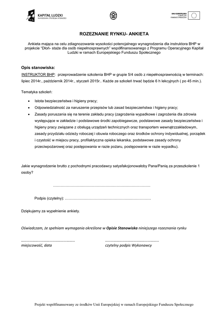 ROZEZNANIE RYNKU- ANKIETA Ankieta mająca na celu zdiagnozowanie wysokości potencjalnego wynagrodzenia dla instruktora BHP w projekcie “Dłoń- staże dla osób niepełnosprawnych” współfinansowanego z Programu Operacyjnego Kapitał Ludzki w ramach Europejskiego Funduszu Społecznego Opis stanowiska: INSTRUKTOR BHP: przeprowadzenie szkolenia BHP w grupie 5/4 osób z niepełnosprawnością w terminach: lipiec 2014r., październik 2014r., styczeń 2015r.. Każde ze szkoleń trwać będzie 6 h lekcyjnych ( po 45 min.). Tematyka szkoleń: Istota bezpieczeństwa i higieny pracy; Odpowiedzialność za naruszenie przepisów lub zasad bezpieczeństwa i higieny pracy; Zasady poruszania się na terenie zakładu pracy (zagrożenia wypadkowe i zagrożenia dla zdrowia występujące w zakładzie i podstawowe środki zapobiegawcze, podstawowe zasady bezpieczeństwa i higieny pracy związane z obsługą urządzeń technicznych oraz transportem wewnątrzzakładowym, zasady przydziału odzieży roboczej i obuwia roboczego oraz środków ochrony indywidualnej, porządek i czystość w miejscu pracy, profilaktyczna opieka lekarska, podstawowe zasady ochrony przeciwpożarowej oraz postępowania w razie pożaru, postępowanie w razie wypadku). Jakie wynagrodzenie brutto z pochodnymi pracodawcy satysfakcjonowałoby Pana/Panią za przeszkolenie 1 osoby? …………………………………………………………………… Podpis (czytelny): …………………………………………………………… Dziękujemy za wypełnienie ankiety. Oświadczam, że spełniam wymagania określone w Opisie Stanowiska niniejszego rozeznania rynku ………………………………………………… miejscowość, data ………………………………………………… czytelny podpis Wykonawcy Projekt współfinansowany ze środków Unii Europejskiej w ramach Europejskiego Funduszu Społecznego