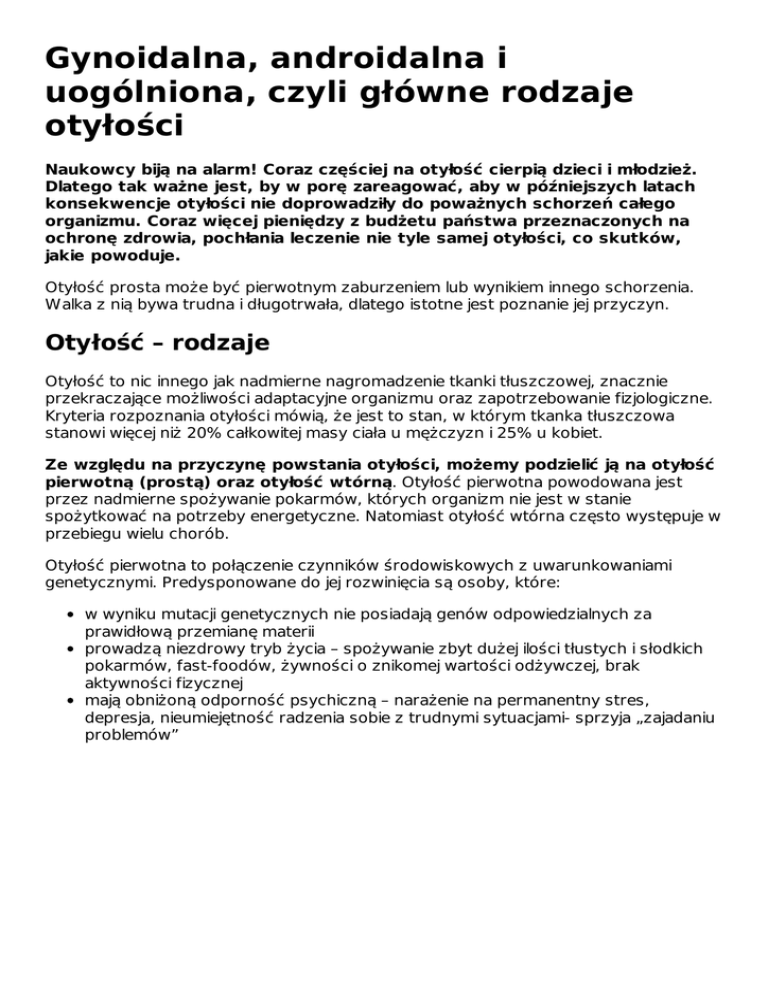 Gynoidalna, androidalna i uogólniona, czyli główne rodzaje otyłości Naukowcy biją na alarm! Coraz częściej na otyłość cierpią dzieci i młodzież. Dlatego tak ważne jest, by w porę zareagować, aby w późniejszych latach konsekwencje otyłości nie doprowadziły do poważnych schorzeń całego organizmu. Coraz więcej pieniędzy z budżetu państwa przeznaczonych na ochronę zdrowia, pochłania leczenie nie tyle samej otyłości, co skutków, jakie powoduje. Otyłość prosta może być pierwotnym zaburzeniem lub wynikiem innego schorzenia. Walka z nią bywa trudna i długotrwała, dlatego istotne jest poznanie jej przyczyn. Otyłość – rodzaje Otyłość to nic innego jak nadmierne nagromadzenie tkanki tłuszczowej, znacznie przekraczające możliwości adaptacyjne organizmu oraz zapotrzebowanie fizjologiczne. Kryteria rozpoznania otyłości mówią, że jest to stan, w którym tkanka tłuszczowa stanowi więcej niż 20% całkowitej masy ciała u mężczyzn i 25% u kobiet. Ze względu na przyczynę powstania otyłości, możemy podzielić ją na otyłość pierwotną (prostą) oraz otyłość wtórną. Otyłość pierwotna powodowana jest przez nadmierne spożywanie pokarmów, których organizm nie jest w stanie spożytkować na potrzeby energetyczne. Natomiast otyłość wtórna często występuje w przebiegu wielu chorób. Otyłość pierwotna to połączenie czynników środowiskowych z uwarunkowaniami genetycznymi. Predysponowane do jej rozwinięcia są osoby, które: w wyniku mutacji genetycznych nie posiadają genów odpowiedzialnych za prawidłową przemianę materii prowadzą niezdrowy tryb życia – spożywanie zbyt dużej ilości tłustych i słodkich pokarmów, fast-foodów, żywności o znikomej wartości odżywczej, brak aktywności fizycznej mają obniżoną odporność psychiczną – narażenie na permanentny stres, depresja, nieumiejętność radzenia sobie z trudnymi sytuacjami- sprzyja „zajadaniu problemów” Walka z otyłością bywa trudna i długotrwała, dlatego istotne jest poznanie jej przyczyn. Za przyczynę otyłości uważa się wiele chorób. Między innymi są to: niedoczynność przysadki mózgowej niedoczynność tarczycy zespół policystycznych jajników (PCOS) zespół Cushinga uszkodzenie podwzgórza zespół Turnera oraz niektóre choroby dziedziczne By dokładnie określić rodzaj otyłości, stosuje się wskaźniki, takie jak: masa ciała, obwód talii oraz wskaźnik WHR (Waist to Hip Ratio). Jest to wskaźnik, który pomaga w określeniu rozmieszczenia tkanki tłuszczowej. Należy zmierzyć obwód talii i bioder, a następnie otrzymane wyniki w centymetrach podzielić- obwód w talii przez obwód w biodrach. Na tej podstawie możemy dokonać identyfikacji rodzaju otyłości: otyłość androidalną (brzuszną) typu „jabłko” rozpoznajemy, gdy WHR jest większy bądź równy 0,8 u kobiet lub 1,0 u mężczyzn otyłość gynoidalną (pośladkowo-udową) typu „gruszka” rozpoznajemy, gdy wskaźnik WHR jest niższy niż 0,8 u kobiet oraz 1,0 u mężczyzn Istnieje jeszcze trzeci typ otyłości- otyłość uogólniona, kiedy tkanka tłuszczowa jest równomiernie rozmieszczona w całym ciele. Otyłość dzielimy na trzy stopnie, ze względu na wartość BMI (Body Mass Index): stopień I – 30 – 34,9 kg/m2 stopień II – 35 – 39,9 kg/m2 stopień III – 40 kg/m2 Otyłość gynoidalna Jest to rodzaj otyłości, który dotyczy przede wszystkim kobiet. Otyłość typu „gruszka” sprawia, że nadmiar tkanki tłuszczowej umiejscawia się w okolicach pośladków i bioder, natomiast górne partie ciała są zazwyczaj drobne. Takie rozmieszczenie tkanki tłuszczowej jest uwarunkowane czynnikami hormonalnymi oraz genetycznymi. Zazwyczaj kobiety mają duży kłopot ze zrzuceniem zbędnych kilogramów właśnie z tych partii ciała. Dowiedziono jednak, że ten rodzaj otyłości nie jest tak niebezpieczny, jak otyłość brzuszna, która może dotykać wielu ważnych narządów wewnętrznych. Otyłość androidalna Otyłość typu „jabłko” zlokalizowana jest w okolicach brzucha i wiąże się z większym ryzykiem występowania chorób towarzyszących (nadciśnienie tętnicze, cukrzyca, choroba wieńcowa). Zazwyczaj cierpią na nią mężczyźni, choć kobiety w okresie menopauzalnym także są na nią narażone. Ten typ otyłości charakteryzuje się szerokimi, zaokrąglonymi ramionami, szeroką klatką piersiową z widocznie powiększonymi piersiami (także u mężczyzn). Natomiast nogi są dosyć szczupłe, talia słabo lub w ogóle nie jest zarysowana, a tkanka tłuszczowa gromadzi się w okolicach jamy brzusznej. Ten typ otyłości jest znacznie groźniejszy, gdyż wiąże się z powikłaniami metabolicznymi. Tłuszcz gromadząc się wokół ważnych narządów wewnętrznych, otłuszcza serce, płuca, pogarszając ich wydolność. Otyłość brzuszna oprócz wskaźnika WHR, może być diagnozowana na podstawie obwodu pasa: powyżej 102 cm u mężczyzn i powyżej 88 cm u kobiet Otyłość uogólniona Ten typ otyłości, jak już wcześniej wspominaliśmy, jest typem prostym, w którym tkanka tłuszczowa jest rozmieszczona równomiernie w całym ciele. Zazwyczaj otyłość uogólniona dotyczy osób, które cierpią na problem z utrzymaniem odpowiedniej masy ciała już od dzieciństwa. Otyłość to choroba, która jest wielkim obciążeniem dla całego organizmu. Nie tylko ze względu na układ kostno-stawowy, który narażony jest na powikłania ze względu na zbyt duży ciężar, którego często nasz kręgosłup nie jest w stanie dźwigać. Z otyłością wiąże się wiele poważnych chorób, które skracają długość życia, a same kilogramy mogą powodować problemy z poruszaniem, a w skrajnych przypadkach inwalidztwo. Walka z kilogramami jest trudna, ale każdy zrzucony kilogram, zmniejsza ryzyko wystąpienia poważnych dolegliwości. Author: Aleksandra Musiał Link do artykułu: http://bonavita.pl/gynoidalna-andr