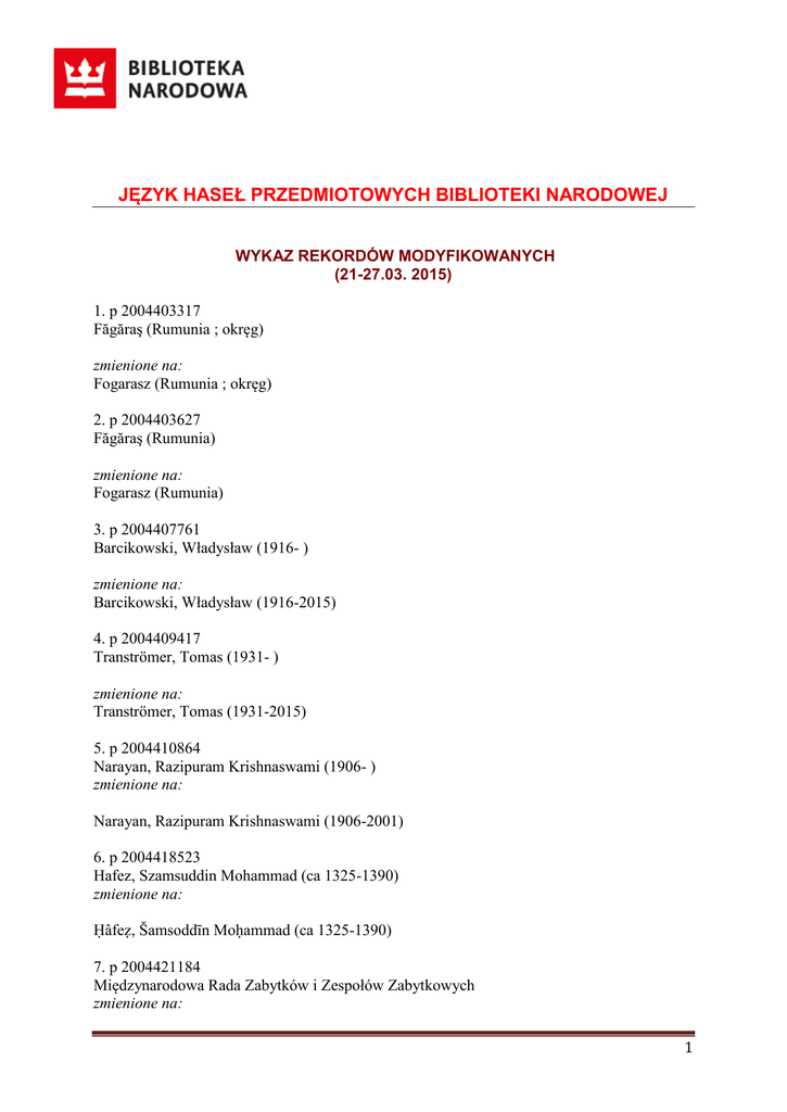 JĘZYK HASEŁ PRZEDMIOTOWYCH BIBLIOTEKI NARODOWEJ WYKAZ REKORDÓW MODYFIKOWANYCH (21-27.03. 2015) 1. p 2004403317 Făgăraş (Rumunia ; okręg) zmienione na: Fogarasz (Rumunia ; okręg) 2. p 2004403627 Făgăraş (Rumunia) zmienione na: Fogarasz (Rumunia) 3. p 2004407761 Barcikowski, Władysław (1916- ) zmienione na: Barcikowski, Władysław (1916-2015) 4. p 2004409417 Tranströmer, Tomas (1931- ) zmienione na: Tranströmer, Tomas (1931-2015) 5. p 2004410864 Narayan, Razipuram Krishnaswami (1906- ) zmienione na: Narayan, Razipuram Krishnaswami (1906-2001) 6. p 2004418523 Hafez, Szamsuddin Mohammad (ca 1325-1390) zmienione na: Ḥâfeẓ, Šamsoddīn Moḥammad (ca 1325-1390) 7. p 2004421184 Międzynarodowa Rada Zabytków i Zespołów Zabytkowych zmienione na: 1 Międzynarodowa Rada Ochrony Zabytków 8. p 2004421292 Opolski Ośrodek Postępu Rolniczego (Łosiów) zmienione na: Opolski Ośrodek Doradztwa Rolniczego (Łosiów) 9. p 2004421544 Turkowska, Anna (1926- ) zmienione na: Turkowska, Anna (1926-2011) 10. p 2004427483 Jonkajtys-Luba, Grażyna (1922- ) zmienione na: Jonkajtys-Luba, Grażyna (1922-2004) 11. p 2004436335 Kombinat Cementowo-Wapienniczy "Kujawy" (Bielawy) zmienione na: Lafarge Cement Polska Zakłady Kujawy (Bielawy) 12. p 2004438930 Łuczak, Henryk (1943- ) zmienione na: Łuczak, Henryk (1943-2014) 13. p 2004445085 Szostaków (Litwa) zmienione na: Szostaki (Litwa) 14. p 2004708826 Narayan, Razipuram Krishnaswami (1906- ) - w literaturze indyjskiej zmienione na: Narayan, Razipuram Krishnaswami (1906-2001) w literaturze indyjskiej 15. p 2004845813 Szostaków (Litwa) - 20 w. zmienione na: 2 Szostaki (Litwa) 20 w. 16. p 2007617658 Niewiarowski, Władysław (1924- ) zmienione na: Niewiarowski, Władysław (1924-2015) 17. p 2011002156 Ullmann, Viktor (1898-1844) zmienione na: Ullmann, Viktor (1898-1944) 18. p 2013002686 Łukowiak, Małgorzata. zmienione na: Łukowiak, Małgorzata (1971- ) 19. p 2014031011 Szostaków (Litwa ; okręg) zmienione na: Szostaki (Litwa ; okręg) 20. p 2014031012 Szostaków (Litwa ; okręg) - 1939-1945 r. zmienione na: Szostaki (Litwa ; okręg) 1939-1945 r. 21. p 2014050236 Janiszewska, Daria. Wojna domowa w Rzymie w latach 193-197 zmienione na: Janiszewska-Sieńko, Daria. Wojna domowa w Rzymie w latach 193-197 22. p 2014050237 Janiszewska, Daria zmienione na: Janiszewska-Sieńko, Daria 23. p 2014061163 Kleszcz, Krzysztof (1974- ). Przecinki z góry zmienione na: 3 Kleszcz, Krzysztof (1974- ). Przecieki z góry 24. p 2014066576 Kurier Łódzki (1906-1911) zmienione na: Kurier Łódzki (czasop.) 25. p 2014080365 Tokarczuk, Olga (1962- ). Żurek. Opowiadanie wigilijne zmienione na: Tokarczuk, Olga (1962- ). Żurek 26. p 2014085136 Pismo - badanie - kryminalistyka zmienione na: Pismo kryminalistyka 27. p 2015005772 Kultura - straty wojenne - Syria zmienione na: Syria kultura straty wojenne 28. p 2015007195 Niewiński, Jan (1920- ) zmienione na: Niewiński, Jan (1920-2015) 4