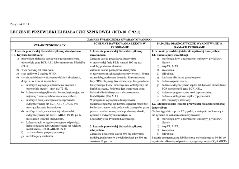 Załącznik B.14. LECZENIE PRZEWLEKŁEJ BIAŁACZKI SZPIKOWEJ (ICD-10 C 92.1) ZAKRES WIADCZENIA GWARANTOWANEGO SCHEMAT DAWKOWANIA LEKÓW W BADANIA DIAGNOSTYCZNE WYKONYWANE W WIADCZENIOBIORCY PROGRAMIE RAMACH PROGRAMU 1. Leczenie przewlekłej białaczki szpikowej dazatynibem 1. Leczenie przewlekłej białaczki szpikowej 1. Leczenie przewlekłej białaczki szpikowej dazatynibem 1.1. Kryteria kwalifikacji 1.1. Badania przy kwalifikacji dazatynibem 1) przewlekła białaczka szpikowa z udokumentowaną a) morfologia krwi z rozmazem (leukocyty, płytki krwi, Zalecana dawka początkowa dazatynibu obecnością genu BCR-ABL lub chromosomu Filadelfia blasty), w przewlekłej fazie PBSz wynosi 100 mg raz (Ph+); b) AspAT, AlAT, na dobę, podawane doustnie. 2) wiek powyżej 18 roku życia; c) kreatynina, Zalecana dawka początkowa dazatynibu 3) stan ogólny 0-2 według WHO; d) bilirubina, w zaawansowanych fazach choroby wynosi 140 mg 4) świadczeniobiorcy w fazie przewlekłej i akceleracji, e) fosfataza alkaliczna granulocytów, raz na dobę, podawane doustnie. Zaawansowane dotychczas leczeni imatinibem: f) badania ogólne moczu, fazy PBSz obejmują fazę akceleracji, fazę przełomu a) u których występuje oporność na imatinib z g) badanie cytogenetyczne szpiku lub badanie molekularne blastycznego, który może być mieloblastyczny lub obecnością mutacji innej niż T315l, PCR na obecność genu BCR-ABL, limfoblastyczny. Podobnie jest traktowana ostra b) którzy nie osiągnęli remisji hematologicznej po co h) badanie cytogenetyczne krwi (opcjonalnie), białaczka limfoblastyczna z chromosomem najmniej 3 miesiącach leczenia imatynibem, i) badanie cytologiczne szpiku (opcjonalnie), filadelfijskim (Ph+ALL). c) u których brak jest częściowej odpowiedzi j) USG wątroby i śledziony. W przypadku wystąpienia toksyczności cytogenetycznej lub BCR-ABL >10% IS w 6 niehematologicznej lub hematologicznej może być 1.2. Monitorowanie leczenia przewlekłej białaczki szpikowej miesiącu leczenia imatynibem konieczne zaprzestanie podawania dazatynibu przez dazatynibem d) u których brak jest całkowitej odpowiedzi Co dwa tygodnie - przez 12 tygodni, a następnie co 3 miesiące pewien czas lub zmniejszenie podawanej dawki, cytogenetycznej lub BCR - ABL > 1% IS po 12 lub zgodnie ze wskazaniami medycznymi: zgodnie z wytycznymi zawartymi w miesiącach leczenia imatynibem, a) morfologia krwi z rozmazem (leukocyty, płytki krwi, Charakterystyce Produktu Leczniczego. e) którzy utracili osiągniętą wcześniej odpowiedź blasty), hematologiczną lub cytogenetyczną lub większą b) AspAT, AlAT, 2. Leczenie przewlekłej białaczki szpikowej molekularną – BCR-ABL>0,1% IS, c) kreatynina, nilotynibem f) ze stwierdzoną progresją choroby, d) bilirubina. Zaleca się podawanie dawki 800 mg nilotynibu g) nietolerujący imatinibu; Badanie cytogenetyczne lub ilościowe molekularne: co 90 dni do na dobę, podawanej w dwóch dawkach po 400 mg uzyskania całkowitej odpowiedzi cytogenetycznej – CCyR (BCRco około 12 godzin. 5) świadczeniobiorcy w fazie przewlekłej i akceleracji dotychczas leczeni nilotynibem nietolerujący nilotynibu lub z niepowodzeniem leczenia nilotynibem 6) świadczeniobiorcy w fazie kryzy blastycznej, którzy wcześniej nie otrzymywali dazatynibu, nietolerujący lub nieodpowiadający na imatynib. W razie rozpoznania oporności lub nietolerancji imatynibu, do lekarza prowadzącego należy wybór leku drugiego rzutu (dazatynib albo nilotynib) w oparciu o wskazania medyczne. 1.2 Kryteria wyłączenia 1) pojawienie się objawów nadwrażliwości na dazatynib; 2) toksyczność powyżej 2 według WHO, zwłaszcza wystąpienie poważnych pozahematologicznych działań niepożądanych (3-krotny wzrost stężenia bilirubiny, 5krotny wzrost aktywności aminotransferaz wątrobowych) lub hematologicznych działań niepożądanych (ciężka neutropenia lub małopłytkowość); 3) stan sprawności 3-4 według WHO; 4) brak skuteczności leku po 3 miesiącach stosowania leku: - brak remisji hematologicznej, - brak remisji cytogenetycznej mniejszej (definiowanej jako sytuacja, w której w szpiku są komórki Ph-, ale jest ich mniej niż 35 %); 5) brak całkowitej odpowiedzi cytogenetycznej po 6 miesiącach - BCR-ABL>1% IS; 6) znalezienie dawcy szpiku i podjęcie decyzji o wykonaniu zabiegu przeszczepienia szpiku u danego świadczeniobiorcy; 7) progresja choroby w trakcie stosowania leku wyrażająca się utratą odpowiedzi hematologicznej, utratą całkowitej odpowiedzi cytogenetycznej lub zwiększeniem o 30% odsetka komórek z chromosomem Filadelfia W przypadku wystąpienia toksyczności niehematologicznej lub hematologicznej może być konieczne zaprzestanie podawania nilotynibu przez pewien czas lub zmniejszenie podawanej dawki, zgodnie z wytycznymi zawartymi w Charakterystyce Produktu Leczniczego. ABL<1% IS) a następnie ilościowe badanie molekularne co 90 dni. 2. Leczenie przewlekłej białaczki szpikowej nilotynibem 2.1 Badania przy kwalifikacji a) morfologia krwi z rozmazem (leukocyty, płytki krwi, blasty), b) AspAT, AlAT, c) kreatynina, d) bilirubina, e) fosfataza alkaliczna granulocytów, f) badania ogólne moczu, g) badanie cytogenetyczne szpiku lub badanie molekularne PCR na obecność genu BCR-ABL, h) badanie cytogenetyczne krwi (opcjonalnie), i) badanie cytologiczne szpiku (opcjonalnie), j) USG wątroby i śledziony. 2.2 Monitorowanie leczenia przewlekłej białaczki szpikowej nilotynibem Raz w miesiącu (po uzyskaniu całkowitej remisji hematologicznej co 90 dni): a) morfologia krwi z rozmazem (leukocyty, płytki krwi, blasty), b) AspAT, AlAT, c) kreatynina, d) bilirubina. Badanie cytogenetyczne lub ilościowe molekularne: co 90 dni do uzyskania całkowitej odpowiedzi cytogenetycznej – CCyR (BCRABL<1% IS) a następnie ilościowe badanie molekularne co 90 dni. 3. Monitorowanie programu: 1) gromadzenie w dokumentacji medycznej pacjenta danych dotyczących monitorowania leczenia i każdorazowe ich u 