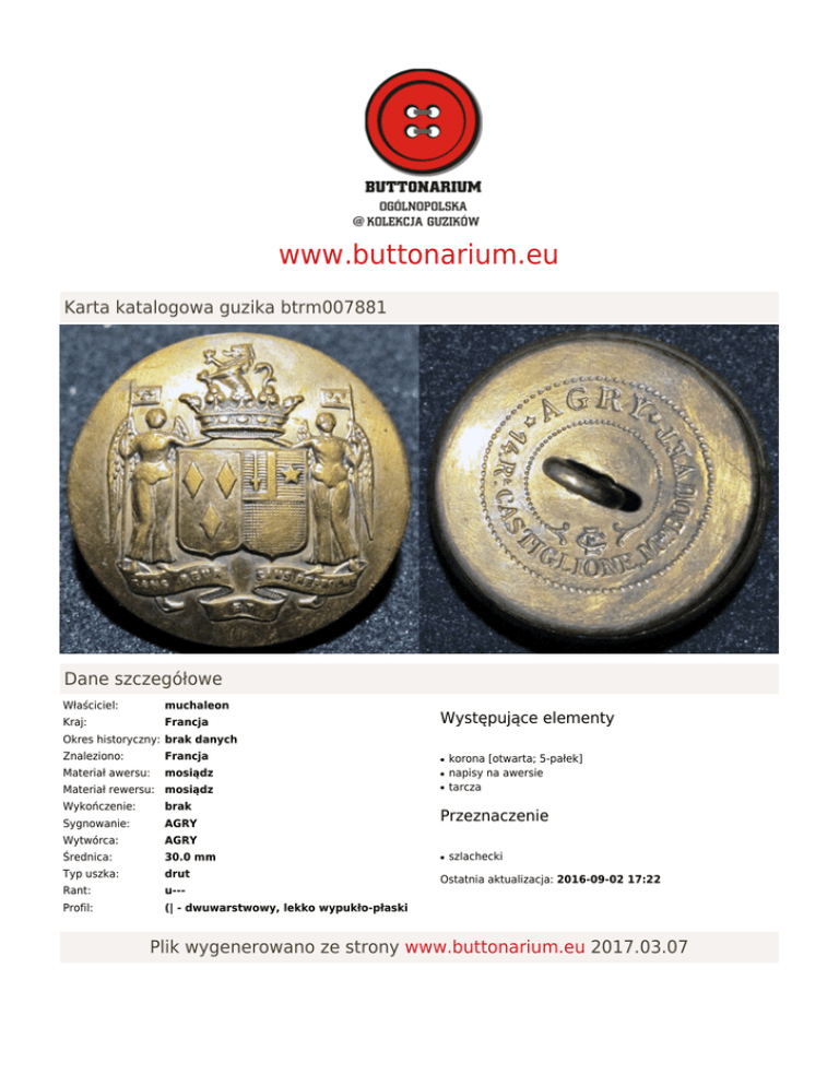 www.buttonarium.eu Karta katalogowa guzika btrm007881 Dane szczegółowe Właściciel: muchaleon Kraj: Francja Występujące elementy Okres historyczny: brak danych Znaleziono: Francja Materiał awersu: mosiądz ● Materiał rewersu: mosiądz ● Wykończenie: brak Sygnowanie: AGRY Wytwórca: AGRY Średnica: 30.0 mm Typ uszka: drut Rant: u--- Profil: (| - dwuwarstwowy, lekko wypukło-płaski ● korona [otwarta; 5-pałek] napisy na awersie tarcza Przeznaczenie ● szlachecki Ostatnia aktualizacja: 2016-09-02 17:22 Plik wygenerowano ze strony www.buttonarium.eu 2017.03.07 Opis guzika btrm007881 Francuski(?) guzik liberyjny - francuskiej produkcji (herb na tarczy herbowej) © buttonarium.eu Awers przedstawia herb małżeński skłądający się z dwóch niezidentyfikowanych herbów francuskich(?) połączonych koroną szlachecką, z dwoma trzymaczami w postaci uskrzydlonych aniołów z proporcami, pod herbami małżonków umieszczono napis na szarfie: SANS PEUR ET SANS REPROCHE, na obrzeżu guzika brak wypukłego rantu. Ciekawostka Pierre du Terrail de Bayard (1473–1524) — ideał rycerza średniowiecznego, owiany legendą ostatniego z rycerzy sans peur et sans reproche, czyli bez strachu (lęku, trwogi) i bez wyrzutu (hańby, skazy), osławiony w romansach rycerskich, najbardziej utalentowany dowódca francuski, bohater kampanii włoskiej Karola VIII, Ludwika XII oraz Franciszka I. Wikipedia.pl - Pierre Terrail de Bayard Rewers sygnowany: ★ AGRY ★ 14Re CASTIGLIONE Mon BOUVET CE. Guzik znaleziono na terenie Francji. Przeznaczenie i datowanie - ogólnie Guziki liberyjne spotykano tylko przy niektórych typach liberii. Można przypuszczać, że szykowne guziki liberyjne zdobiły przede wszystkim barwne liberie paradne, i to jedynie reprezentacyjnej służby dworskiej, które czasami noszone były tylko na wyjątkowe okazje. W Europie barwne liberie paradne, zdobione szykownymi i cennymi guzikami, zaczęły być modne w II połowie XVIII wieku, a w XIX wieku były już stosunkowo popularne. Postęp techniczny spowodował obniżkę cen guzików, co wpłynęło na większą ich dostępności, a co za tym idzie i popularność. Liberie były w powszechnym użytku do wybuchu I wojny światowej, a gdzieniegdzie aż do wybuchu II wojny. Do czasów współczesnych liberie przetrwały w renomowanych hotelach, kasynach, klubach, restauracjach itp. Więcej informacji na temat liberii można znaleźć w artykule: www.buttonarium.eu - Guziki liberyjne, zbiór informacji Podstawowe rodzaje guzików liberyjnych: ● ● ● ● guziki z herbem wraz z różnymi jego elementami: godłem heraldycznym, tarczą herbową, koroną rangową, klejnotem, zawołaniem, orderem, dewizą oraz trzymaczami; guziki z samym godłem heraldycznym; guziki z monogramem (prostym lub złożonym) z koroną lub bez korony rangowej; guziki z samą koroną rangową. Ciekawostka Warto też wspomnieć o guzikach liberyjnych w wersji małżeńskiej. Na takich guzikach umieszczano najczęściej herby dwóch rodów, z których pochodzili małżonkowie, często zaznaczając pozycję każdej z rodzin poprzez dodanie odpowiedniej korony rangowej. Spotyka się również guziki na których zamiast herbów dwóch rodzin umieszczono monogramy wraz z przynależnymi im koronami rangowymi. Źródła Podobne guziki na stronie Buttonarium Polska - guziki z herbem na tarczy herbowej Podobne guziki na stronie Buttonarium Polska - guziki z herbem bez tarczy herbowej Podobne guziki na stronie Buttonarium Polska - guziki z monogramem i koroną rangową Podobne guziki na stronie Buttonarium Polska - guziki z monogramem bez korony rangowej Podobne guziki na stronie Buttonarium Polska - guziki z samą koroną rangową Podobne guziki na stronie Buttonarium Polska - guziki w wersji małżeńskiej GUZIKI LIBERYJNE KATALOG, Elbląg 1988 Zajchowski Zb. - Guziki herbowe . cz.1, Elbląg 2008 Zajchowski Zb. - Guziki herbowe . cz.2, Elbląg 2013 www.buttonarium.eu - Guziki liberyjne, zbiór informacji Wytwórca: AGRY AGRY to francuski producent, który produkował guziki na przełomie XIX i XX wieku. ● Przy opracowaniu opisu wykorzystano informacje od użytkowników oraz wnioski z analizy guzików w Buttonarium. Jeśli chciałbyś coś dodać do tego opisu, to napisz poniżej komentarz. Nie zapomnij podać źródeł informacji. Ostatnia aktualizacja: 2015-03-23 10:20 Plik wygenerowano ze strony www.buttonarium.eu 2017.03.07