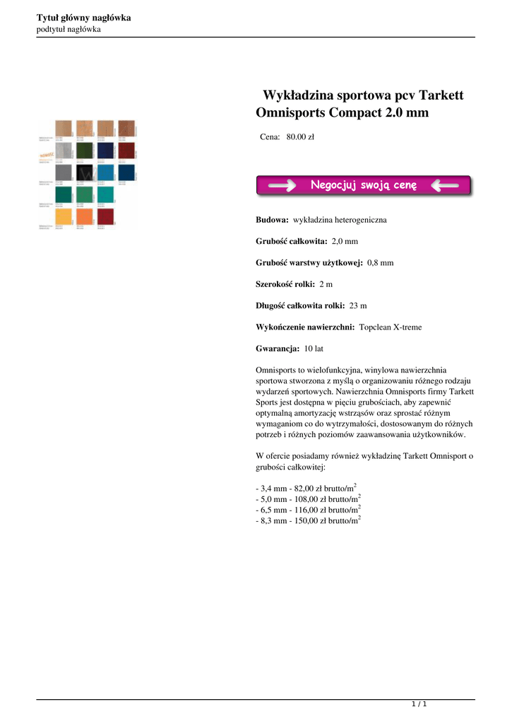 Tytuł główny nagłówka podtytuł nagłówka Wykładzina sportowa pcv Tarkett Omnisports Compact 2.0 mm Cena: 80.00 zł Budowa: wykładzina heterogeniczna Grubość całkowita: 2,0 mm Grubość warstwy użytkowej: 0,8 mm Szerokość rolki: 2 m Długość całkowita rolki: 23 m Wykończenie nawierzchni: Topclean X-treme Gwarancja: 10 lat Omnisports to wielofunkcyjna, winylowa nawierzchnia sportowa stworzona z myślą o organizowaniu różnego rodzaju wydarzeń sportowych. Nawierzchnia Omnisports firmy Tarkett Sports jest dostępna w pięciu grubościach, aby zapewnić optymalną amortyzację wstrząsów oraz sprostać różnym wymaganiom co do wytrzymałości, dostosowanym do różnych potrzeb i różnych poziomów zaawansowania użytkowników. W ofercie posiadamy również wykładzinę Tarkett Omnisport o grubości całkowitej: - 3,4 mm - 82,00 zł brutto/m2 - 5,0 mm - 108,00 zł brutto/m2 - 6,5 mm - 116,00 zł brutto/m2 - 8,3 mm - 150,00 zł brutto/m2 1/1 Powered by TCPDF (www.tcpdf.org)
