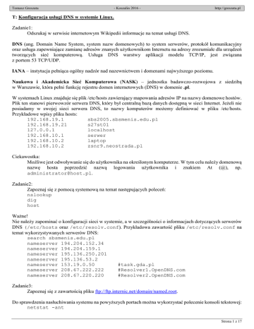 T: Konfiguracja usługi DNS w systemie Linux. DNS Zadanie1: