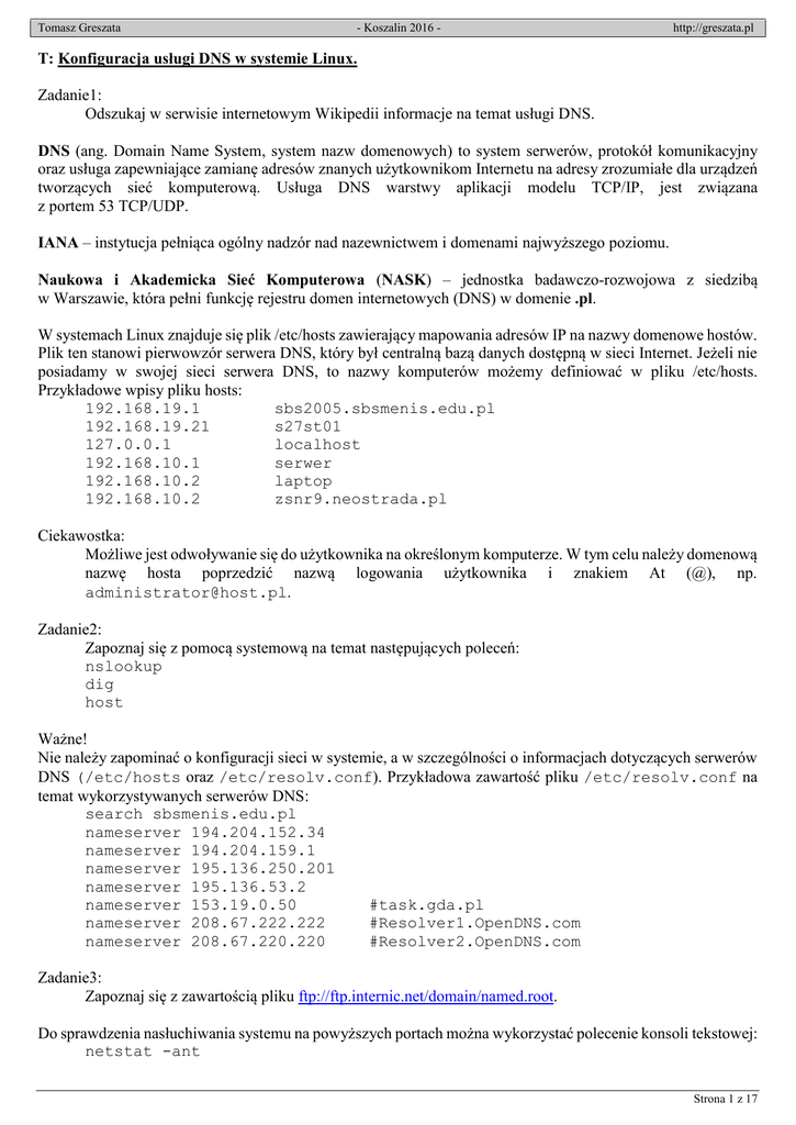 Tomasz Greszata - Koszalin 2016 - http://greszata.pl T: Konfiguracja usługi DNS w systemie Linux. Zadanie1: Odszukaj w serwisie internetowym Wikipedii informacje na temat usługi DNS. DNS (ang. Domain Name System, system nazw domenowych) to system serwerów, protokół komunikacyjny oraz usługa zapewniające zamianę adresów znanych użytkownikom Internetu na adresy zrozumiałe dla urządzeń tworzących sieć komputerową. Usługa DNS warstwy aplikacji modelu TCP/IP, jest związana z portem 53 TCP/UDP. IANA – instytucja pełniąca ogólny nadzór nad nazewnictwem i domenami najwyższego poziomu. Naukowa i Akademicka Sieć Komputerowa (NASK) – jednostka badawczo-rozwojowa z siedzibą w Warszawie, która pełni funkcję rejestru domen internetowych (DNS) w domenie .pl. W systemach Linux znajduje się plik /etc/hosts zawierający mapowania adresów IP na nazwy domenowe hostów. Plik ten stanowi pierwowzór serwera DNS, który był centralną bazą danych dostępną w sieci Internet. Jeżeli nie posiadamy w swojej sieci serwera DNS, to nazwy komputerów możemy definiować w pliku /etc/hosts. Przykładowe wpisy pliku hosts: 192.168.19.1 sbs2005.sbsmenis.edu.pl 192.168.19.21 s27st01 127.0.0.1 localhost 192.168.10.1 serwer 192.168.10.2 laptop 192.168.10.2 zsnr9.neostrada.pl Ciekawostka: Możliwe jest odwoływanie się do użytkownika na określonym komputerze. W tym celu należy domenową nazwę hosta poprzedzić nazwą logowania użytkownika i znakiem At (@), np. [email protected]. Zadanie2: Zapoznaj się z pomocą systemową na temat następujących poleceń: nslookup dig host Ważne! Nie należy zapominać o konfiguracji sieci w systemie, a w szczególności o informacjach dotyczących serwerów DNS (/etc/hosts oraz /etc/resolv.conf). Przykładowa zawartość pliku /etc/resolv.conf na temat wykorzystywanych serwerów DNS: search sbsmenis.edu.pl nameserver 194.204.152.34 nameserver 194.204.159.1 nameserver 195.136.250.201 nameserver 195.136.53.2 nameserver 153.19.0.50 #task.gda.pl nameserver 208.67.222.222 #Resolver1.OpenDNS.com nameserver 208.67.220.220 #Resolver2.OpenDNS.com Zadanie3: Zapoznaj się z zawartością pliku ftp://ftp.internic.net/domain/named.root. Do sprawdzenia nasłuchiwania systemu na powyższych portach można wykorzystać polecenie konsoli tekstowej: netstat -ant Strona 1 z 17 Tomasz Greszata - Koszalin 2016 - http://greszata.pl Zadanie4: Sprawdź zainstalowane oprogramowanie serwera nazw w przy twoim stanowisku w konsoli tekstowej jak i w centrum sterowania YaST. Zadanie5: Zapoznaj się z konfiguracją serwera DNS w centrum sterowania YaST oraz zawartością plików konfiguracyjnych - /etc/named.conf oraz /var/lib/named/*. Zadanie6: Sekwencja poleceń wydana w systemie Linux do samodzielnego przeanalizowania: rpm -qa | grep bind chkconfig named off /etc/init.d/named status cat /etc/services | grep domain YaST => Usługi sieciowe => Serwer DNS (w trybie graficznym) killall named ps aux Dodatkowe informacje na: http://greszata.pl/pracownia/seria_4/cw_4_lin_suse_dns http://projekt-ldap.uci.umk.pl/raporty/ftp/nask/nask-dns.html http://www.ubuntu-pomoc.org/instalacja-serwera-dns-na-przykladzie-maradns/ http://tech-online.pl/pierwszy-serwer-ubuntu-krok-po-kroku/ Strona 2 z 17 Tomasz Greszata - Koszalin 2016 - http://greszata.pl Zadanie3: Przeprowadź instalację i konfiguracją serwera DNS w systemie Linux Ubuntu. Z przeprowadzonych działań utwórz sprawozdanie w dowolnym procesorze tekstu. Na jednej stronie o rozmiarze A4, orientacji pionowej, umieść dwa opisane zrzuty z ekranu, o szerokości minimum 14 cm. Każdą stronę podpisz swoim imieniem i nazwiskiem w nagłówku strony a w stopce oznacz numer strony wg schematu Strona X z Y. Pracę zachowaj pod nazwą $nazwisko_dns_linux i prześlij pocztą elektroniczną do nauczyciela na adres [email protected]. Strona 3 z 17 Tomasz Greszata - Koszalin 2016 - http://greszata.pl Przed przystąpieniem do instalacji usługi DNS należy sprawdzić, czy w maszynie wirtualnej systemu Linux włączyliśmy dwie karty sieciowe i odpowiednio je skonfigurowaliśmy. I tak dla maszyny wirtualnej ubuntu wybieramy ustawienia (Settings), przechodzimy do kategorii Network i w zakładce Adapter 1 kartę podłączamy w trybie NAT natomiast w zakładce Adapter 2 kartę podłączamy w trybie Internal Network. W systemie operacyjnym Linux Ubuntu uruchamiamy konsolę terminala. Uprawnienia do zarządzania systemem posiada administrator systemu, dlatego należy w oknie podać hasło użytkownika root. W oknie terminala upewniamy się, że nie posiadamy oprogramowania serwera dns i system nie nasłuchuje na porcie 53 protokołu TCP poleceniami dpkg -l oraz netstat -ant: Strona 4 z 17 Tomasz Greszata - Koszalin 2016 - http://greszata.pl Przed instalacją niezbędnego oprogramowania aktualizujemy adresy serwerów źródłowych i listy dostępnych programów poleceniem apt-get update (lub aptitude update). W przypadku problemów z obsługą języka polskiego należy zainstalować odpowiednie oprogramowanie. W tym celu wykonujemy następujące polecenia: apt-get --yes install locales && dpkg-reconfigure locales i w oknie wybieramy pl_PL.TF-8 UTF-8 (lub ISO 8859-2): Następnie przeprowadzamy instalację oprogramowania serwera dns wydając w konsoli polecenie apt-get install bind9 (lub maradns): Strona 5 z 17 Tomasz Greszata - Koszalin 2016 - http://greszata.pl Po instalacji serwera dns sprawdzamy zmiany programowe w systemie, bieżący stan usługi dns oraz nasłuchiwanie na porcie 53 protokołu TCP poniższymi poleceniami: dpkg –l /etc/init.d/named status netstat –ant cat /e Domyślnie usługa dns nie jest uruchamiana i próba jej włączenia kończy się niepowodzeniem. Sprawdzamy teraz dostępne w systemie urządzenia sieciowe poleceniem ifconfig. Kartę sieciową skonfigurujemy sekwencją poleceń ifconfig eth1 down a potem ifconfig eth1 192.168.27.1 netmask 255.255.255.0: Strona 6 z 17 Tomasz Greszata - Koszalin 2016 - http://greszata.pl P