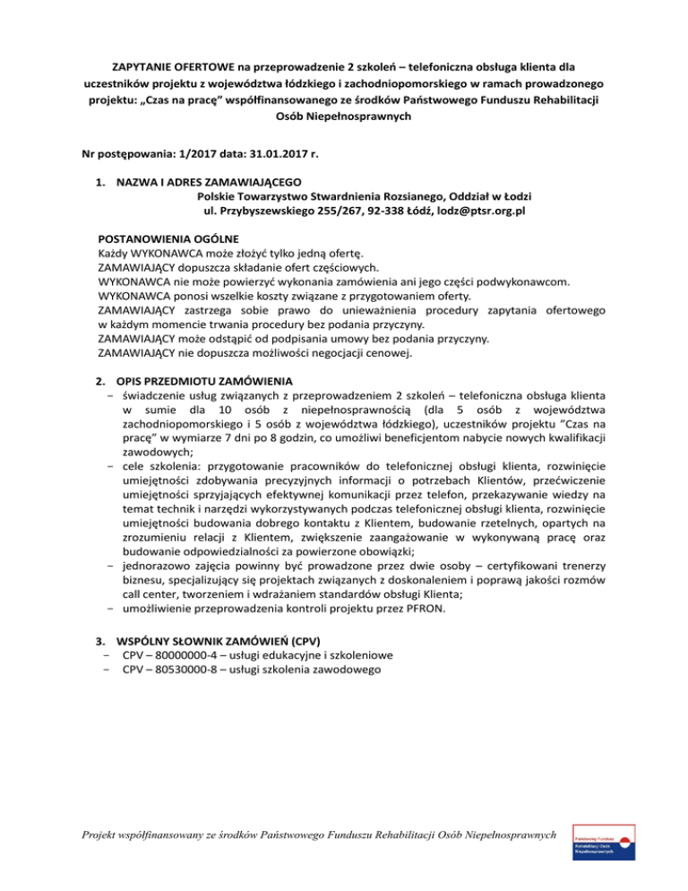 ZAPYTANIE OFERTOWE na przeprowadzenie 2 szkoleń – telefoniczna obsługa klienta dla uczestników projektu z województwa łódzkiego i zachodniopomorskiego w ramach prowadzonego projektu: „Czas na pracę” współfinansowanego ze środków Państwowego Funduszu Rehabilitacji Osób Niepełnosprawnych Nr postępowania: 1/2017 data: 31.01.2017 r. 1. NAZWA I ADRES ZAMAWIAJĄCEGO Polskie Towarzystwo Stwardnienia Rozsianego, Oddział w Łodzi ul. Przybyszewskiego 255/267, 92-338 Łódź, [email protected] POSTANOWIENIA OGÓLNE Każdy WYKONAWCA może złożyć tylko jedną ofertę. ZAMAWIAJĄCY dopuszcza składanie ofert częściowych. WYKONAWCA nie może powierzyć wykonania zamówienia ani jego części podwykonawcom. WYKONAWCA ponosi wszelkie koszty związane z przygotowaniem oferty. ZAMAWIAJĄCY zastrzega sobie prawo do unieważnienia procedury zapytania ofertowego w każdym momencie trwania procedury bez podania przyczyny. ZAMAWIAJĄCY może odstąpić od podpisania umowy bez podania przyczyny. ZAMAWIAJĄCY nie dopuszcza możliwości negocjacji cenowej. 2. OPIS PRZEDMIOTU ZAMÓWIENIA świadczenie usług związanych z przeprowadzeniem 2 szkoleń – telefoniczna obsługa klienta w sumie dla 10 osób z niepełnosprawnością (dla 5 osób z województwa zachodniopomorskiego i 5 osób z województwa łódzkiego), uczestników projektu ”Czas na pracę” w wymiarze 7 dni po 8 godzin, co umożliwi beneficjentom nabycie nowych kwalifikacji zawodowych; cele szkolenia: przygotowanie pracowników do telefonicznej obsługi klienta, rozwinięcie umiejętności zdobywania precyzyjnych informacji o potrzebach Klientów, przećwiczenie umiejętności sprzyjających efektywnej komunikacji przez telefon, przekazywanie wiedzy na temat technik i narzędzi wykorzystywanych podczas telefonicznej obsługi klienta, rozwinięcie umiejętności budowania dobrego kontaktu z Klientem, budowanie rzetelnych, opartych na zrozumieniu relacji z Klientem, zwiększenie zaangażowanie w wykonywaną pracę oraz budowanie odpowiedzialności za powierzone obowiązki; jednorazowo zajęcia powinny być prowadzone przez dwie osoby – certyfikowani trenerzy biznesu, specjalizujący się projektach związanych z doskonaleniem i poprawą jakości rozmów call center, tworzeniem i wdrażaniem standardów obsługi Klienta; umożliwienie przeprowadzenia kontroli projektu przez PFRON. 3. WSPÓLNY SŁOWNIK ZAMÓWIEŃ (CPV) CPV – 80000000-4 – usługi edukacyjne i szkoleniowe CPV – 80530000-8 – usługi szkolenia zawodowego Projekt współfinansowany ze środków Państwowego Funduszu Rehabilitacji Osób Niepełnosprawnych 4. ZADANIA PO STRONIE WYKONAWCY oznakowanie pomieszczeń i dokumentów dotyczących przedmiotu zamówienia zgodnie z wytycznymi PFRON; zapewnienie odpowiedniego lokalu do przeprowadzenia szkolenia; archiwizacja wszystkich dokumentów związanych z realizowanym projektem do 31 marca 2022 r.; przygotowanie materiałów szkoleniowych, zaświadczeń i certyfikatów dla uczestników szkolenia; umożliwienie przeprowadzenia kontroli projektu przez PFRON. 5. ZADANIA PO STRONIE ZAMAWIAJĄCEGO terminowe i rzetelne wywiązywanie się z umowy; przekazanie Wykonawcy narzędzi badawczych do realizacji zadań; zapewnienie kontaktu z osobami uczestniczącymi w projekcie. 6. TERMIN I MIEJSCE WYKONANIA ZAMÓWIENIA Terminy warsztatów: Luty 2017 r. – województwo zachodniopomorskie i łódzkie (dokładne terminy zostaną ustalone po rozstrzygnięciu zapytania ofertowego) 7. SZCZEGÓŁOWY OPIS PRZEDMIOTU ZAMÓWIENIA: Przeprowadzenie 2 szkoleń – telefoniczna obsługa klienta – w lokalu zapewnionym przez Wykonawcę – dostosowanym dla osób poruszających się na wózkach inwalidzkich – w sumie dla 10 osób z niepełnosprawnością (dla 5 osób z województwa zachodniopomorskiego i 5 osób z województwa łódzkiego), uczestników projektu ”Czas na pracę” w wymiarze 7 dni po 8 godzin, co umożliwi beneficjentom nabycie nowych kwalifikacji zawodowych. Prosimy o udokumentowanie możliwości przeprowadzenia szkolenia (np. zdjęcia z poprzednich szkoleń). 8. WARUNKI UDZIAŁU W POSTĘPOWANIU Składający ofertę posiada: uprawnienia do wykonywania określonej działalności lub czynności; doświadczenie w realizacji warsztatów kompetencji społecznych dla osób niepełnosprawnych z dysfunkcją narządu ruchu; posiadanie zdolności finansowych oraz technicznych do wykonania usługi. 9. DOKUMENTY WYMAGANE W CELU POTWIERDZENIA SPEŁNIENIA WARUNKÓW formularz ofertowy – zgodnie z załącznikiem nr 1; oświadczenie o braku powiązań kapitałowych lub osobowych – zgodnie z załącznikiem nr 2; aktualny odpis z właściwego rejestru lub zaświadczenie o wpisie do ewidencji działalności gospodarczej wystawiony nie wcześniej niż 3 miesiące przed upływem terminu składania oferty; potwierdzenie doświadczenia; referencje (kserokopie potwierdzone za zgodność z oryginałem przez Oferenta). 10. WALUTA, W JAKIEJ BĘDĄ PROWADZONE ROZLICZENIA ZWIĄZANE Z REALIZACJĄ NINIEJSZEGO ZAMÓWIENIA Rozliczenia prowadzone w PLN Projekt współfinansowany ze środków Państwowego Funduszu Rehabilitacji Osób Niepełnosprawnych 11. OPIS SPOSOBU PRZYGOTOWANIA OFERTY Ofertę należy przygotować w języku polskim dołączając do niej wszystkie niezbędne dokumenty stanowiące załączniki do zapytania ofertowego. 12. OSOBY UPRAWNIONE DO POROZUMIEWANIA SIĘ Z POTENCJALNYMI WYKONAWCAMI Monika Koza – kierownik biura tel.: 42 649 18 03 13. MIEJSCE, TERMIN I SPOSÓB ZŁOŻENIA OFERTY Ofertę należy dostarczyć do dnia 08.02.2017 r. do godz. 16.00 – osobiście lub za pośrednictwem poczty polskiej (decyduje data wpływu do siedziby PTSR) w zamkniętej trwale kopercie na adres: 92-338 Łódź, ul. Przybyszewskiego 255/267. 14. KRYTERIA OCENY OFERT I WYBORU WYKONAWCY Zamawiający dokona oceny ofert na podstawie poniżej przedstawionych kryteriów oceny ofert: KRYTERIUM 1: Cena usługi – maximum 70 pkt, KRYTERIUM 2: Doświadczen
