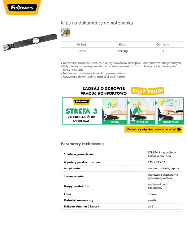 Klips na dokumenty do notebooka ● ● ● ● Nr kat. Kolor Op. jedn. 22200 czarny 1 Niewielkie rozmiary, idealny dla użytkowników laptopów i komputerów stacjonarnych Gdy nie jest używany, może być w łatwy sposób złożony lub zdjęty i schowany do torby, szuflady Możliwość montażu z lewej lub prawej strony Utrzymuje dokumenty o grubości do 5 kartek Parametry techniczne: Strefa ergonomiczna STREFA 3 - zapobiegaj bólom karku i szyi Wymiary produktu w mm 235 x 37 x 16 Urządzenie: monitor LCD/TFT, laptop Zastosowanie stanowisko stacjonarne, pracownicy mobilni Grupy produktów podstawki pod dokumenty Kolor czarny Materiał zewnętrzny plastik Maksymalna ilość kartek do 5