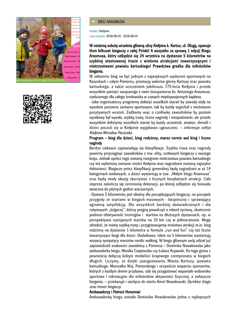 BIEG ARASMUSA miasto: Kiełpino czas trwania: 2016-09-24 - 2016-09-24 W ostatnią sobotę września główną ulicę Kiełpina k. Kartuz, ul. Długą, opanuje tłum kilkuset biegaczy z całej Polski! A wszystko za sprawą 1 edycji Biegu Arasmusa, który odbędzie się 24 września na dystansie 5 kilometrów na szybkiej atestowanej trasie z wieloma atrakcjami towarzyszącymi i mistrzostwami powiatu kartuskiego! Prawdziwa gradka dla miłośników biegania. W założeniu bieg na być jednym z największych wydarzeń sportowych na Kaszubach i całym Pomorzu, promocją walorów gminy Kartuzy oraz powiatu kartuskiego, a także uczczeniem jubileuszu 775-lecia Kiełpina i przede wszystkim pamięci związanego z nami duszpasterza ks. Antoniego Arasmusa, zasłużonego dla całego środowiska w czasach międzywojennych kapłana. - Jako organizatorzy pragniemy dołożyć wszelkich starań by zawody stały na wysokim poziomie zarówno sportowym, tak by każdy wyjechał z mnóstwem pozytywnych wrażeń. Zadbamy więc o czołówkę zawodników by poziom wynikowy był wysoki, szybką trasę, liczne nagrody i niespodzianki, ale przede wszystkim dołożymy wszelkich starań by każdy uczestnik, amator, dorośli i dzieci poczuli się w Kiełpinie wyjątkowo ugoszczeni. – informuje sołtys Kiełpina Mirosław Paczoska. Program – bieg dla dzieci, bieg rodzinny, marsz nornic wal king i liczne nagrody Bardzo ciekawie zapowiadają się klasyfikacje. Szybka trasa oraz nagrody powinny przyciągnąć zawodników z tzw. elity, czołowych biegaczy z naszego kraju. Jednak oprócz tego zostaną rozegrane mistrzostwa powiatu kartuskiego czy też wyłoniony zostanie mistrz Kiełpina oraz nagrodzeni zostaną najszybsi debiutanci. Biegacze prócz klasyfikacji generalnej będą nagradzani w aż 14 kategoriach wiekowych, a dzieci wystartują w tzw. „Małym biegu Arasmusa” oraz będą miały okazję skorzystać z licznych bezpłatnych atrakcji. Cała impreza zakończy się ceremonią dekoracji, po której odbędzie się biesiada taneczna do późnych godzin wieczornych. - Dystans 5 kilometrów jest idealny dla początkujących biegaczy, na początek przygody ze startami w biegach masowych - bezpieczny i sprawiający ogromną satysfakcję. Dla wszystkich bardziej doświadczonych i dla rutynowych „ścigaczy”, którzy pragną powalczyć o rekord życiowy, skutecznie podnosi efektywność treningów i startów na dłuższych dystansach, np. w perspektywie następnych startów na 10 km czy w półmaratonie. Mogę zdradzić, że mamy szybką trasę i przygotowujemy mnóstwo atrakcji m.in. bieg rodzinny na dystansie 1 kilometra w formule „run and fun” czy też liczne towarzyszące biegi dla dzieci. Dodatkowo, także na 5 kilometrów wystartują wszyscy sympatycy marszów nordic walking. W biegu głównym swój udział już zapowiedzieli znakomici zawodnicy z Pomorza – Dominika Nowakowska jako ambasadorka biegu, Monika Czapiewska czy Łukasz Kujawski. Do tego grona z pewnością dołączą kolejni medaliści krajowego czempionatu w biegach długich. Liczymy, że dzięki zaangażowaniu Miasta Kartuzy, powiatu kartuskiego, Marszałka Woj. Pomorskiego i oczywiście wsparciu sponsorów, których z każdym dniem przybywa, uda się przygotować wspaniałe widowisko sportowe i rekreacyjne dla miłośników aktywności fizycznej, a zwłaszcza biegania. – przekazuje i zachęca do startu Karol Nowakowski, Dyrektor biegu oraz trener biegaczy. Ambasadorzy i Patroni Honorowi Ambasadorką biegu została Dominika Nowakowska jedna z najlepszych biegaczek w Polsce, finalistka mistrzostw Świata, która na swoim koncie ma już tytuł Mistrzyni Polski na 5km, a ponadto na co dzień mieszka i trenuje w Kiełpinie. Patronat Honorowy nad imprezą już objęli ks. Proboszcz kiełpińskiej parafii Arkadiusz Okroj, Burmistrz Mieczysław Gołuński, Marszałek Województwa Pomorskiego Mieczysław Struk oraz Pani Starosta Janina Kwiecień. Głównym Partnerem jest Miasto Kartuzy. Cel charytatywny – biegamy i pomagamy Witkowi Opłata startowa biegu głównego wynosi 25 zł. Bieg obwarowany jest limitem uczestników, który w biegu głównym wynosi on 400 zawodników. Warto podkreślić, że z każdej jednej opłaty startowej organizatorzy zdecydowali się przeznaczyć kwotę 3 zł na cele charytatywne, które przeznaczą na dwudziestolatka z zespołem downa – Witka Brylowskiego z Kiełpina, który także boryka się z wieloma dysfunkcjami. Ponadto wszystkie pozostałe biegi towarzyszące oraz atrakcje dla dzieci i kibiców będą bezpłatne. Zgłoszenia są w toku. W tej chwili na liście widnieje ponad 70 osób. Swój akces do biegu można dokonać poprzez formularz na: www.elektronicznezapisy.pl/event/568.html, a wszelkie szczegóły dostępne są na stronie www.biegarasmusa.pl. Serdecznie zapraszamy na Ogólnopolski bieg w sercu Kaszub!