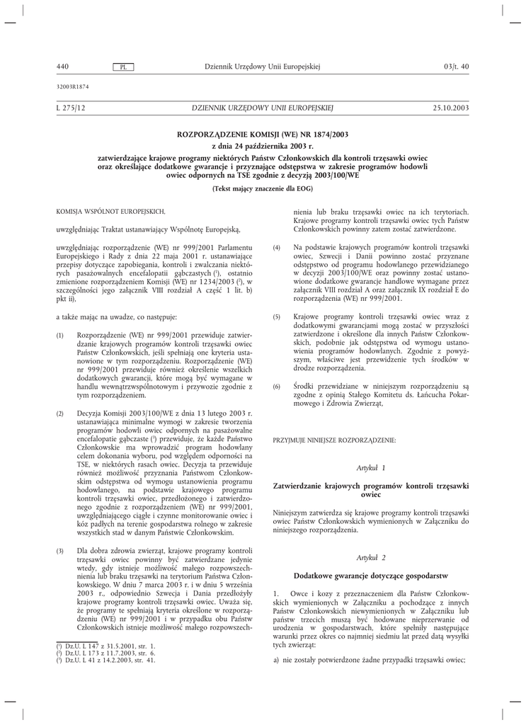 440 PL Dziennik Urzędowy Unii Europejskiej 03/t. 40 32003R1874 L 275/12 25.10.2003 DZIENNIK URZĘDOWY UNII EUROPEJSKIEJ ROZPORZĄDZENIE KOMISJI (WE) NR 1874/2003 z dnia 24 października 2003 r. zatwierdzające krajowe programy niektórych Państw Członkowskich dla kontroli trzęsawki owiec oraz określające dodatkowe gwarancje i przyznające odstępstwa w zakresie programów hodowli owiec odpornych na TSE zgodnie z decyzją 2003/100/WE (Tekst mający znaczenie dla EOG) KOMISJA WSPÓLNOT EUROPEJSKICH, nienia lub braku trzęsawki owiec na ich terytoriach. Krajowe programy kontroli trzęsawki owiec tych Państw Członkowskich powinny zatem zostać zatwierdzone. uwzględniając Traktat ustanawiający Wspólnotę Europejską, uwzględniając rozporządzenie (WE) nr 999/2001 Parlamentu Europejskiego i Rady z dnia 22 maja 2001 r. ustanawiające przepisy dotyczące zapobiegania, kontroli i zwalczania niektórych pasażowalnych encefalopatii gąbczastych (1), ostatnio zmienione rozporządzeniem Komisji (WE) nr 1234/2003 (2), w szczególności jego załącznik VIII rozdział A część 1 lit. b) pkt ii), (4) Na podstawie krajowych programów kontroli trzęsawki owiec, Szwecji i Danii powinno zostać przyznane odstępstwo od programu hodowlanego przewidzianego w decyzji 2003/100/WE oraz powinny zostać ustanowione dodatkowe gwarancje handlowe wymagane przez załącznik VIII rozdział A oraz załącznik IX rozdział E do rozporządzenia (WE) nr 999/2001. a także mając na uwadze, co następuje: (5) Krajowe programy kontroli trzęsawki owiec wraz z dodatkowymi gwarancjami mogą zostać w przyszłości zatwierdzone i określone dla innych Państw Członkowskich, podobnie jak odstępstwa od wymogu ustanowienia programów hodowlanych. Zgodnie z powyższym, właściwe jest przewidzenie tych środków w drodze rozporządzenia. (6) Środki przewidziane w niniejszym rozporządzeniu są zgodne z opinią Stałego Komitetu ds. Łańcucha Pokarmowego i Zdrowia Zwierząt, (1) (2) (3) Rozporządzenie (WE) nr 999/2001 przewiduje zatwierdzanie krajowych programów kontroli trzęsawki owiec Państw Członkowskich, jeśli spełniają one kryteria ustanowione w tym rozporządzeniu. Rozporządzenie (WE) nr 999/2001 przewiduje również określenie wszelkich dodatkowych gwarancji, które mogą być wymagane w handlu wewnątrzwspólnotowym i przywozie zgodnie z tym rozporządzeniem. Decyzja Komisji 2003/100/WE z dnia 13 lutego 2003 r. ustanawiająca minimalne wymogi w zakresie tworzenia programów hodowli owiec odpornych na pasażowalne encefalopatie gąbczaste (3) przewiduje, że każde Państwo Członkowskie ma wprowadzić program hodowlany celem dokonania wyboru, pod względem odporności na TSE, w niektórych rasach owiec. Decyzja ta przewiduje również możliwość przyznania Państwom Członkowskim odstępstwa od wymogu ustanowienia programu hodowlanego, na podstawie krajowego programu kontroli trzęsawki owiec, przedłożonego i zatwierdzonego zgodnie z rozporządzeniem (WE) nr 999/2001, uwzględniającego ciągłe i czynne monitorowanie owiec i kóz padłych na terenie gospodarstwa rolnego w zakresie wszystkich stad w danym Państwie Członkowskim. Dla dobra zdrowia zwierząt, krajowe programy kontroli trzęsawki owiec powinny być zatwierdzane jedynie wtedy, gdy istnieje możliwość małego rozpowszechnienia lub braku trzęsawki na terytorium Państwa Członkowskiego. W dniu 7 marca 2003 r. i w dniu 5 września 2003 r., odpowiednio Szwecja i Dania przedłożyły krajowe programy kontroli trzęsawki owiec. Uważa się, że programy te spełniają kryteria określone w rozporządzeniu (WE) nr 999/2001 i w przypadku obu Państw Członkowskich istnieje możliwość małego rozpowszech- (1) Dz.U. L 147 z 31.5.2001, str. 1. (2) Dz.U. L 173 z 11.7.2003, str. 6. (3) Dz.U. L 41 z 14.2.2003, str. 41. PRZYJMUJE NINIEJSZE ROZPORZĄDZENIE: Artykuł 1 Zatwierdzanie krajowych programów kontroli trzęsawki owiec Niniejszym zatwierdza się krajowe programy kontroli trzęsawki owiec Państw Członkowskich wymienionych w Załączniku do niniejszego rozporządzenia. Artykuł 2 Dodatkowe gwarancje dotyczące gospodarstw 1. Owce i kozy z przeznaczeniem dla Państw Członkowskich wymienionych w Załączniku a pochodzące z innych Państw Członkowskich niewymienionych w Załączniku lub państw trzecich muszą być hodowane nieprzerwanie od urodzenia w gospodarstwach, które spełniły następujące warunki przez okres co najmniej siedmiu lat przed datą wysyłki tych zwierząt: a) nie zostały potwierdzone żadne przypadki trzęsawki owiec; 03/t. 40 Dziennik Urzędowy Unii Europejskiej PL b) nie zostały zastosowane żadne środki zwalczania trzęsawki owiec; c) gospodarstwa nie posiadają zwierząt zidentyfikowanych jako zagrożone, określonych w art. 13 ust. 1 lit. b) rozporządzenia (WE) nr 999/2001. 2. Nasienie, zarodki i komórki jajowe owiec i kóz, z przeznaczeniem dla Państw Członkowskich wymienionych w Załączniku a pochodzące z innych Państw Członkowskich niewymienionych w Załączniku lub państw trzecich, muszą być otrzymywane od dawców hodowanych nieprzerwanie od urodzenia w gospodarstwach spełniających warunki określone w ust. 1. 441 2. Gospodarstwa, które otrzymują zwierzęta, nasienie, zarodki i komórki jajowe, spełniające warunki określone w ust. 1 lit. a) i b), są objęte urzędowymi ograniczeniami, polegającymi na niewprowadzaniu do gospodarstwa i nieopuszczaniu go przez owce i kozy, nasienie, zarodki i komórki jajowe, z wyjątkiem bezpośredniego wywozu do rzeźni. 3. Ograniczenia w przemieszczaniu się, zarysowane w ust. 2, nie są stosowane w przypadku odbioru owiec o białkowym genotypie prionowym ARR/ARR lub nasienia, zarodków i komórek jajowych od dawcy o białkowym genotypie prionowym ARR/ARR. Artykuł 4 Artykuł 3 Urzędowe ograniczenia dotyczące przemieszczania się 1. Państwa Członkowskie wymienione w Załączniku stosują urzędowe ograniczenia dotyczące przemieszczania