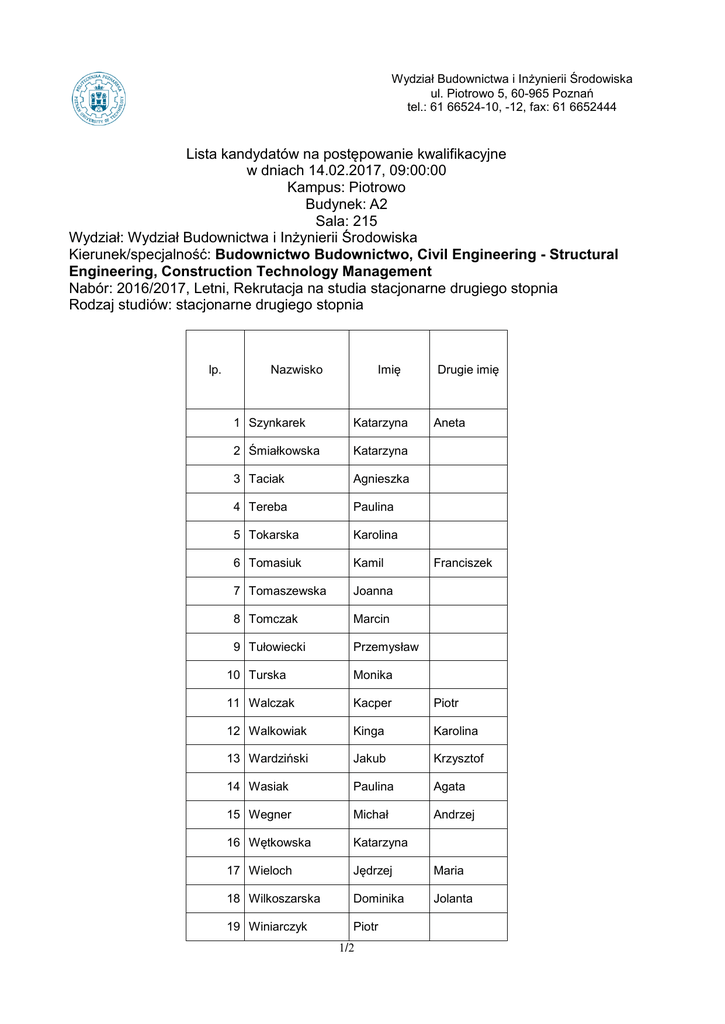 Wydział Budownictwa i Inżynierii Środowiska ul. Piotrowo 5, 60-965 Poznań tel.: 61 66524-10, -12, fax: 61 6652444 Lista kandydatów na postępowanie kwalifikacyjne w dniach 14.02.2017, 09:00:00 Kampus: Piotrowo Budynek: A2 Sala: 215 Wydział: Wydział Budownictwa i Inżynierii Środowiska Kierunek/specjalność: Budownictwo Budownictwo, Civil Engineering - Structural Engineering, Construction Technology Management Nabór: 2016/2017, Letni, Rekrutacja na studia stacjonarne drugiego stopnia Rodzaj studiów: stacjonarne drugiego stopnia lp. Imię Nazwisko 1 Szynkarek Katarzyna 2 Śmiałkowska Katarzyna 3 Taciak Agnieszka 4 Tereba Paulina 5 Tokarska Karolina 6 Tomasiuk Kamil 7 Tomaszewska Joanna 8 Tomczak Marcin 9 Tułowiecki Przemysław Drugie imię Aneta Franciszek 10 Turska Monika 11 Walczak Kacper Piotr 12 Walkowiak Kinga Karolina 13 Wardziński Jakub Krzysztof 14 Wasiak Paulina Agata 15 Wegner Michał Andrzej 16 Wętkowska Katarzyna 17 Wieloch Jędrzej Maria 18 Wilkoszarska Dominika Jolanta 19 Winiarczyk Piotr 1/2 20 Wiśniewska Aleksandra 21 Wojciechowska Joanna 22 Wojtczak Sebastian 23 Wojtczak Bartosz Piotr 24 Wysocka Natasha Fakten 25 Zalewicz Aleksandra 26 Zamelczyk Jakub 27 Zasada Małgorzata 28 Zawartowski Tomasz 29 Zieliński Piotr Zieliński Piotr Zieliński 30 Zozuliński Tomasz Jan 31 Żabierek Bartosz Marek 32 Żurakowska Magdalena 2/2 Maja