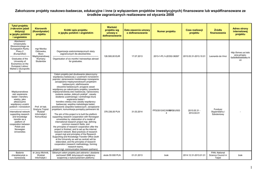Zakończone projekty naukowo-badawcze, edukacyjne i inne (z wyłączeniem projektów inwestycyjnych) finansowane lub współfinansowane ze środków zagranicznych realizowane od stycznia 2008 Tytuł projektu (+akronim jeżeli dotyczy) w języku polskim i angielskim Absolwenci Uniwersytetu Ekonomicznego na Europejskim Rynku Pracy 2 (Europrofis2) --------------------------Graduates of the University of Economics on the European Labour Market 2 (Europrofis 2) Kierownik (Koordynator) projektu Krótki opis projektu w języku polskim i angielskim Wartość projektu wg umowy o dofinansowanie Data zawarcia umowy o dofinansowanie Numer projektu Czas realizacji projektu Źródła finansowania Adres strony internetowej projektu mgr Monika Ostrowska, Biuro Międzynarodowej Wymiany Studentów Organizacja sześciomiesięcznych staży zagranicznych dla absolwentów. --------------------------------------------------------------Organisation of six months' traineeships abroad for graduates. 126.500,00 EUR 17.07.2013 2013-1-PL1-LEO02-38267 2015.05.31-2013.10.01 Leonardo da Vinci http://bmws.ue.kato wice.pl/wpis0a5b9b6da8dd6a.ht ml 376 236,00 PLN 31.03.2014 FFS/2013/IIC/W/0013/U/003 4 2015.05.31 2014.04.01 Fundusz Stypendialny i Szkoleniowy - około 55 000 PLN 01.01.2013 brak 2014.12.31-2013.01.01 PAN, National Science Council in Taipei brak Międzynarodowa sieć wspierania badań i transferu wiedzy, jako płaszczyzna współpracy uczelni polskich i norweskich --------------------------International network supporting research and knowledge transfer as a platform of cooperation between Polish and Norwegian Universities Prof. dr hab. Grażyna Trzpiot Wydział Informatyki i Komunikacji Badanie charakterystyk ebiznesowej dr Jerzy Michnik, Wydział Informatyki i Celem projektu jest zbudowanie płaszczyzny współpracy badawczej z uczelniami norweskimi poprzez: opracowanie modelowego rozwiązania zarządzania międzynarodowymi projektami badawczymi; zdefiniowanie obszarów badawczych; przyjęcie zasad współpracy po zakończeniu projektu i powołanie międzynarodowej sieci badawczej. Opracowany zostanie zestaw „dobrych praktyk”, zasady działania uczelnianego i centralnego biura wspierania badań i transferu wiedzy oraz zasady współpracy badawczej: wspólna metodologia badań, powoływanie zespołów badawczych, zarządzanie projektami, komunikacja pomiędzy partnerami itd. The aim of this project is to built the platform supporting research cooperation with Norwegian universities by: elaboration of a model of international research project mgt, defining common research fields, and the principles of research cooperation after the project is finished, and to set up the internal. research network. Best practices of research project mgt and principles of the Research Supporting and Knowledge Transfer Office (both at the University as well as central) will be elaborated, and the principles of research cooperation (research methodology, forming research teams, project mgt, communication between partners). Głównym celem projektu jest zebranie i zbadanie zachowań SME dotyczących współpracy wzajemnej z wykorzystaniem platformy 1 współpracy średnich i małych przedsiębiorstw poprzez B2B ---------------------------Investigating ebusiness collaboration characteristics of SME through B2B Wykorzystując sukces młodych naukowców w sferze biznesu --------------------------Leveraging success of young scholars in business discipline Nowe innowacyjne rozwiązania służące adaptacji zarządzania I organizacji infrastruktury i usług publicznych do zmian demograficznych w regionach i miastach Europy Centralnej dotkniętych depopulacją (ADAPT2DC) --------------------------- Komunikacji prof. UE dr hab. Maciej Mitręga Wydział Informatyki i Komunikacji dr Marcin Baron, Wydział Ekonomii internetowej. Platforma pozwoli SME w Polsce i na Tajwanie poszukiwać i komunikować się z odpowiednim partnerem w celu kooperacji i innowacji. Dane zebrane z platformy pozwolą poprzez wykorzystanie narzędzi eksploracji danych - przeanalizować jak SME komunikują się wzajemnie, opisać profile biznesowe SME oraz zrobić badanie porównawcze różnic w zachowaniu między polskimi i tajwańskimi przedsiębiorstwami. Możliwe też będzie wsparcie tych firm w celu pokonania przeszkód w ustanawianiu wzajemnej współpracy. --------------------------------------------------------------The main aim of the project is to collect and study the collaboration behaviors of SMEs via a B2B platform. The platform will allow SMEs in Taiwan and Poland to seek and talk to its appropriate partner for cooperation and innovation. Data gathered on the platform will allow - through data mining tools - to analyze how the SMEs communicate each other, to describe SMEs’ business profiles, to make a comparative study of differences in behavior between Polish and Taiwanese enterprises and, eventually to help to overcome the obstacles in setting up the mutual collaboration. Projekt badawczy “Wykorzystując sukces młodych naukowców w sferze biznesu” poświęcony będzie kluczowym czynnikom sukcesu naukowców, którzy zajmują się sferą biznesową. Podczas niej przedstawione zostaną wyniki prowadzonych badań dotyczących tej tematyki. W programie przewidziano dyskusje, warsztaty i prezentacje prelegentów o znaczącym dorobku naukowym, które następnie będą opublikowane w książce. --------------------------------------------------------------The research project “Leveraging success of young scholars in business discipline” is to identify factors evoking success of young scholars by conducting the international research in Visegrad Countries (Czech, Hungary, Poland and Slovakia). The results of the research will be presented at the international conference and in the research book Projekt ADAPT2DC jest ukierunkowany na utworzenie transnarodowych rozwiązań strategicznych dotyczących efektywnego zarządzania usługami publicznymi i