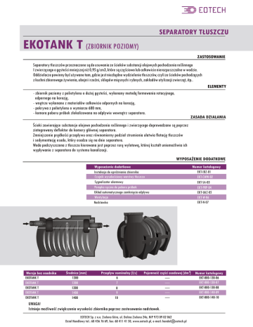 SEPARATORY TŁUSZCZU EKOTANK T (ZBIORNIK POZIOMY) ZASTOSOWANIE Separatory tłuszczów przeznaczone są do usuwania ze ścieków substancji olejowych pochodzenia roślinnego I zwierzęcego o gęstości mniejszej niż 0,95 g/cm3, które są częściowo lub całkowicie nierozpuszczalne w wodzie. Oddzielacze powinny być używane tam, gdzie jest niezbędne wydzielenie tłuszczów, czyli ze ścieków pochodzących z kuchni zbiorowego żywienia, ubojni i rzeźni, sklepów mięsnych i rybnych, zakładów utylizacji zwierząt, itp.. ELEMENTY - zbiornik poziomy z polietylenu o dużej gęstości, wykonany metodą formowania rotacyjnego, odpornego na korozję, - wnętrze wykonane z materiałów całkowicie odpornych na korozję, - pokrywa z polietylenu o wymiarze 600 mm, - komora poboru próbek zlokalizowana na odpływie wewnątrz separatora. ZASADA DZIAŁANIA Ścieki zawierające substancje olejowe pochodzenia roślinnego i zwierzęcego doprowadzane są poprzez zintegrowany deflektor do komory głównej separatora. Zmniejszenie prędkości przepływu oraz równomierny podział strumienia ułatwia flotację tłuszczów i sedymentację osadu, który osadza się na dnie separatora. Woda podczyszczona z tłuszczu kierowana jest poprzez rurę wylotową, której kształt uniemożliwia ich wypływanie z separatora do systemu kanalizacji. WYPOSAŻENIE DODATKOWE Wyposażenie dodatkowe Instalacja do opróżniania zbiornika Czujnik wysokościowy warstwy tłuszczu Sygnalizator alarmowy Pompka ręczna do poboru próbek Układ automatycznego zamknięcia odpływu Wentylacja Nadstawka Wersja bez osadnika EKOTANK T EKOTANK T EKOTANK T EKOTANK T EKOTANK T Średnica [mm] 1300 1300 1300 1400 1400 Przepływ nominalny [l/s] 6 7 8 9 10 Pojemność części osadowej [dm 3] - UWAGA! Istnieje możliwość zwiększenia wysokości zbiornika poprzez zastosowanie nadstawek. EOTECH Sp. z o.o. Zielona Góra, ul. Dolina Zielona 24a, NIP 973 09 02 062 Dział Handlowy tel.: 68 456 76 69, fax: 68 411 41 50, www.eotech.pl, e-mail: [email protected] Numer katalogowy EKT-IDZ-01 EKT-CWW-02 EKT-SA-03 EKT-PRP-04 EKT-UAZ-05 EKT-W-06 EKT-N-07 Numer katalogowy EKT-000-130-06 EKT-000-130-07 EKT-000-130-08 EKT-000-140-09 EKT-000-140-10