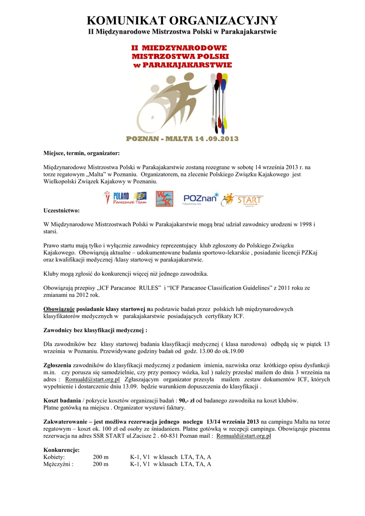 KOMUNIKAT ORGANIZACYJNY II Międzynarodowe Mistrzostwa Polski w Parakajakarstwie II MIEDZYNARODOWE MISTRZOSTWA POLSKI w PARAKAJAKARSTWIE POZNAN - MALTA 14 .09.2013 Miejsce, termin, organizator: Międzynarodowe Mistrzostwa Polski w Parakajakarstwie zostaną rozegrane w sobotę 14 września 2013 r. na torze regatowym „Malta” w Poznaniu. Organizatorem, na zlecenie Polskiego Związku Kajakowego jest Wielkopolski Związek Kajakowy w Poznaniu. Uczestnictwo: W Międzynarodowe Mistrzostwach Polski w Parakajakarstwie mogą brać udział zawodnicy urodzeni w 1998 i starsi. Prawo startu mają tylko i wyłącznie zawodnicy reprezentujący klub zgłoszony do Polskiego Związku Kajakowego. Obowiązują aktualne – udokumentowane badania sportowo-lekarskie , posiadanie licencji PZKaj oraz kwalifikacji medycznej /klasy startowej w parakajakarstwie. Kluby mogą zgłosić do konkurencji więcej niż jednego zawodnika. Obowiązują przepisy „ICF Paracanoe RULES” i “ICF Paracanoe Classification Guidelines” z 2011 roku ze zmianami na 2012 rok. Obowiązuje posiadanie klasy startowej na podstawie badań przez polskich lub międzynarodowych klasyfikatorów medycznych w parakajakarstwie posiadających certyfikaty ICF. Zawodnicy bez klasyfikacji medycznej : Dla zawodników bez klasy startowej badania klasyfikacji medycznej ( klasa narodowa) odbędą się w piątek 13 września w Poznaniu. Przewidywane godziny badań od godz. 13.00 do ok.19.00 Zgłoszenia zawodników do klasyfikacji medycznej z podaniem imienia, nazwiska oraz krótkiego opisu dysfunkcji m.in. czy porusza się samodzielnie, czy przy pomocy wózka, kul ) należy przesłać mailem do dnia 3 września na adres : [email protected] Zgłaszającym organizator przesyła mailem zestaw dokumentów ICF, których wypełnienie i dostarczenie dniu 13.09. będzie warunkiem dopuszczenia do klasyfikacji . Koszt badania / pokrycie kosztów organizacji badań : 90,- zł od badanego zawodnika na koszt klubów. Płatne gotówką na miejscu . Organizator wystawi faktury. Zakwaterowanie – jest możliwa rezerwacja jednego noclegu 13/14 września 2013 na campingu Malta na torze regatowym – koszt ok. 100 zł od osoby ze śniadaniem. Płatne gotówką w recepcji campingu. Obowiązuje pisemna rezerwacja na adres SSR START ul.Zacisze 2 . 60-831 Poznan mail : [email protected] Konkurencje: Kobiety: Mężczyźni : 200 m 200 m K-1, V1 w klasach LTA, TA, A K-1, V1 w klasach LTA, TA, A Regulaminowe Parametry Kajaków - K-1 : Max. długość 520 cm. Min. szerokość 50 cm. (pomiar na wysokości 10 cm. od dna łodzi) Min.ciężar 12 kg. Regulaminowe Parametry Kanu - V-1 : Max. długość Min.ciężar Max. długość stabilizatora 730 cm. 10 kg ( bez stabilizatora). 250 cm. Organizator nie zapewnia do dyspozycji zawodników kajaków ani kanu. Bezpieczeństwo : w klasach A bezwzględnie a we wszystkich klasach - LTA, TA i A w przypadku zawodników , którzy nie startowali w zawodach paracanoe - obowiązkowa jest kamizelka asekuracyjna ( także w czasie treningu) . Wszyscy zawodnicy, którzy nie będą startować w kamizelkach muszą podpisać oświadczenie o rezygnacji z używania kamizelki i przyjęcia odpowiedzialności z tego tytułu. Ramowy program: 13.09.2013 (piątek) Klasyfikacja medyczna 14.09.2013 r. (sobota) Przyjazd na tor do godz. 11.00 Odprawa godz. 11.30 Pomiar , ważenie łodzi . Eliminacje i finały na dystansie 200 m K1 - K i M ; V1 - K i M. Ceremonia medalowa. Program minutowy zostanie podany po odprawie. Zgłoszenia: Zgłoszenia imienne na obowiązującym druku – w załączeniu - należy wysłać na adres: Stowarzyszenie Sportowo-Rehabilitacyjne START ul.Zacisze 2 , 60-831 POZNAŃ przede wszystkim mailem [email protected] do dnia 3 września 2013. Opłaty: Za każdego zgłoszonego zawodnika 30.- PLN płatne na miejscu do kasy WZKaj. Wpłacające kluby otrzymują pokwitowanie wpłaty. Sposób przeprowadzenia regat: Konkurencja odbędzie się jeśli zgłoszonych zostanie do niej minimum czterech zawodników. W przypadku zbyt małej ilości zgłoszeń do konkurencji/klasie starty będą łączone. Tytuł i medale otrzymują zawodnicy jeśli wystartuje minimum czterech w konkurencji/ klasie przy czym zawodnik może zdecydować się na start z zawodnikami z klas o wyższej sprawności – wówczas będzie mógł walczyć o tytuł mistrzowski ( np.zawodnik klasy TA startuje w klasie LTA). Numery startowe zabezpiecza organizacja zgłaszająca – istnieje możliwość wypożyczenia u organizatora (za kaucją). System zaliczania osad do kolejnych wyścigów i finałów – zgodny z Regulaminem Wyścigów Kajakarstwa Klasycznego. Różne: Każda łódź biorąca udział w regatach powinna posiadać urządzenia chroniące ją przed zatonięciem – musi być niezatapialna. Koszty dojazdu, opłaty startowej ewent. zakwaterowania i badań klasyfikacyjnych pokrywają organizacje zgłaszające. Wszelkie informacje : Romuald Schmidt Koordynator PZKaj d.s.parakajakarstwa [email protected] , 602 61 4892