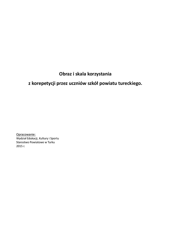 Obraz i skala korzystania z korepetycji przez uczniów szkół powiatu tureckiego. Opracowanie: Wydział Edukacji, Kultury i Sportu Starostwo Powiatowe w Turku 2015 r. Ankieta przeprowadzona była wśród młodzieży uczącej się w klasach liceum ogólnokształcącego w ilości ankietowanych: - I Liceum Ogólnokształcącym, im. Tadeusza Kościuszki w Turku - II Liceum Ogólnokształcące w Zespole Szkół Technicznych w Turku - Liceum Ogólnokształcące w Zespole Szkół Rolniczych CKP w Kaczkach Średnich W sumie przeprowadzono ankietę w ilości: - 402 - 23 - 91 - 516 Wyniki ankiety przedstawiają się następująco: 1. Liczba uczennic i uczniów posiadających orzeczenie z poradni psychologiczno-pedagogicznej: Tabela 1. Lp Nazwa szkoły Posiada orzeczenie Nie posiada orzeczenia 1 I LO 16 386 2 II LO 2 21 3 LO w Kaczkach Średnich 7 84 450 402 400 350 300 250 Liczba ankietowanych Orzeczenie lub opinia 200 Udział w % 150 91 100 50 16 23 3,98 2 8,69 7 7,69 0 I LO II LO LO w Kaczkach Śr. Wykres 1. Liczba uczennic i uczniów z opinią lub orzeczeniem Poradni Psychologiczno Padagogicznej w stosunku do liczby ankietowanych, w podziale na szkoły. W tabeli 1. przedstawiono liczbę uczennic i uczniów posiadających opinię lub orzeczenie Poradni Psychologiczno – Pedagogicznej, z której wynika, że takie orzeczenie posiada 25 uczennic i uczniów wszystkich liceów, co daje ok. 4,8% wszystkich uczniów. Szczegółowe wartości i udział procentowy przedstawione zostały na wykresie 1. Największą liczbę uczennic i uczniów z orzeczeniem uczy się w I LO – 16 (co daje 3,98%), natomiast biorąc pod uwagę procentowy udział uczniów z orzeczeniem do ogółu uczniów kształcących się w klasach liceum ogólnokształcącego, to najwięcej, bo prawie 9% uczennic i uczniów kształci się w II Liceum Ogólnokształcącym. 2. Płeć ankietowanych: Tabela 2. Lp Nazwa szkoły Kobieta Mężczyzna 1 I LO 274 128 2 II LO 12 11 3 LO w Kaczkach Średnich 50 41 Wśród wszystkich uczniów liceów większość stanowią kobiety – w sumie 65,1%. Szczegółowo liczbę kobiet i mężczyzn uczących się z liceum ogólnokształcącym, w podziela na szkoły, przedstawiono w tabeli 2. 3. Liczba uczennic i uczniów korzystających z korepetycji: Tabela 3. Lp Nazwa szkoły Korzysta Nie korzysta 1 I LO 287 115 2 II LO 14 9 3 LO w Kaczkach Średnich 48 43 350 300 287 250 200 Liczba osób korzystających z korepetycji Udział w % 150 100 71,39 60,86 50 48 52,74 14 0 I LO II LO LO w Kaczkach Śr. Wykres 2. Udział uczennic i uczniów korzystających z korepetycji, w stosunku do liczby osób ankietowanych i udział wyrażony w procentach. Z przeprowadzonych w klasach liceum ogólnokształcącego ankietach wynika, że w każdej ze szkół ponad połowa osób ankietowanych korzysta z zajęć dodatkowych w formie korepetycji i największy odsetek odnotowano w I LO, bo aż ponad 71% uczennic i uczniów kształcących się w klasach pierwszej i drugiej. W II LO jest to 60,86%, a w LO w Kaczkach Średnich jest najniższy i wyniki 52,74% osób ankietowanych. Korzystanie z korepetycji dotyczy nie tylko uczniów słabszych, ale jak to wynika m.in., z tabeli 6 i wykresu 5, wynikać to może z chęci odpowiedniego i efektywnego wykorzystania czasu przeznaczonego na przygotowanie się do egzaminu maturalnego, co nie zawsze musi być powiązane z brakiem kompetencji z danego przedmiotu lecz może dotyczyć uczniów posiadających wysokie aspiracje edukacyjne. Uczennice i uczniowie korzystający z korepetycji stają się wówczas mimowolnymi uczestnikami szeroko rozumianej rywalizacji rówieśniczej, która swój punkt kulminacyjny ma podczas rekrutacji do szkół wyższych i głównie tych, które zajmują wysokie miejsca w różnych rankingach. Nie bez znaczenia stają się takie aspekty funkcjonowania szkół, jak zdawalność egzaminu maturalnego, liczba olimpijczyków, sukcesy edukacyjne czy sportowe uczniów. Rezultatem tego niewątpliwie może być stawianie wysokich wymagań w stosunku do uczniów, pogłębiająca się rywalizacja między uczennicami i uczniami. W tej sytuacji korepetycje mogą być czynnikiem, który należy realizować, aby sprostać oczekiwaniom szkoły, których uczeń sam nie potrafi zrealizować z powodu nadmiaru treści do przyswojenia, znacznej ilości zajęć pozalekcyjnych, ograniczających czas poświęcany na odrabianie lekcji i uczenie się oraz niewątpliwie braku odpowiednich kwalifikacji bądź predyspozycji do nauczania, o czym świadczy fakt, że około 28% ankietowanych uczennic i uczniów nie rozumie materiału przerabianego na lekcjach lub wyraźnie wskazują (około 25% ankietowanych), że nauczyciele źle tłumaczą. 4. Przedmioty, z których uczennice i uczniowie korzystają z korepetycji: Tabela 4. Przedmiot I LO II LO LO w Kaczkach Średnich Matematyka 205 14 43 Chemia 81 6 4 Fizyka 15 1 1 Biologia 50 - - Geografia 1 - 3 Historia 6 - - Język polski 4 - 3 Język angielski 111 6 8 Język niemiecki 17 - 2 Język francuski 1 1 - Język łaciński 2 1 - 70 60,8 60 51 47,2 50 Matematyka Chemia 40 34,8 32,6 30 Fizyka Biologia 26,1 Język polski 20,1 20 Języki obce 12,4 10,9 10 3,7 4,4 4,3 0,9 0 0 1,1 3,3 0 0 I LO II LO LO Kaczki Śr. Wykres 3. Liczba uczennic i uczniów korzystających z korepetycji z poszczególnych przedmiotów, wyrażone w procentach. Z przeprowadzonej analizy wyników ankiet wynika, że młodzież kształcąca się z klasach liceum korzysta głównie z korepetycji z przedmiotów ścisłych. Połowa osób ankietowanych korzysta z korepetycji z matematyki. Może to być spowodowane obowiązkiem zdawania tego przedmiotu na maturze, ponieważ drugim ścisłym przedmiotem jest fizyka, a z dodatkowych zajęć z tego przedmiotu korzystają tylko pojedyncze osoby. Duża liczba korepetycji z przedmiotów ścisłych może być związana z wysokimi wymaganiami uczniów odnośnie do własnej osoby oraz oczekiwaniami ze strony rodziców, co może generować negatywne 