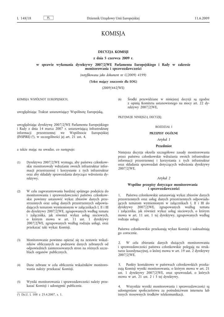 L 148/18 PL Dziennik Urzędowy Unii Europejskiej 11.6.2009 KOMISJA DECYZJA KOMISJI z dnia 5 czerwca 2009 r. w sprawie wykonania dyrektywy 2007/2/WE Parlamentu Europejskiego i Rady w zakresie monitorowania i sprawozdawczości (notyfikowana jako dokument nr C(2009) 4199) (Tekst mający znaczenie dla EOG) (2009/442/WE) KOMISJA WSPÓLNOT EUROPEJSKICH, (6) Środki przewidziane w niniejszej decyzji są zgodne z opinią Komitetu ustanowionego na mocy art. 22 dy rektywy 2007/2/WE, uwzględniając Traktat ustanawiający Wspólnotę Europejską, PRZYJMUJE NINIEJSZĄ DECYZJĘ: uwzględniając dyrektywę 2007/2/WE Parlamentu Europejskiego i Rady z dnia 14 marca 2007 r. ustanawiającą infrastrukturę informacji przestrzennej we Wspólnocie Europejskiej (INSPIRE) (1), w szczególności jej art. 21 ust. 4, a także mając na uwadze, co następuje: (1) (2) Dyrektywa 2007/2/WE wymaga, aby państwa członkow skie monitorowały wdrażanie swoich infrastruktur infor macji przestrzennej i korzystanie z tych infrastruktur oraz aby składały sprawozdania dotyczące wdrożenia dy rektywy. W celu zagwarantowania bardziej spójnego podejścia do monitorowania i sprawozdawczości państwa członkow skie powinny ustanowić wykaz zbiorów danych prze strzennych oraz usług danych przestrzennych odpowia dających tematom wymienionym w załącznikach I, II i III do dyrektywy 2007/2/WE, zgrupowanych według tematu i załącznika, jak również wykaz usług sieciowych, o którym mowa w art. 11 ust. 1 dyrektywy 2007/2/WE, zgrupowanych według rodzaju usługi, oraz przekazać taki wykaz Komisji. (3) Monitorowanie powinno opierać się na zestawie wskaź ników obliczanych na podstawie danych zebranych od odpowiednich zainteresowanych stron na różnych szcze blach organów publicznych. (4) Dane zebrane w celu obliczenia wskaźników monitoro wania należy przekazać Komisji. (5) Wyniki monitorowania i sprawozdawczości należy prze kazać Komisji i udostępnić publicznie. (1) Dz.U. L 108 z 25.4.2007, s. 1. ROZDZIAŁ I PRZEPISY OGÓLNE Artykuł 1 Przedmiot Niniejsza decyzja określa szczegółowe zasady monitorowania przez państwa członkowskie wdrażania swoich infrastruktur informacji przestrzennej i korzystania z tych infrastruktur oraz składania sprawozdań dotyczących wdrożenia dyrektywy 2007/2/WE. Artykuł 2 Wspólne przepisy dotyczące monitorowania i sprawozdawczości 1. Państwa członkowskie ustanawiają wykaz zbiorów danych przestrzennych oraz usług danych przestrzennych odpowiada jących tematom wymienionym w załącznikach I, II i III do dyrektywy 2007/2/WE, zgrupowanych według tematu i załącznika, jak również wykaz usług sieciowych, o którym mowa w art. 11 ust. 1 tej dyrektywy, zgrupowanych według rodzaju usługi. Państwa członkowskie przekazują wykaz Komisji i uaktualniają go corocznie. 2. W celu zbierania danych służących monitorowaniu i sprawozdawczości państwa członkowskie polegają na struk turze koordynacyjnej, o której mowa w art. 19 ust. 2 dyrektywy 2007/2/WE. 3. Punkty kontaktowe w państwach członkowskich przeka zują Komisji wyniki monitorowania, o którym mowa w art. 21 ust. 1 dyrektywy 2007/2/WE, oraz sprawozdań, o których mowa w art. 21 ust. 2 i 3 tej dyrektywy. 4. Wszystkie wyniki monitorowania i sprawozdawczości są udostępniane społeczeństwu za pośrednictwem internetu lub innych stosownych środków telekomunikacji. 11.6.2009 PL Dziennik Urzędowy Unii Europejskiej ROZDZIAŁ II MONITOROWANIE WDRAŻANIA WYMOGÓW DOTYCZĄ CYCH METADANYCH Artykuł 3 Monitorowanie istnienia metadanych 1. W celu określenia zakresu istnienia metadanych dla zbiorów i usług danych przestrzennych odpowiadających tematom wymienionym w załącznikach I, II i III do dyrektywy 2007/2/WE stosuje się następujące wskaźniki: a) wskaźnik ogólny (MDi1) określający istnienie metadanych dla zbiorów i usług danych przestrzennych odpowiadających tematom wymienionym w załącznikach I, II i III do dyrekty wy 2007/2/WE; b) następujące wskaźniki szczegółowe: (i) MDi1.1 określający istnienie metadanych dla zbiorów danych przestrzennych odpowiadających tematom wymienionym w załączniku I do dyrektywy 2007/2/WE; (ii) MDi1.2 określający istnienie metadanych dla zbiorów danych przestrzennych odpowiadających tematom wymienionym w załączniku II do dyrektywy 2007/2/WE; (iii) MDi1.3 określający istnienie metadanych dla zbiorów danych przestrzennych odpowiadających tematom wymienionym w załączniku III do dyrektywy 2007/2/WE; (iv) MDi1.4 określający istnienie metadanych dla usług danych przestrzennych odpowiadających tematom wymienionym w załącznikach I, II i III do dyrektywy 2007/2/WE. 2. Państwa członkowskie ustalają, dla każdego zbioru i dla każdej usługi danych przestrzennych wymienionych w wykazie, o którym mowa w art. 2 ust. 1, czy metadane istnieją oraz przypisują zbiorowi lub usłudze danych przestrzennych nastę pujące wartości: a) wartość 1 w przypadku istnienia metadanych; b) wartość 0 w przypadku braku metadanych. 3. Państwa członkowskie obliczają wskaźnik ogólny MDi1, dzieląc liczbę zbiorów i usług danych przestrzennych odpowia dających tematom wymienionym w załącznikach I, II i III do dyrektywy 2007/2/WE, dla których istnieją metadane, przez liczbę wszystkich zbiorów i usług danych przestrzennych odpo wiadających tematom wymienionym w tych załącznikach. 4. Państwa członkowskie obliczają wskaźniki szczegółowe w następujący sposób: L 148/19 a) liczba zbiorów danych przestrzennych odpowiadających tematom wymienionym w załączniku I do dyrektywy 2007/2/WE, dla których istnieją metadane, podzielona przez liczbę wszystkich zbiorów danych przestrzennych odpowiadających tematom wymienionym w tym załączniku (MDi1.1); b) liczba zbiorów danych przestrzennych odpowiadających tematom wymienionym w załączniku II do dyrektywy 2007/2/WE, dla których istnieją metadane, podzielona przez liczbę wszystkich zbioró