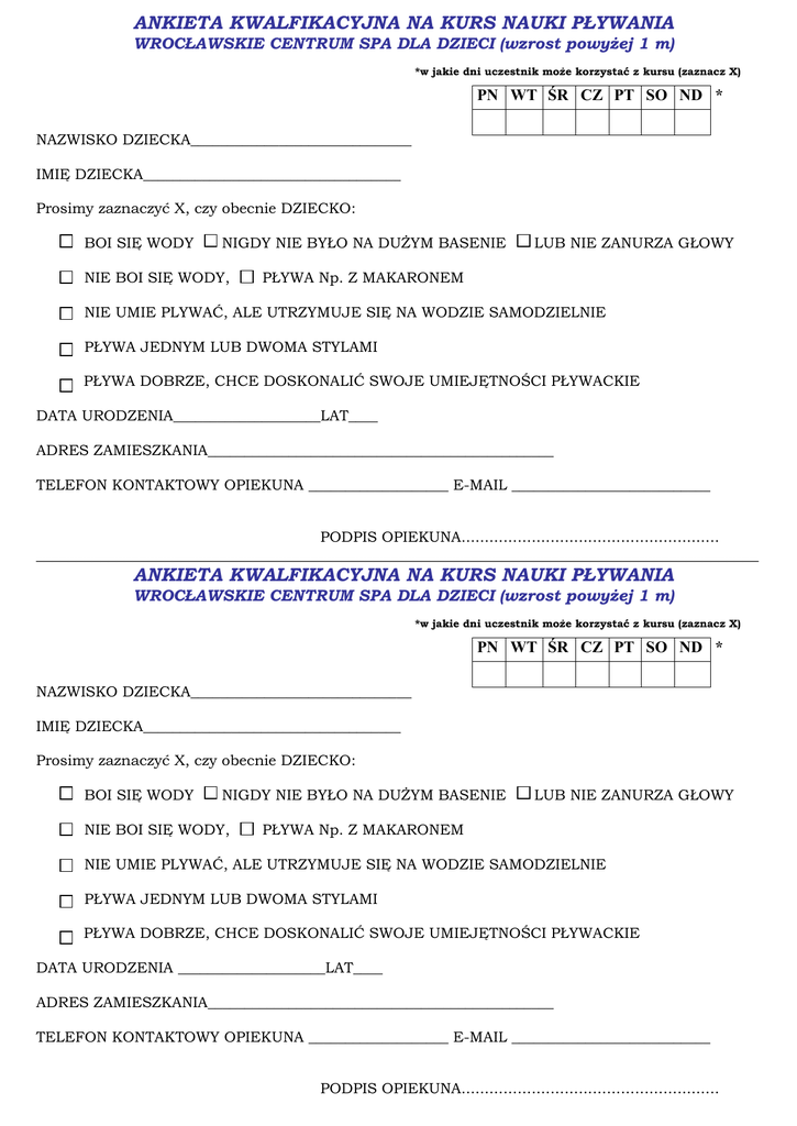 ANKIETA KWALFIKACYJNA NA KURS NAUKI PŁYWANIA WROCŁAWSKIE CENTRUM SPA DLA DZIECI (wzrost powyżej 1 m) *w jakie dni uczestnik może korzystać z kursu (zaznacz X) PN WT ŚR CZ PT SO ND * NAZWISKO DZIECKA______________________________ IMIĘ DZIECKA___________________________________ Prosimy zaznaczyć X, czy obecnie DZIECKO: BOI SIĘ WODY NIGDY NIE BYŁO NA DUŻYM BASENIE LUB NIE ZANURZA GŁOWY NIE BOI SIĘ WODY, P PŁYWA Np. Z MAKARONEM NIE UMIE PLYWAĆ, ALE UTRZYMUJE SIĘ NA WODZIE SAMODZIELNIE PŁYWA JEDNYM LUB DWOMA STYLAMI PŁYWA DOBRZE, CHCE DOSKONALIĆ SWOJE UMIEJĘTNOŚCI PŁYWACKIE DATA URODZENIA____________________LAT____ ADRES ZAMIESZKANIA_______________________________________________ TELEFON KONTAKTOWY OPIEKUNA ___________________ E-MAIL ___________________________ PODPIS OPIEKUNA....................................................... __________________________________________________________________________________________ ANKIETA KWALFIKACYJNA NA KURS NAUKI PŁYWANIA WROCŁAWSKIE CENTRUM SPA DLA DZIECI (wzrost powyżej 1 m) *w jakie dni uczestnik może korzystać z kursu (zaznacz X) PN WT ŚR CZ PT SO ND * NAZWISKO DZIECKA______________________________ IMIĘ DZIECKA___________________________________ Prosimy zaznaczyć X, czy obecnie DZIECKO: BOI SIĘ WODY NIGDY NIE BYŁO NA DUŻYM BASENIE LUB NIE ZANURZA GŁOWY NIE BOI SIĘ WODY, P PŁYWA Np. Z MAKARONEM NIE UMIE PLYWAĆ, ALE UTRZYMUJE SIĘ NA WODZIE SAMODZIELNIE PŁYWA JEDNYM LUB DWOMA STYLAMI PŁYWA DOBRZE, CHCE DOSKONALIĆ SWOJE UMIEJĘTNOŚCI PŁYWACKIE DATA URODZENIA ____________________LAT____ ADRES ZAMIESZKANIA_______________________________________________ TELEFON KONTAKTOWY OPIEKUNA ___________________ E-MAIL ___________________________ PODPIS OPIEKUNA.......................................................