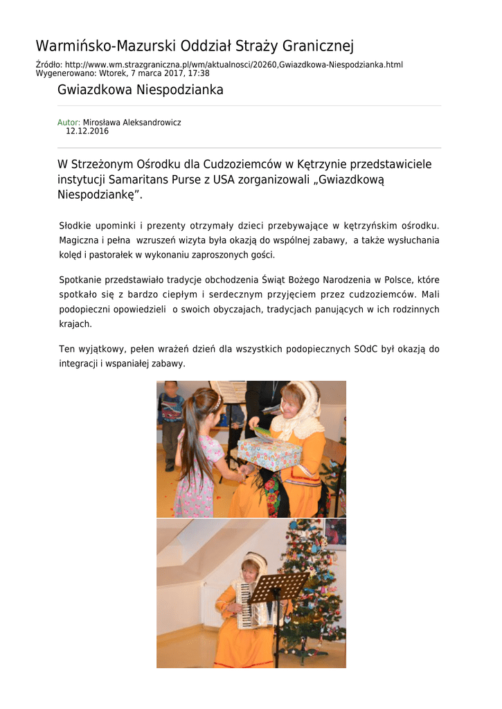 Warmińsko-Mazurski Oddział Straży Granicznej Źródło: http://www.wm.strazgraniczna.pl/wm/aktualnosci/20260,Gwiazdkowa-Niespodzianka.html Wygenerowano: Wtorek, 7 marca 2017, 17:38 Gwiazdkowa Niespodzianka Autor: Mirosława Aleksandrowicz 12.12.2016 W Strzeżonym Ośrodku dla Cudzoziemców w Kętrzynie przedstawiciele instytucji Samaritans Purse z USA zorganizowali „Gwiazdkową Niespodziankę”. Słodkie upominki i prezenty otrzymały dzieci przebywające w kętrzyńskim ośrodku. Magiczna i pełna wzruszeń wizyta była okazją do wspólnej zabawy, a także wysłuchania kolęd i pastorałek w wykonaniu zaproszonych gości. Spotkanie przedstawiało tradycje obchodzenia Świąt Bożego Narodzenia w Polsce, które spotkało się z bardzo ciepłym i serdecznym przyjęciem przez cudzoziemców. Mali podopieczni opowiedzieli o swoich obyczajach, tradycjach panujących w ich rodzinnych krajach. Ten wyjątkowy, pełen wrażeń dzień dla wszystkich podopiecznych SOdC był okazją do integracji i wspaniałej zabawy.