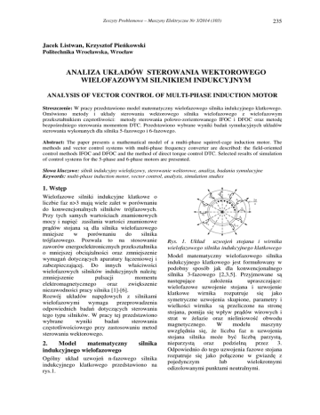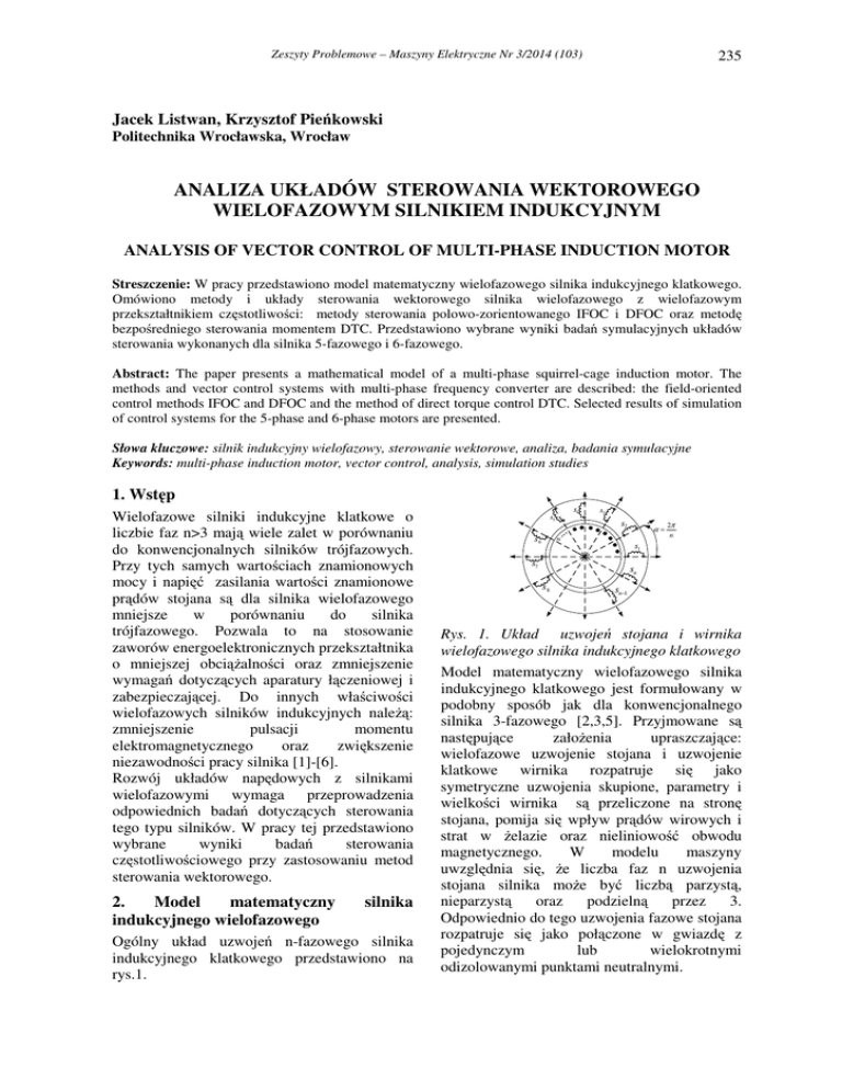 Zeszyty Problemowe – Maszyny Elektryczne Nr 3/2014 (103) 235 Jacek Listwan, Krzysztof Pieńkowski Politechnika Wrocławska, Wrocław ANALIZA UKŁADÓW STEROWANIA WEKTOROWEGO WIELOFAZOWYM SILNIKIEM INDUKCYJNYM ANALYSIS OF VECTOR CONTROL OF MULTI-PHASE INDUCTION MOTOR Streszczenie: W pracy przedstawiono model matematyczny wielofazowego silnika indukcyjnego klatkowego. Omówiono metody i układy sterowania wektorowego silnika wielofazowego z wielofazowym przekształtnikiem częstotliwości: metody sterowania polowo-zorientowanego IFOC i DFOC oraz metodę bezpośredniego sterowania momentem DTC. Przedstawiono wybrane wyniki badań symulacyjnych układów sterowania wykonanych dla silnika 5-fazowego i 6-fazowego. Abstract: The paper presents a mathematical model of a multi-phase squirrel-cage induction motor. The methods and vector control systems with multi-phase frequency converter are described: the field-oriented control methods IFOC and DFOC and the method of direct torque control DTC. Selected results of simulation of control systems for the 5-phase and 6-phase motors are presented. Słowa kluczowe: silnik indukcyjny wielofazowy, sterowanie wektorowe, analiza, badania symulacyjne Keywords: multi-phase induction motor, vector control, analysis, simulation studies 1. Wstęp Wielofazowe silniki indukcyjne klatkowe o liczbie faz n>3 mają wiele zalet w porównaniu do konwencjonalnych silników trójfazowych. Przy tych samych wartościach znamionowych mocy i napięć zasilania wartości znamionowe prądów stojana są dla silnika wielofazowego mniejsze w porównaniu do silnika trójfazowego. Pozwala to na stosowanie zaworów energoelektronicznych przekształtnika o mniejszej obciążalności oraz zmniejszenie wymagań dotyczących aparatury łączeniowej i zabezpieczającej. Do innych właściwości wielofazowych silników indukcyjnych należą: zmniejszenie pulsacji momentu elektromagnetycznego oraz zwiększenie niezawodności pracy silnika [1]-[6]. Rozwój układów napędowych z silnikami wielofazowymi wymaga przeprowadzenia odpowiednich badań dotyczących sterowania tego typu silników. W pracy tej przedstawiono wybrane wyniki badań sterowania częstotliwościowego przy zastosowaniu metod sterowania wektorowego. 2. Model matematyczny indukcyjnego wielofazowego silnika Ogólny układ uzwojeń n-fazowego silnika indukcyjnego klatkowego przedstawiono na rys.1. s4 s5 s6 s3 s2 α= n 2π n s1 s7 sn s8 sn−1 Rys. 1. Układ uzwojeń stojana i wirnika wielofazowego silnika indukcyjnego klatkowego Model matematyczny wielofazowego silnika indukcyjnego klatkowego jest formułowany w podobny sposób jak dla konwencjonalnego silnika 3-fazowego [2,3,5]. Przyjmowane są następujące założenia upraszczające: wielofazowe uzwojenie stojana i uzwojenie klatkowe wirnika rozpatruje się jako symetryczne uzwojenia skupione, parametry i wielkości wirnika są przeliczone na stronę stojana, pomija się wpływ prądów wirowych i strat w żelazie oraz nieliniowość obwodu magnetycznego. W modelu maszyny uwzględnia się, że liczba faz n uzwojenia stojana silnika może być liczbą parzystą, nieparzystą oraz podzielną przez 3. Odpowiednio do tego uzwojenia fazowe stojana rozpatruje się jako połączone w gwiazdę z pojedynczym lub wielokrotnymi odizolowanymi punktami neutralnymi. Zeszyty Problemowe – Maszyny Elektryczne Nr 3/2014 (103) 236 Model matematyczny wielofazowego silnika indukcyjnego dla zmiennych fazowych jest opisany przez równania różniczkowe o współczynnikach zmiennych w funkcji kąta obrotu wirnika. Równania o stałych współczynnikach otrzymuje się przez zastosowanie odpowiednich transformacji współrzędnych fazowych stojana i wirnika. Postać macierzy transformacyjnych jest uzależniona od liczby faz n silnika wielofazowego [2,3,5]. W ogólnym przypadku za pośrednictwem transformacji dokonuje się przekształcenia współrzędnych fazowych do składowych wyrażonych w wielu ortogonalnych układach współrzędnych i składowych zerowych. Dla nieparzystej liczby faz n otrzymuje się przekształcenie współrzędnych do składowych wyrażonych w k=(n-1)/2 układach ortogonalnych i jednej składowej zerowej, a dla parzystej liczby faz n otrzymuje się przekształcenie do składowych wyrażonych w k=(n-2)/2 układach ortogonalnych i dwóch składowych zerowych. W przemianie energii elektromechanicznej uczestniczą tylko składowe wielkości elektromagnetycznych stojana i wirnika przekształcone do podstawowego układu ortogonalnego, natomiast składowe wielkości elektromagnetycznych z pozostałych układów ortogonalnych jeśli są różne od zera, to powodują dodatkowe straty w silniku i z tych względów powinny być uwzględniane w analizie [5]. W dalszej części pracy rozpatrywany jest silnik wielofazowy o nieparzystej liczbie faz n=5 i o parzystej liczbie faz n=6. Inwariantna macierz transformacji zmiennych fazowych [C] ma następującą postać (dla silnika 5-fazowego obowiązuje część ograniczona linią przerywaną) [3]: [C ] = 2 ⋅ n (1) gdzie: α=2π/n - kąt między osiami uzwojeń fazowych silnika. Macierz [C] dokonuje transformacji n współrzędnych fazowych stojana lub wirnika do współrzędnych w układach ortogonalnych nieruchomych odpowiednio względem stojana lub wirnika: układu podstawowego α–β, układu dodatkowego x-y oraz do składowych zerowych. Współrzędne stojana i wirnika z układu podstawowego α–β są następnie transformowane przez macierz [D] do wspólnego układu podstawowego d-q, który może wirować względem stojana z dowolną prędkością kątową ω k W artykule przyjęto system oznaczeń osi odmienny od systemu stosowanego typowo w polskojęzycznej literaturze. Macierz transformacji [D] ma postać [3] (dla silnika 5-fazowego obowiązują warunki jak dla macierzy [C]): [D] = 2 ⋅ n (2) gdzie: ϑ k - kąt przyjmowany odpowiednio do tego, czy transformacja dotyczy współrzędnych stojana czy wirnika [3,5]. Równania wi