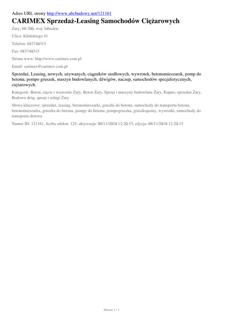 Adres URL strony http://www.abcbudowy.net/121161 CARIMEX Sprzedaż-Leasing Samochodów Ciężarowych Żary, 68-200, woj. lubuskie Ulica: Kilińskiego 41 Telefon: 683740315 Fax: 683740315 Strona www: http://www.carimex.com.pl Email: [email protected] Sprzedaż, Leasing, nowych, używanych, ciągników siodłowych, wywrotek, betonomieszarek, pomp do betonu, pompo gruszek, maszyn budowlanych, dźwigów, naczep, samochodów specjalistycznych, ciężarowych. Kategorie: Beton, cięcie i wiercenie Żary, Beton Żary, Sprzęt i maszyny budowlane Żary, Kupno, sprzedaż Żary, Budowa dróg, sprzęt i usługi Żary Słowa kluczowe: sprzedaż, leasing, betonomieszarki, gruszki do betonu, samochody do transportu betonu, betonomieszarka, gruszka do betonu, pompy do betonu, pompogruszka, gruszkopomy, wywrotki, samochody do transportu drzewa Numer ID: 121161, liczba odsłon: 125, aktywacja: 08/11/2010 12:20:15, edycja: 08/11/2010 12:20:15 Strona 1 / 1