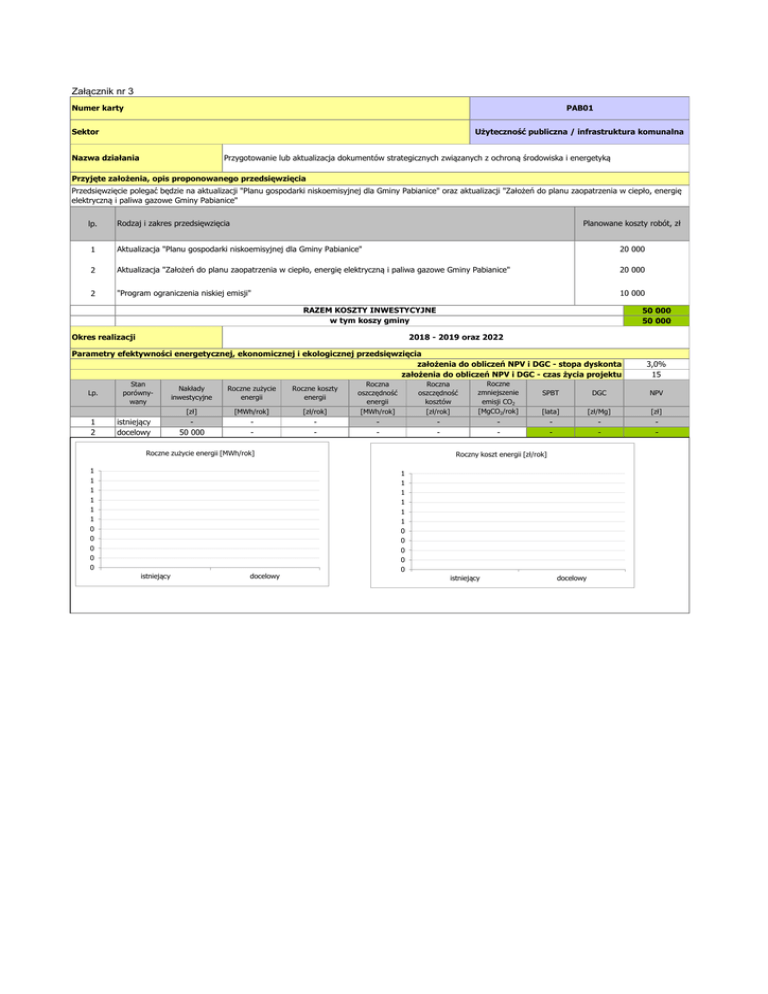 Załącznik nr 3 Numer karty PAB01 Sektor Użyteczność publiczna / infrastruktura komunalna Nazwa działania Przygotowanie lub aktualizacja dokumentów strategicznych związanych z ochroną środowiska i energetyką Przyjęte założenia, opis proponowanego przedsięwzięcia Przedsięwzięcie polegać będzie na aktualizacji "Planu gospodarki niskoemisyjnej dla Gminy Pabianice" oraz aktualizacji "Założeń do planu zaopatrzenia w ciepło, energię elektryczną i paliwa gazowe Gminy Pabianice" lp. Rodzaj i zakres przedsięwzięcia Planowane koszty robót, zł 1 Aktualizacja "Planu gospodarki niskoemisyjnej dla Gminy Pabianice" 20 000 2 Aktualizacja "Założeń do planu zaopatrzenia w ciepło, energię elektryczną i paliwa gazowe Gminy Pabianice" 20 000 2 "Program ograniczenia niskiej emisji" 10 000 RAZEM KOSZTY INWESTYCYJNE w tym koszy gminy Okres realizacji 50 000 50 000 2018 - 2019 oraz 2022 Parametry efektywności energetycznej, ekonomicznej i ekologicznej przedsięwzięcia założenia do obliczeń NPV i DGC - stopa dyskonta założenia do obliczeń NPV i DGC - czas życia projektu Lp. 1 2 Stan porównywany istniejący docelowy Roczna oszczędność kosztów [zł/rok] Roczne zmniejszenie emisji CO2 [MgCO2/rok] SPBT DGC NPV [zł/rok] Roczna oszczędność energii [MWh/rok] [lata] [zł/Mg] [zł] - - - - - - - Nakłady inwestycyjne Roczne zużycie energii Roczne koszty energii [zł] [MWh/rok] 50 000 - Roczne zużycie energii [MWh/rok] 1 1 1 1 1 1 0 0 0 0 0 istniejący docelowy 3,0% 15 Roczny koszt energii [zł/rok] 1 1 1 1 1 1 0 0 0 0 0 istniejący docelowy Numer karty PAB02 Użyteczność publiczna / infrastruktura komunalna Sektor Poprawa efektywności energetycznej oraz wykorzystanie odnawialnych źródeł energii w budynkach użyteczności publicznej oświata i administracja publiczna Nazwa działania Przyjęte założenia, opis proponowanego przedsięwzięcia Projekt zakłada modernizację energetyczną budynków użyteczności publicznej w zakresie określonym jako wariant optymalny w audycie energetycznym wykonanym odrębnie dla każdego z 6 obiektów (ocieplenie ścian, ocieplenie dachów, wymiana stolarki otworowej, modernizacja instalacji centralnego ogrzewania, modernizacja systemu ciepłej wody użytkowej, zastosowanie odnawialnych źródeł energii w tym układów PV oraz pomp ciepła itp.). Planowane koszty termomodernizacji (koszt kwalifikowany), zł Rodzaj i zakres przedsięwzięcia lp. 1 Zespół Szkolno-Przedszkolnego w Piątkowisku 2 Szkoła Podstawowa w Bychlewie 3 Szkoła Podstawowa w Pawlikowicach 4 Szkoła Podstawowa w Petrykozach 5 Przedszkole w Żytowicach 6 Urząd Gminy 7 200 000 RAZEM KOSZTY INWESTYCYJNE w tym koszy gminy Okres realizacji 7 200 000 7 200 000 2015-2018 Parametry efektywności energetycznej, ekonomicznej i ekologicznej przedsięwzięcia założenia do obliczeń NPV i DGC - stopa dyskonta założenia do obliczeń NPV i DGC - czas życia projektu Lp. 1 2 Stan porównywany istniejący docelowy Nakłady inwestycyjne Roczne zużycie energii Roczne koszty energii [zł] [MWh/rok] [zł/rok] 7 200 000 917 321 342 054 119 719 Roczna oszczędność energii [MWh/rok] Roczna oszczędność kosztów [zł/rok] 596,1 Roczne zużycie energii [MWh/rok] 1 000 900 800 700 600 500 400 300 200 100 0 222 335,1 Roczne zmniejszenie emisji CO2 [MgCO2/rok] SPBT DGC NPV [lata] [zł/Mg] [zł] 238,4 32,4 Roczny koszt energii [zł/rok] 400 000 350 000 300 000 250 000 200 000 150 000 100 000 50 000 istniejący docelowy 0 istniejący 3,0% 15 docelowy 1 597,1 -4 545 778 Numer karty PAB03 Użyteczność publiczna / infrastruktura komunalna Sektor Poprawa efektywności energetycznej oraz wykorzystanie odnawialnych źródeł energii w budynkach użyteczności publicznej ochrona zdrowia Nazwa działania Przyjęte założenia, opis proponowanego przedsięwzięcia Projekt zakłada modernizację energetyczną budynków użyteczności publicznej w zakresie określonym jako wariant optymalny w audycie energetycznym wykonanym odrębnie dla każdego z 3 budynków przy postawionych warunkach brzegowych: - konieczności zwiększenia efektywności energetycznej nie mniej niż o 25% dla każdego obiektu; - wykorzystania w jak największym stopniu OZE lp. Rodzaj i zakres przedsięwzięcia Planowane koszty robót, zł 1 Ośrodek Zdrowia w Petrykozach budynek stary 2 Ośrodek Zdrowia w Petrykozach budynek nowy 3 Ośrodek Zdrowia w Pawlikowicach 1 165 177 RAZEM KOSZTY INWESTYCYJNE w tym koszy gminy Okres realizacji 1 165 177 233 035 2015-2018 Parametry efektywności energetycznej, ekonomicznej i ekologicznej przedsięwzięcia założenia do obliczeń NPV i DGC - stopa dyskonta założenia do obliczeń NPV i DGC - czas życia projektu Lp. 1 2 Stan porównywany istniejący docelowy Nakłady inwestycyjne Roczne zużycie energii Roczne koszty energii [zł] [MWh/rok] [zł/rok] 1 165 177 122 49 28 493 10 297 Roczna oszczędność energii [MWh/rok] Roczna oszczędność kosztów [zł/rok] 73,2 Roczne zużycie energii [MWh/rok] 140 18 195,8 Roczne zmniejszenie emisji CO2 [MgCO2/rok] SPBT DGC NPV [lata] [zł/Mg] [zł] 29,3 64,0 Roczny koszt energii [zł/rok] 30 000 120 25 000 100 20 000 80 15 000 60 40 10 000 20 5 000 0 istniejący docelowy 0 istniejący 3,0% 15 docelowy 2 712,0 -947 957 Numer karty PAB04 Sektor Użyteczność publiczna / infrastruktura komunalna Nazwa działania Budowa instalacji fotowoltaicznej na terenie statcji uzdatniania wody w Żytowicach i Rydzynach Przyjęte założenia, opis proponowanego przedsięwzięcia Projekt polegać będzie na zleceniu wykonania instalacji fotowoltaicznej na terenie stacji udatniania wody w Żytowicach. Moc zainstalowana elektrowni fotowoltaicznej ma wynieść ok 20kWp na każdej Stacji, z przewidywaną roczną produkcją energii elektrycznej z instalacji PV na poziomie 19,4 MWh lp. 1 Rodzaj i zakres przedsięwzięcia Planowane koszty robót, zł Budowa instalacji fotowoltaicznej na terenie statcji uzdatniania wody w Żytowicach i Rydzynach 240 000 RAZEM