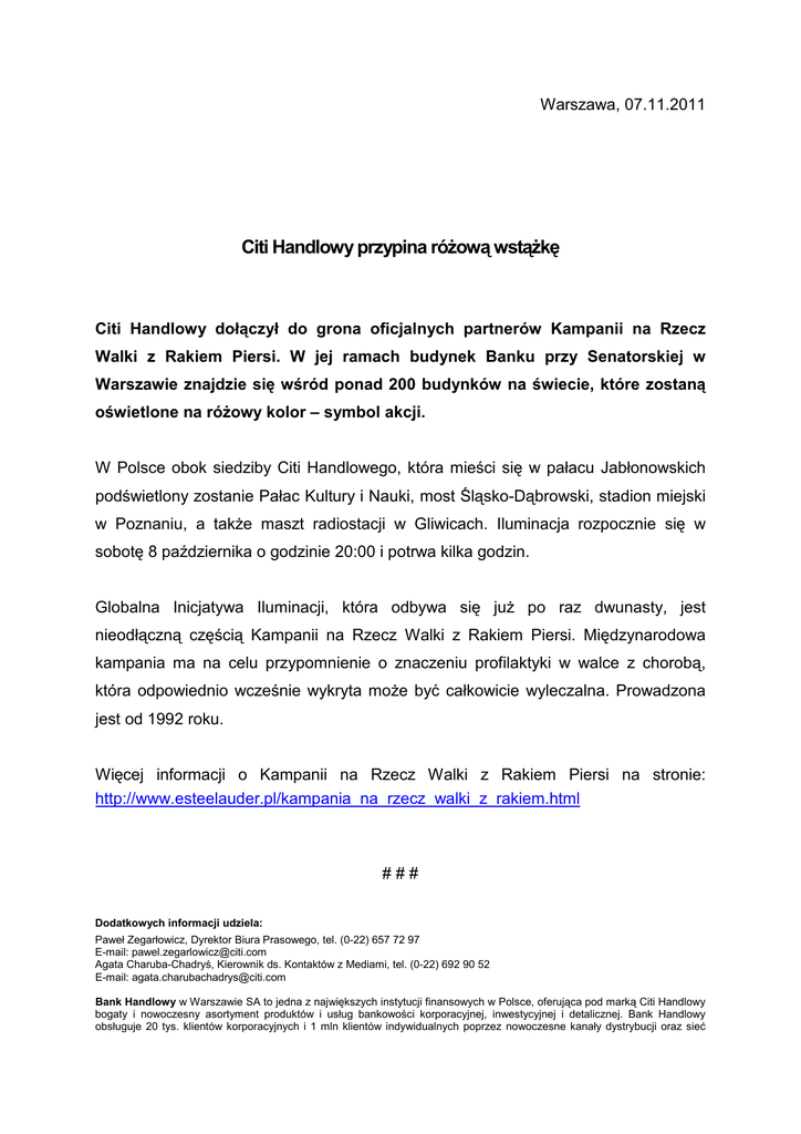 Warszawa, 07.11.2011 Citi Handlowy przypina róŜową wstąŜkę Citi Handlowy dołączył do grona oficjalnych partnerów Kampanii na Rzecz Walki z Rakiem Piersi. W jej ramach budynek Banku przy Senatorskiej w Warszawie znajdzie się wśród ponad 200 budynków na świecie, które zostaną oświetlone na róŜowy kolor – symbol akcji. W Polsce obok siedziby Citi Handlowego, która mieści się w pałacu Jabłonowskich podświetlony zostanie Pałac Kultury i Nauki, most Śląsko-Dąbrowski, stadion miejski w Poznaniu, a takŜe maszt radiostacji w Gliwicach. Iluminacja rozpocznie się w sobotę 8 października o godzinie 20:00 i potrwa kilka godzin. Globalna Inicjatywa Iluminacji, która odbywa się juŜ po raz dwunasty, jest nieodłączną częścią Kampanii na Rzecz Walki z Rakiem Piersi. Międzynarodowa kampania ma na celu przypomnienie o znaczeniu profilaktyki w walce z chorobą, która odpowiednio wcześnie wykryta moŜe być całkowicie wyleczalna. Prowadzona jest od 1992 roku. Więcej informacji o Kampanii na Rzecz Walki z Rakiem Piersi na stronie: http://www.esteelauder.pl/kampania_na_rzecz_walki_z_rakiem.html ### Dodatkowych informacji udziela: Paweł Zegarłowicz, Dyrektor Biura Prasowego, tel. (0-22) 657 72 97 E-mail: [email protected] Agata Charuba-Chadryś, Kierownik ds. Kontaktów z Mediami, tel. (0-22) 692 90 52 E-mail: [email protected] Bank Handlowy w Warszawie SA to jedna z największych instytucji finansowych w Polsce, oferująca pod marką Citi Handlowy bogaty i nowoczesny asortyment produktów i usług bankowości korporacyjnej, inwestycyjnej i detalicznej. Bank Handlowy obsługuje 20 tys. klientów korporacyjnych i 1 mln klientów indywidualnych poprzez nowoczesne kanały dystrybucji oraz sieć ponad 200 oddziałów. W skład grupy kapitałowej Banku wchodzą takie podmioty jak: Dom Maklerski Banku Handlowego i Handlowy Leasing. PrzynaleŜność do Citigroup, największej na świecie instytucji finansowej, zapewnia klientom Banku Handlowego dostęp do usług finansowych w ponad 100 krajach. Dodatkowe informacje moŜna uzyskać na stronie internetowej www.citihandlowy.pl. Citi (NYSE:C) to wiodąca globalna instytucja finansowa, mająca około 200 milionów klientów w ponad 140 krajach. Poprzez swoje dwie odrębne jednostki operacyjne: Citicorp i Citi Holdings, Citi obsługuje klientów indywidualnych, korporacyjnych, rządowych i instytucjonalnych zapewniając im bogaty wachlarz produktów i usług finansowych w zakresie bankowości detalicznej, bankowości korporacyjnej i inwestycyjnej, usług maklerskich i zarządzania aktywami. Dodatkowe informacje moŜna uzyskać na stronie internetowej www.citigroup.com lub or www.citi.com.