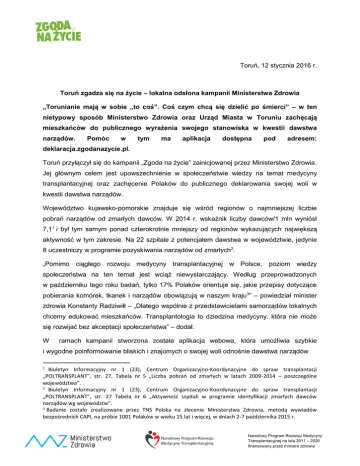 Toruń, 12 stycznia 2016 r. Toruń zgadza się na życie – lokalna odsłona kampanii Ministerstwa Zdrowia „Torunianie mają w sobie „to coś”. Coś czym chcą się dzielić po śmierci” – w ten nietypowy sposób Ministerstwo Zdrowia oraz Urząd Miasta w Toruniu zachęcają mieszkańców do publicznego wyrażenia swojego stanowiska w kwestii dawstwa narządów. Pomóc w tym ma aplikacja dostępna pod adresem: deklaracja.zgodanazycie.pl. Toruń przyłączył się do kampanii „Zgoda na życie” zainicjowanej przez Ministerstwo Zdrowia. Jej głównym celem jest upowszechnienie w społeczeństwie wiedzy na temat medycyny transplantacyjnej oraz zachęcenie Polaków do publicznego deklarowania swojej woli w kwestii dawstwa narządów. Województwo kujawsko-pomorskie znajduje się wśród regionów o najmniejszej liczbie pobrań narządów od zmarłych dawców. W 2014 r. wskaźnik liczby dawców/1 mln wyniósł 7,11 i był tym samym ponad czterokrotnie mniejszy od regionów wykazujących największą aktywność w tym zakresie. Na 22 szpitale z potencjałem dawstwa w województwie, jedynie 8 uczestniczy w programie pozyskiwania narządów od zmarłych2. „Pomimo ciągłego rozwoju medycyny transplantacyjnej w Polsce, poziom wiedzy społeczeństwa na ten temat jest wciąż niewystarczający. Według przeprowadzonych w październiku tego roku badań, tylko 17% Polaków orientuje się, jakie przepisy dotyczące pobierania komórek, tkanek i narządów obowiązują w naszym kraju3” – powiedział minister zdrowia Konstanty Radziwiłł – „Dlatego wspólnie z przedstawicielami samorządów lokalnych chcemy edukować mieszkańców. Transplantologia to dziedzina medycyny, która nie może się rozwijać bez akceptacji społeczeństwa” – dodał. W ramach kampanii stworzona została aplikacja webowa, która umożliwia szybkie i wygodne poinformowanie bliskich i znajomych o swojej woli odnośnie dawstwa narządów 1 Biuletyn Informacyjny nr 1 (23), Centrum Organizacyjno-Koordynacyjne do spraw transplantacji „POLTRANSPLANT”, str. 27, Tabela nr 5 „Liczba pobrań od zmarłych w latach 2009-2014 – poszczególne województwa”. 2 Biuletyn Informacyjny nr 1 (23), Centrum Organizacyjno-Koordynacyjne do spraw transplantacji „POLTRANSPLANT”, str. 27 Tabela nr 6 „Aktywność szpitali w programie identyfikacji zmarłych dawców narządów wg województw”. 3 Badanie zostało zrealizowane przez TNS Polska na zlecenie Ministerstwa Zdrowia, metodą wywiadów bezpośrednich CAPI, na próbie 1001 Polaków w wieku 15 lat i więcej, w dniach 2-7 października 2015 r. Narodowy Program Rozwoju Medycyny Transplantacyjnej na lata 2011 – 2020 finansowany przez ministra zdrowia po śmierci. Wystarczy wpisać swoje imię i nazwisko, a system automatycznie wygeneruje spersonalizowaną grafikę, którą udostępnić można następnie w mediach społecznościowych. Dzięki funkcji geolokalizacji przeglądarek użytkowników, aplikacja w atrakcyjny wizualnie sposób prezentuje na tzw. mapie cieplnej, skąd pochodzą osoby wyrażające „Zgodę na życie”. Narzędzie dostępne jest pod adresem deklaracja.zgodanazycie.pl. W przyszłym roku resort zdrowia przewiduje kolejne inicjatywy promujące ideę transplantologii i angażujące lokalne społeczności. W wybranych polskich miastach staną Pomniki Dawcy. Na festiwalach muzycznych oraz meczach piłkarskich rozdawane będą oświadczenia woli. Kampania „Zgoda na życie” Kampania „Zgoda na życie” potrwa do końca 2016 r. Jej celem jest upowszechnienie w społeczeństwie wiedzy na temat medycyny transplantacyjnej, zachęcenie Polaków do publicznego deklarowania swojej woli w kwestii dawstwa narządów oraz zostawania potencjalnymi dawcami szpiku kostnego. Kampania finansowana jest w ramach Narodowego Programu Rozwoju Medycyny Transplantacyjnej na lata 2011 – 2020. Więcej informacji znaleźć można na stronie www.zgodanazycie.pl. Więcej informacji udzielają: Maria Zakrzewska Fabryka Komunikacji Społecznej [email protected] (22) 616 12 17 Anna Iżyńska Fabryka Komunikacji Społecznej [email protected] (22) 616 12 17 Narodowy Program Rozwoju Medycyny Transplantacyjnej na lata 2011 – 2020 finansowany przez ministra zdrowia