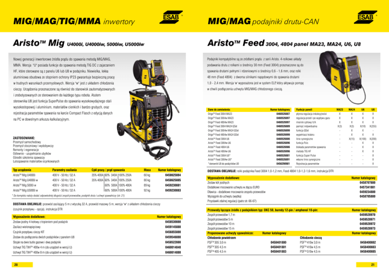 MIG/MAG/TIG/MMA inwertory MIG/MAG podajniki drutu-CAN AristoTM Mig U4000i, U4000iw, 5000iw, U5000iw AristoTM Feed 3004, 4804 panel MA23, MA24, U6, U8 Nowej generacji inwertorowe êródła pràdu do spawania metodà MIG/MAG, Podajniki kompatybilne sà ze zródłami pràdu z serii Aristo. 4-rolkowe układy MMA. Wersja "U" posiada funkcje do spawania metodà TIG DC z zajarzaniem podawania drutu z rolkami o Êrednicy 30 mm (Feed 3004) przeznaczone sà do HF, które sterowane sà z panelu U6 lub U8 w podajniku. Niewielka, lekka spawania drutami pełnymi i rdzeniowymi o Êrednicy 0,6 - 1,6 mm, oraz rolki aluminiowa obudowa ze stopniem ochrony IP23 gwarantuje bezpiecznà prac´ 48 mm (Feed 4804) z dwoma silnikami nap´dowymi do spawania drutami w trudnych warunkach przemysłowych. Wersja "w" jest z układem chłodzenia 1,0 - 2,4 mm. Wersja 'w' wyposa˝ona jest w system ELP, który aktywuje pomp´ cieczy. Urzàdzenia przeznaczone sà równie˝ do stanowisk zautomatyzowanych w chwili podłàczenia uchwytu MIG/MAG chłodzonego cieczà. i zrobotyzowanych ze sterowaniem do ka˝dego typu robota. Atutem sterownika U8 jest funkcja SuperPulse do spawania wysokowydajnego stali wysokostopowej i aluminium, materiałów cienkich i bardzo grubych, oraz Dane do zamówienia: OrigoTM Feed 3004 MA23 OrigoTM Feed 3004w MA23 OrigoTM Feed 4804w MA23 OrigoTM Feed 3004 MA24 QSet OrigoTM Feed 3004w MA24 QSet OrigoTM Feed 4804w MA24 QSet AristoTM Feed 3004 U6 AristoTM Feed 3004w U6 AristoTM Feed 4804 U6 AristoTM Feed 4804w U6 AristoTM Feed 3004 U0* AristoTM Feed 3004w U0* *sterownik U8 do podajników U0 rejestracja parametrów spawania na karcie Compact Flasch z edycjà danych na PC w dowolnym arkuszu kalkulacyjnym. ZASTOSOWANIE: Przemysł samochodowy Przemysł stoczniowy i wydobywczy Remonty i regeneracje Odlewnie - uzupełnianie ubytków OÊrodki szkolenia spawaczy Lutospawanie materiałów ocynkowanych Typ urzàdzenia Parametry zasilania Cykl pracy / pràd spawania Masa Numer katalogowy AristoTM Mig U4000i 400 V - 50 Hz / 32 A 35% 400A 60% 340A 100% 250A 60 kg 0458625884 AristoTM Mig U4000i w 400 V - 50 Hz / 32 A 35% 400A 60% 340A 100% 250A 80 kg 0458625885 AristoTM Mig 5000i w 400 V - 50 Hz / 32 A 60% 500A 100% 400A 89 kg 0459230881 AristoTM Mig U5000i w 400 V - 50 Hz / 32 A 60% 500A 100% 400A 92 kg 0459230883 * Do kompletu nale˝y dodaç odpowiedniej długoÊci zespół przewodów, podajnik drutu i uchwyt spawalniczy (str. 21) DOSTAWA OBEJMUJE: przewód zasilajàcy 5 m z wtyczkà 32 A, przewód masowy 5 m, wersja "w" z układem chłodzenia cieczy (czujnik przepływu - opcja), instrukcja DTR Wyposa˝enie dodatkowe: Numer katalogowy Zestaw jezdny 4-kołowy z trzpieniem pod podajnik 0458530880 Zasilacz wielonapi´ciowy 0459145880 Czujnik przepływu cieczy KIT 0456855880 Zestaw do podłàczenia dwóch podajników z panelem U8 0459546880 Stojak na dwie butle gazowe i dwa podajniki 0458522880 Uchwyt TIG TXHTM 400w 4 m (do urzàdzeƒ w wersji U) 0460014840 Uchwyt TIG TXHTM 400w 8 m (do urzàdzeƒ w wersji U) 0460014880 20 Numer katalogowy 0460526887 0460526897 0460526997 0460526889 0460526899 0460526999 0460526886 0460526896 0460526986 0460526996 0460526881 0460526891 0456290981 Funkcje paneli płynna regulacja indukcyjnoÊci regulacja przed i po wypływu gazu miernik cyfrowy V/A pami´ç indywidualna funkcja QSet wypełniacz krateru linie synergiczne funkcja Puls blokada parametrów spawania metoda TIG HF funkcja Super Pulse własne linie synergiczne Rejestracja parametrów MA23 X X X X(3) - - - - - - - - - MA24 X X X X(3) X X X(15) - - - - - - U6 U8 X X X X X X X(10) X(255) X X X X(100) X(200) X X X X X X - X - X - X Dostawa obejmuje: rolki podajnika Feed 3004 1,0-1,2 mm, Feed 4804 1,0-1,2-1,6 mm, instrukcja DTR Wyposa˝enie dodatkowe: Zestaw kół jezdnych Dodatkowe mocowanie uchwytu w złàczu EURO Dławica - dodatkowe mocowanie zespołu przewodów Wysi´gnik do uchwytu (w´dka) Przystawki zdalnej regulacji (patrz str. 66-67) Numer katalogowy 0458707880 0457341881 0459234880 0458705880 Przewody łàczàce êródło z podajnikiem typ: OKC 50, burndy 12-pin / amphenol 10-pin: Zespół przewodów 1,7 m Zespół przewodów 5 m Zespół przewodów 10 m Zespół przewodów 15 m Proponowane uchwyty spawalnicze: Numer katalogowy Ch∏odzenie powietrzem Ch∏odzenie cieczà 0458401880 PSFTM 410w 3,0 m PSFTM 305 3,0 m 0458401881 PSFTM 410w 4,5 m PSFTM 305 4,5 m 0458401883 PSFTM 510w 4,5 m PSFTM 405 4,5 m Numer katalogowy 0459528970 0459528971 0459528972 0459528973 Numer katalogowy 0458400882 0458400883 0458400885 21