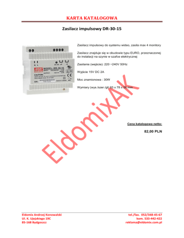 KARTA KATALOGOWA Zasilacz impulsowy DR-30-15 Zasilacz impulsowy do systemu wideo, zasila max 4 monitory Zasilacz znajduje się w obudowie typu EURO, przeznaczonej do instalacji na szynie w szafce elektrycznej Zasilanie (wejście): 220 ~240V 50Hz Wyjście 15V DC 2A Moc znamionowa : 30W Wymiary (wys./szer./gł) 93 x 78 x 56 mm Cena katalogowa netto: 82,00 PLN Eldomix Andrzej Konowalski Ul. K. Ujejskiego 19C 85-168 Bydgoszcz tel./fax. 052/348-45-67 kom. 533-442-422 [email protected]