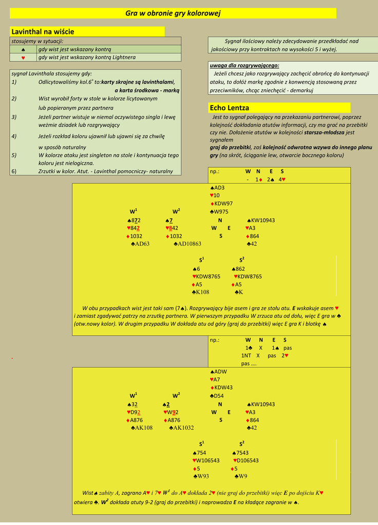 Gra w obronie gry kolorowej Lavinthal na wiście stosujemy w sytuacji: gdy wist jest wskazany kontrą gdy wist jest wskazany kontrą Lightnera Sygnał ilościowy należy zdecydowanie przedkładać nad jakościowy przy kontraktach na wysokości 5 i wyżej. uwaga dla rozgrywającego: Jeżeli chcesz jako rozgrywający zachęcić obrońcę do kontynuacji ataku, to dołóż markę zgodnie z konwencją stosowaną przez przeciwników, chcąc zniechęcić - demarkuj sygnał Lavinthala stosujemy gdy: 1) Odlicytowaliśmy kol.6+ to:karty skrajne są lavinthalami, a karta środkowa - marką 2) Wist wyrobił forty w stole w kolorze licytowanym lub popieranym przez partnera Echo Lentza 3) Jeżeli partner wistuje w niemal oczywistego singla i lewę weżmie dziadek lub rozgrywający 4) Jeżeli rozkład koloru ujawnił lub ujawni się za chwilę Jest to sygnał polegający na przekazaniu partnerowi, poprzez kolejność dokładania atutów informacji, czy ma grać na przebitki czy nie. Dołożenie atutów w kolejności starsza-młodsza jest sygnałem graj do przebitki, zaś kolejność odwrotna wzywa do innego planu gry (na skrót, ściąganie lew, otwarcie bocznego koloru) 5) 6) w sposób naturalny W kolorze ataku jest singleton na stole i kontynuacja tego koloru jest nielogiczna. Zrzutki w kolor. Atut. - Lavinthal pomocniczy- naturalny W1 872 ♥842 1032 ♣AD63 np.: W2 7 ♥842 1032 ♣AD10863 AD3 ♥10 KDW97 ♣W975 N W E S S1 6 ♥KDW8765 A5 ♣K108 W N - 1 E 2 S 4♥ KW10943 ♥A3 864 ♣42 S2 862 ♥KDW8765 A5 ♣K W obu przypadkach wist jest taki sam (7 ). Rozgrywający bije asem i gra ze stołu atu. E wskakuje asem ♥ i zamiast zgadywać patrzy na zrzutkę partnera. W pierwszym przypadku W zrzuca atu od dołu, więc E gra w ♣ (otw.nowy kolor). W drugim przypadku W dokłada atu od góry (graj do przebitki) więc E gra K i blotkę np.: W1 32 ♥D92 A876 ♣AK108 W2 2 ♥W92 A876 ♣AK1032 ADW ♥A7 KDW43 ♣D54 N W E S S1 754 ♥W106543 5 ♣W93 W N E S 1♣ X 1 pas 1NT X pas 2♥ pas …. KW10943 ♥A3 864 ♣42 S2 7543 ♥D106543 5 ♣W9 Wist zabity A, zagrano A♥ i 7♥ W1 do A♥ dokłada 2♥ (nie graj do przebitki) więc E po dojściu K♥ otwiera ♣. W2 dokłada atuty 9-2 (graj do przebitki) i naprowadza E na kładące zagranie w .