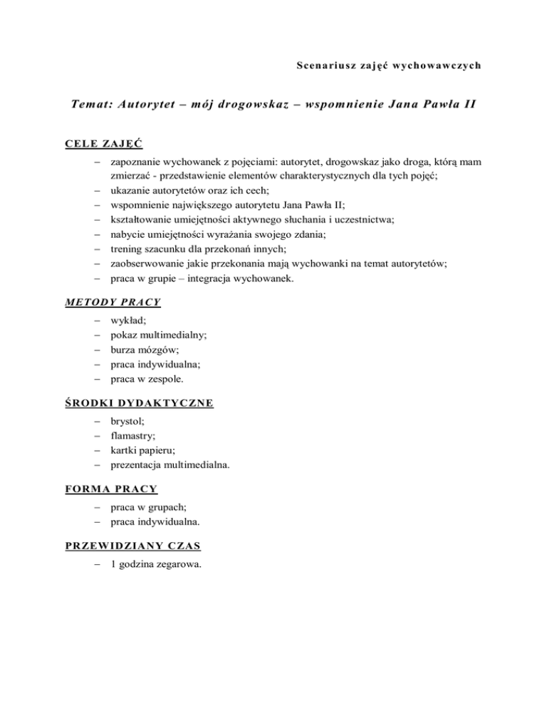 Scenariu sz zaj ęć wychowawczych Temat: Autorytet – mój drogowskaz – wspomnienie Jana Pawła II CELE ZAJ ĘĆ − zapoznanie wychowanek z pojęciami: autorytet, drogowskaz jako droga, którą mam zmierzać - przedstawienie elementów charakterystycznych dla tych pojęć; − ukazanie autorytetów oraz ich cech; − wspomnienie największego autorytetu Jana Pawła II; − kształtowanie umiejętności aktywnego słuchania i uczestnictwa; − nabycie umiejętności wyrażania swojego zdania; − trening szacunku dla przekonań innych; − zaobserwowanie jakie przekonania mają wychowanki na temat autorytetów; − praca w grupie – integracja wychowanek. METODY PRACY − − − − − wykład; pokaz multimedialny; burza mózgów; praca indywidualna; praca w zespole. ŚRODK I DYDAK TYCZNE − − − − brystol; flamastry; kartki papieru; prezentacja multimedialna. FORMA PRACY − praca w grupach; − praca indywidualna. PRZEW IDZIANY CZAS − 1 godzina zegarowa. SCENARIUSZ ZAJĘĆ WP ROWADZENIE DO TEMATU Młody człowiek, który wchodzi w wiek dorastania, napotyka wiele problemów i dylematów. Często też nie wie, którą z dróg wybrać aby czynić dobro wobec innych ludzi, dlatego też szuka drogowskazów życia – autorytetów. We współczesnym świecie trudno czasem znaleźć dobry wzór do naśladowania i większość młodych ludzi ma z tym problem. Pierwszym autorytetem jest oczywiście zawsze rodzic i to na nim dziecko się wzoruje, zazwyczaj robiąc to zupełnie nieświadomie. Kiedy jednak rodzic przestaje być autorytetem, co się czasem dzieje na skutek konfliktu pokoleń, lub z powodu złego traktowania dzieci przez rodziców, młody człowiek często szuka innego, bardziej wiarygodnego wzoru do naśladowania. Potrzeba naśladownictwa tkwi głęboko w ludzkiej naturze, szczególnie w naturze człowieka dojrzewającego, młodego, poszukującego. Takie szukanie wzorców - autorytetów nosi różne nazwy: „inspiracja”, „odwzorowanie”, „kopiowanie”, „odtwarzanie”. Młody człowiek szuka autorytetów i chce powierzyć siebie drugiemu człowiekowi, którego uzna za osobę szczególnie wartościową. Bywa tak, że ta potrzeba zaufania prowadzi do pomyłek, fałszywych wyborów życiowych i rozczarowań. Pokładane nadzieje nie spełniają się, co wówczas może doprowadzić do zniechęcenia i wycofania. Autorytet jest potrzebny każdemu młodemu człowiekowi by mógł uczyć się i wzorować na innych, ażeby zwiększać własną wartość oraz stawać się lepszym człowiekiem. Młodzież często poddaje się ogólnym trendom by nie odstawać od większości, lecz tak naprawdę wiele osób, przynajmniej czasami, odczuwa brak autorytetu, mistrza, a zarazem nauczyciela, na którego mogłoby się powołać lub którego mogłoby zapytać o radę. Kim więc jest autorytet? Jakie cechy musi posiadać? ĆWICZENIE 1 Portret autorytetu Dzielę wychowanki na dwie grupy, każda grupa dostaje arkusz papieru, na którym rysuje kontur człowieka. Wychowanki wpisują w kontur te cechy, które według nich posiada autorytet. Następnie prace zostają przymocowane do ściany i zaprezentowane przez przedstawicieli grup. ĆWICZENIE 2 Arku sze „Moje autorytet y” Uczestnicy indywidualnie wypełniają otrzymane arkusze ,,Moje Autorytety”: Moim autorytetem, jest........................................................................................................ Podziwiam w nim/ w niej .................................................................................................... Najbardziej podoba mi się w nim/ w niej ............................................................................. Myślę, że ta osoba posiada takie cechy, jak: ....................................................... Po zakończeniu zadania wychowanki na kartce brystolu wypełniają tabele z jednej strony wpisują osoby, które wybrały za swój życiowy autorytet z drugiej zaś wypisują cechy swojego autorytetu. Po wypisaniu, wychowanki wspólnie dyskutują na temat autorytetów, które podały. ĆWICZENIE 3 Piram ida wartości Pytam wychowanki kto jest największym autorytetem dla każdego Polaka i dlaczego? Proszę dziewczęta o indywidualnie wypełnienie piramidy wartości. Omawiamy wspólnie cechy, które przypisały wychowanki Janowi Pawłowi II. Po omówieniu zapraszam wychowanki do obejrzenia specjalnie przygotowanej prezentacji. Podsumowanie Refleksje końcowe wychowawcy i wychowanek na temat właściwego wyboru autorytetów w życiu. Pytam czy warto szukać autorytetu? Czy poradzą sobie z wyborem odpowiedniej osoby na autorytet?. Pytam wychowanki co dały im dzisiejsze zajęcia co się podobało, a co nie. Oceniam indywidualnie za udział w zajęciach. Autor scenariu sza Paulina Czepek wychowawca grupy VIII