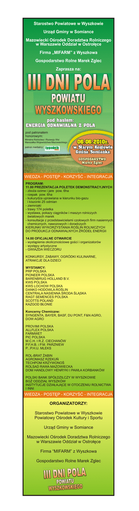 Starostwo Powiatowe w Wyszkowie Urząd Gminy w Somiance Mazowiecki Ośrodek Doradztwa Rolniczego w Warszawie Oddział w Ostrołęce Firma „MIFARM” z Wyszkowa Gospodarstwo Rolne Marek Zglec Zaprasza na: III DNI POLA POWIATU WYSZKOWSKIEGO pod hasłem: ENERGIA ODNAWIALNA Z POLA pod patronatem honorowym: Ministra Rolnictwa i Rozwoju Wsi Marszałka Województwa Mazowieckiego 06.06.2010r. w Starym Kozłowie Gmina Somianka patron medialny: GOSPODARSTWO Marka Zglec WIEDZA - POSTĘP - KORZYŚĆ - INTEGRACJA PROGRAM: 11.00 PREZENTACJA POLETEK DEMONSTRACYJNYCH - zboża ozime i jare pow. 6ha - rzepak pow. 6ha - kukurydza uprawiana w kierunku bio-gazu i kiszonki 25 odmian - ziemniaki - trawy 174 poletka - wystawa, pokazy ciągników i maszyn rolniczych światowych marek - konsultacje z przedstawicielami czołowych firm nasiennych, chemicznych, nawozowych i doradczych KIERUNKI WYKORZYSTANIA ROŚLIN ROLNICZYCH DO PRODUKCJI ODNAWIALNYCH ŹRÓDEŁ ENERGII 14.00 OFICJALNE OTWARCIE - wystąpienia okolicznościowe gości i organizatorów - występy artystyczne - GWIAZDA WIECZORU KONKURSY, ZABAWY, OGRÓDKI KULINARNE, ATRAKCJE DLA DZIECI WYSTAWCY: PRP POLSKA PIONEER POLSKA BARENBRUG HOLLAND B.V. KWS POLSKA KWS LOCHOW POLSKA DANKO HODOWLA ROŚLIN CENTRALA NASIENNA ŚRODA ŚLĄSKA RAGT SEMENCES POLSKA SCOTTS POLAND KAZGOD BŁONIE Koncerny Chemiczne: SYNGENTA, BAYER, BASF, DU PONT, F&N AGRO, DOW AGRO PROVIMI POLSKA ALLFLEX POLSKA FARMWET PIC POLSKA M.C.H. I R.Z. CIECHANÓW P.F.H.B. i P.M. PARZNIEW P...P.H.U. MLEKS ROL-BRAT ŻABIN AGROMASZ RZEKUŃ TECHPOM KRZYWONOŚ ROLSAD RAWA MAZOWIECKA DOM HANDLOWY HENRYKI I PAWŁA KORBANKÓW POLSKI BANK SPÓŁDZILCZY W WYSZKOWIE BGŻ ODDZIAŁ WYSZKÓW INSTYTUCJE DZIAŁAJĄCE W OTOCZENIU ROLNICTWA I INNI WIEDZA - POSTĘP - KORZYŚĆ - INTEGRACJA ORGANIZATORZY: Starostwo Powiatowe w Wyszkowie Powiatowy Ośrodek Kultury i Sportu Urząd Gminy w Somiance Mazowiecki Ośrodek Doradztwa Rolniczego w Warszawie Oddział w Ostrołęce Firma “MIFARM” z Wyszkowa Gospodarstwo Rolne Marek Zglec III DNOWIIAPTUOLA P WYSZKOWSKIEGO