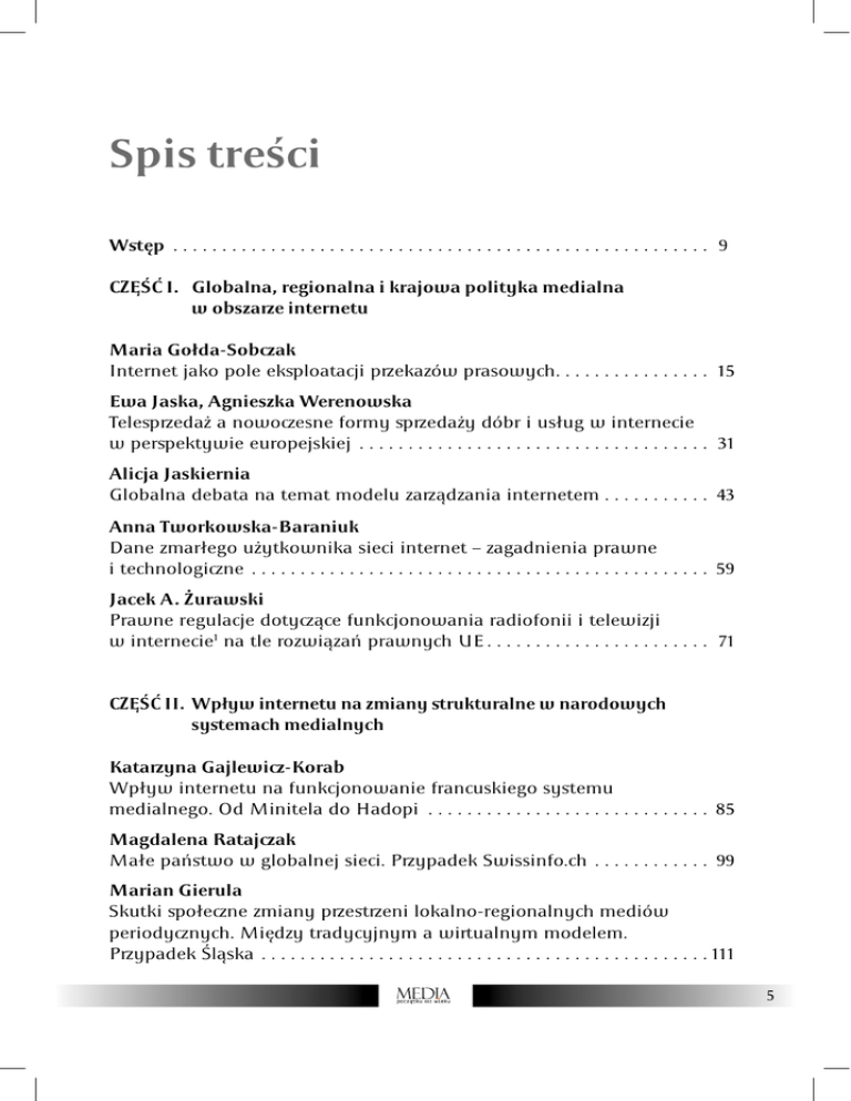 Spis treści Wstęp . . . . . . . . . . . . . . . . . . . . . . . . . . . . . . . . . . . . . . . . . . . . . . . . . . . . . . . 9 CZĘŚĆ I. Globalna, regionalna i krajowa polityka medialna w obszarze internetu Maria Gołda-Sobczak Internet jako pole eksploatacji przekazów prasowych. . . . . . . . . . . . . . . . 15 Ewa Jaska, Agnieszka Werenowska Telesprzedaż a nowoczesne formy sprzedaży dóbr i usług w internecie w perspektywie europejskiej . . . . . . . . . . . . . . . . . . . . . . . . . . . . . . . . . . . . 31 Alicja Jaskiernia Globalna debata na temat modelu zarządzania internetem . . . . . . . . . . . 43 Anna Tworkowska-Baraniuk Dane zmarłego użytkownika sieci internet – zagadnienia prawne i technologiczne . . . . . . . . . . . . . . . . . . . . . . . . . . . . . . . . . . . . . . . . . . . . . . . 59 Jacek A. Żurawski Prawne regulacje dotyczące funkcjonowania radiofonii i telewizji w internecie1 na tle rozwiązań prawnych UE . . . . . . . . . . . . . . . . . . . . . . . 71 CZĘŚĆ II. Wpływ internetu na zmiany strukturalne w narodowych systemach medialnych Katarzyna Gajlewicz-Korab Wpływ internetu na funkcjonowanie francuskiego systemu medialnego. Od Minitela do Hadopi . . . . . . . . . . . . . . . . . . . . . . . . . . . . . 85 Magdalena Ratajczak Małe państwo w globalnej sieci. Przypadek Swissinfo.ch . . . . . . . . . . . . 99 Marian Gierula Skutki społeczne zmiany przestrzeni lokalno-regionalnych mediów periodycznych. Między tradycyjnym a wirtualnym modelem. Przypadek Śląska . . . . . . . . . . . . . . . . . . . . . . . . . . . . . . . . . . . . . . . . . . . . . . 111 5 Jacek Sobczak, Ksenia Kakareko Przekazy internetowe w systemie prasowym Tadżykistanu . . . . . . . . . . 123 Zbigniew Oniszczuk Internetowa aktywność niemieckich wydawców prasowych jako czynnik zmian systemowych . . . . . . . . . . . . . . . . . . . . . . . . . . . . . . . 145 Radosław Sajna Rewolucja cyfrowa w Hispanoameryce – internet jako spoiwo systemów medialnych państw hiszpańskojęzycznych. . . . . . . . . . . . . . . 155 Tomasz Fraszczyk Półtora roku po zamknięciu mediów publicznych (ERT) w Grecji – czwarty, „samorządny” model medialny czy powrót do przeszłości i niespełnione obietnice?. . . . . . . . . . . . . . . . . . . . . . . . . . . . . . . . . . . . . . . 165 Ryszarda Stasiak Wpływ internetu na system prasowy w Szwecji. . . . . . . . . . . . . . . . . . . 183 Zbigniew Bednarek Internet (między)narodowy od zimnej wojny do cyberterroryzmu. . . . 193 CZĘŚĆ III. Aspekty polityczne i społeczne rozwoju internetu Marta Brzezińska-Waleszczyk Seksualizacja dzieci. Szkodliwa dostępność pornografii w sieci oraz metody przeciwdziałania. Na podstawie działań Stowarzyszenia „Twoja Sprawa” w latach 2008–2013 . . . . . . . . . . . . . . . . . . . . . . . . . . . . . 207 Michalina Guzikowska Facebook jako narzędzie internetowego aktywizmu w Palestynie i Egipcie . . . . . . . . . . . . . . . . . . . . . . . . . . . . . . . . . . . . . . . . . . . . . . . . . . . . . 219 Beata Ociepka Wpływ internetu na wykorzystanie mediów w polityce zagranicznej . . . 233 CZĘŚĆ IV. Wpływ internetu na zmiany w dziennikarstwie Maja Chacińska Internet a misja szwedzkich mediów publicznych (SVT) w ofercie dla dzieci . . . . . . . . . . . . . . . . . . . . . . . . . . . . . . . . . . . . . . . . . . . . . . . . . . . . 247 6 Michał Głowacki, Michał Kuś Internet w służbie odpowiedzialności? Analiza wybranych praktyk w mediach online. . . . . . . . . . . . . . . . . . . . . . . . . . . . . . . . . . . . . . . . . . . . . 259 Paweł Wiater Wpływ internetu na powstanie i rozwój dziennikarstwa obywatelskiego na świecie . . . . . . . . . . . . . . . . . . . . . . . . . . . . . . . . . . . . . 271 Paweł Wieczorek Dziennikarz profesjonalny czy obywatelski? Przyszłość zawodu w wirtualnym newsroomie. . . . . . . . . . . . . . . . . . . . . . . . . . . . . . . . . . . . . 279 Agnieszka Wrońska Dziennikarze i blogerzy jako uzupełniające się środowiska tworzące treści. . . . . . . . . . . . . . . . . . . . . . . . . . . . . . . . . . . . . . . . . . . . . . . . . . . . . . . . 289 CZĘŚĆ V. Wpływ internetu na rozwój nowych form medialnych Karolina Adamska, Anna Nestoruk „W Punkt” – pierwszy w Polsce mobilny magazyn społeczno-kulturalny . . . . . . . . . . . . . . . . . . . . . . . . . . . . . . . . . . . . . . . . . . 305 Dagmara Głuszek-Szafraniec Cybermedia w Kraju Basków, Katalonii i Galicii – przestrzeń dla dziennikarstwa zaangażowanego . . . . . . . . . . . . . . . . . . . . . . . . . . . . . 317 Łukasz Goniak Tradycja w zderzeniu z rewolucją cyfrową, czyli jak belgijski „Le Soir” radzi sobie w dobie nowych mediów. Studium przypadku . . . 329 Krzysztof Wasilewski „Huffington Post” i „OhmyNews” – analiza porównawcza dwóch globalnych dzienników internetowych . . . . . . . . . . . . . . . . . . . . . . . . . . . 347 Krzysztof Kowalik Serwisy społecznościowe oraz komunikacyjna mobilność jako czynniki kreujące nowe zasady działania instytucji medialnych i pozamedialnych . . . . . . . . . . . . . . . . . . . . . . . . . . . . . . . . . . . . . . . . . . . . . 361 7